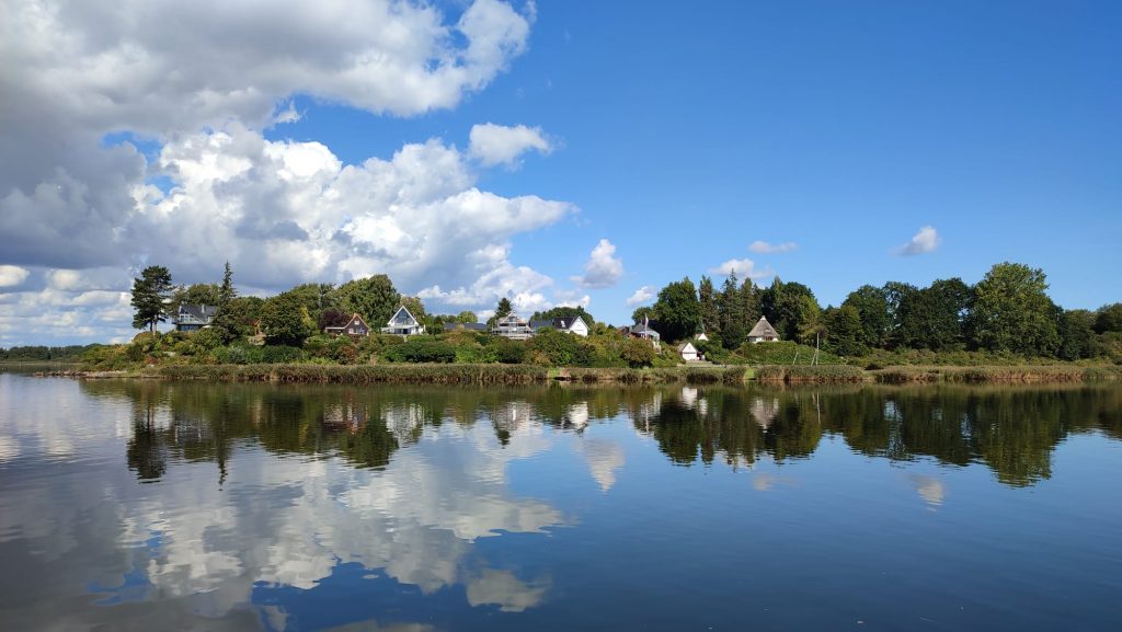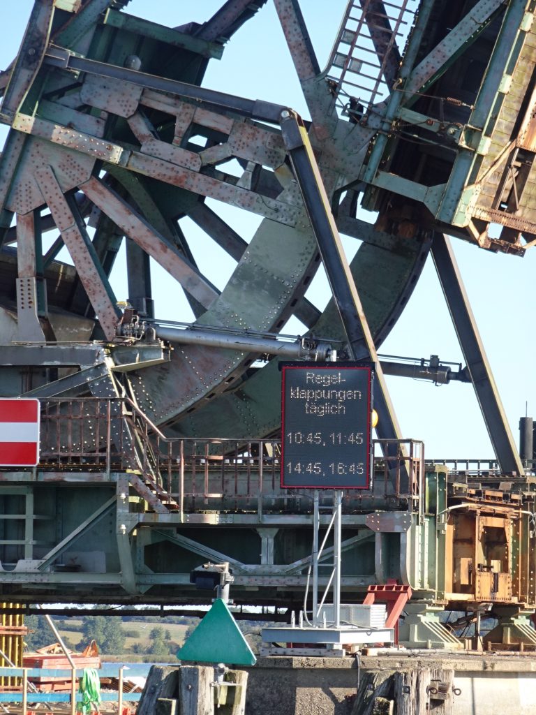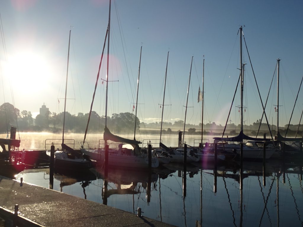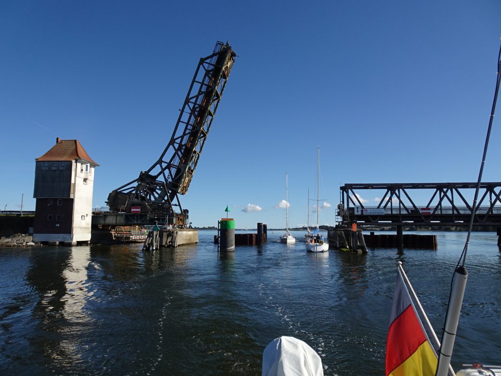 Der Mittwoch (21.09.) begrüßt uns nach einer herbstlich kalten Nacht – nur 6°C – mit strahlender Sonne und wabernden Nebelschwaden über der Schlei. Doch schon nach kurzer Zeit sind diese verschwunden und es kündigt sich ein schöner Tag an. Pünktlich zur verabredeten Zeit erscheinen unsere Gäste am Schiff 🫡 – mit leckeren Brötchen für unterwegs – und nach einer kurzen Einweisung legen wir ab. Die Schlei präsentiert sich heute als ideales Gewässer für Boots-Neulinge und attraktives Fotomotiv. Und auch die Brücke bei Lindaunis, die zweite unserer „Frühjahrs-Trauma-Brücken“, öffnet pünktlich. Da fällt uns schon ein Stein vom Herzen, denn die offizielle Öffnungszeit hat uns die Bahn (als Eigentümer der Brücke) mit 11.30h mitgeteilt, an der Brücke gibt es allerdings eine Infotafel, die 11.45h als nächste Öffnungszeit anzeigt??? Das zum Thema Verlässlichkeit und Kundeninformation der Bahn. Die Brücke öffnet dann um 11.30h. Da soll einer schlau draus werden. Wer sich also an der Infotafel orientiert, hat Pech, denn die Brücke bleibt nur max. 15min. geöffnet bzw. auch kürzer, wenn keine Schiffe mehr davor warten.