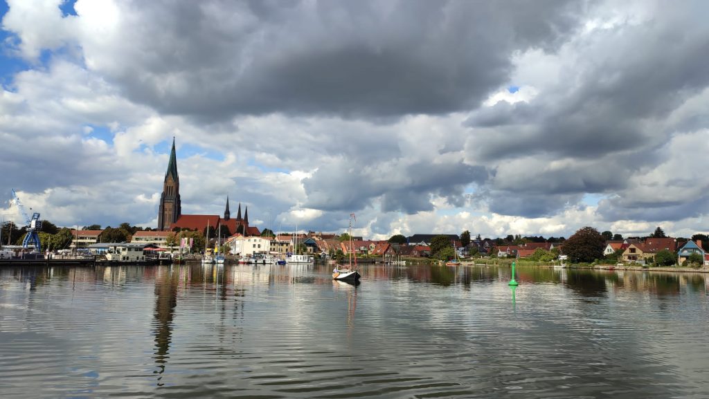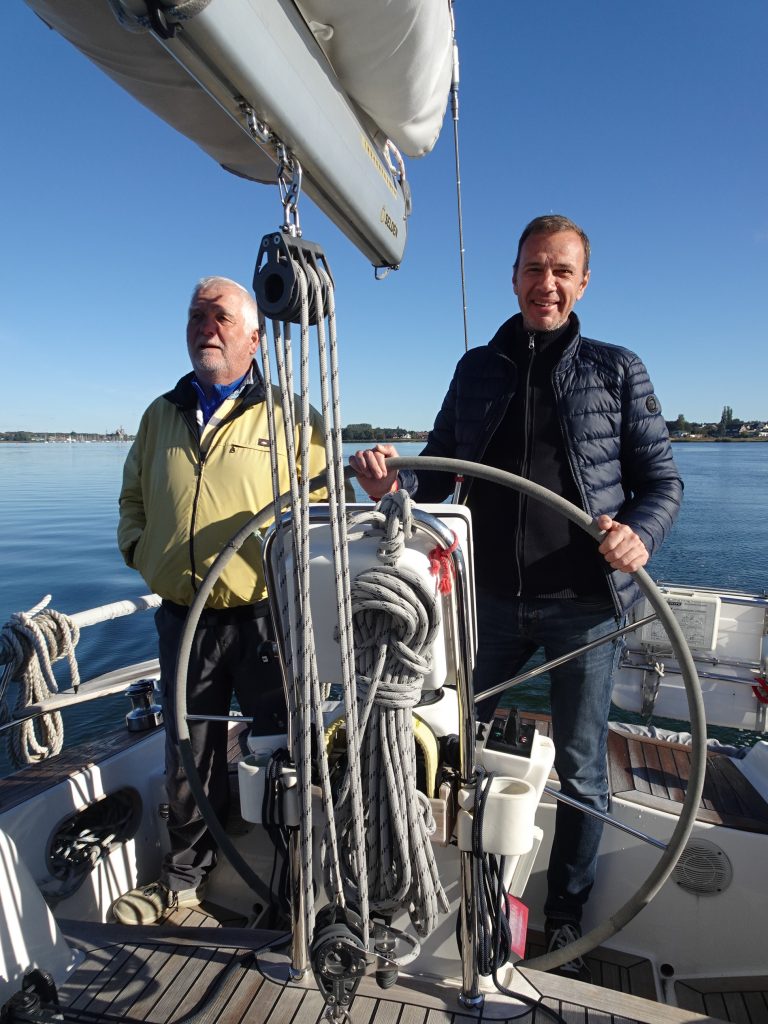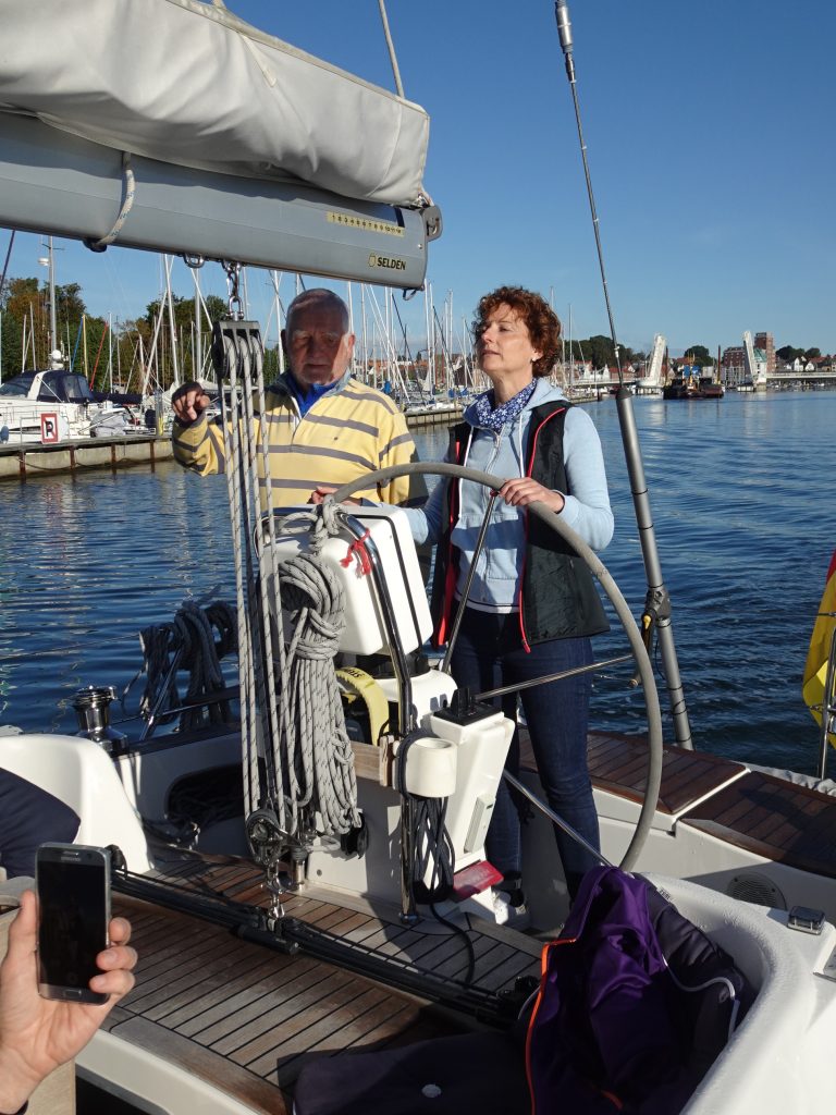 Unsere beiden Gäste fühlen sich offensichtlich an Bord recht wohl, jedenfalls trauen sie sich auch mal hinters Ruder. Sehr praktisch, da brauchen wir nicht steuern 😜… nur aus der Ferne etwas mit aufpassen🧐. Nach gemütlichen und unterhaltsamen 4,5 Stunden erreichen wir Schleswig und finden einen passenden Liegeplatz im Stadthafen. Die Gastcrew hilft sogar perfekt beim anlegen – den achterlichen Dalben fangen und Fender raus etc. – und hat sich den Einlaufdrink redlich verdient. Schön war’s!