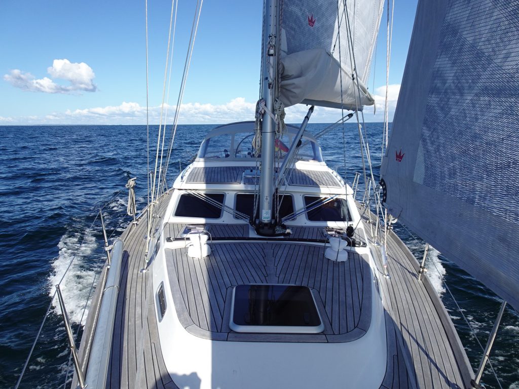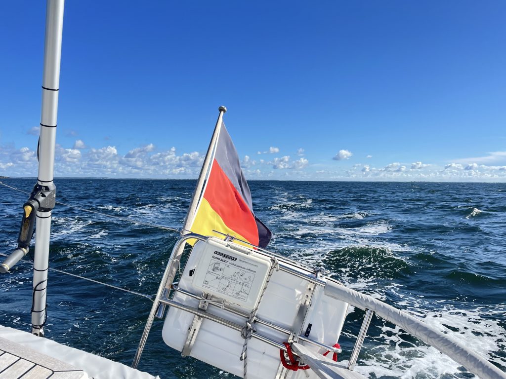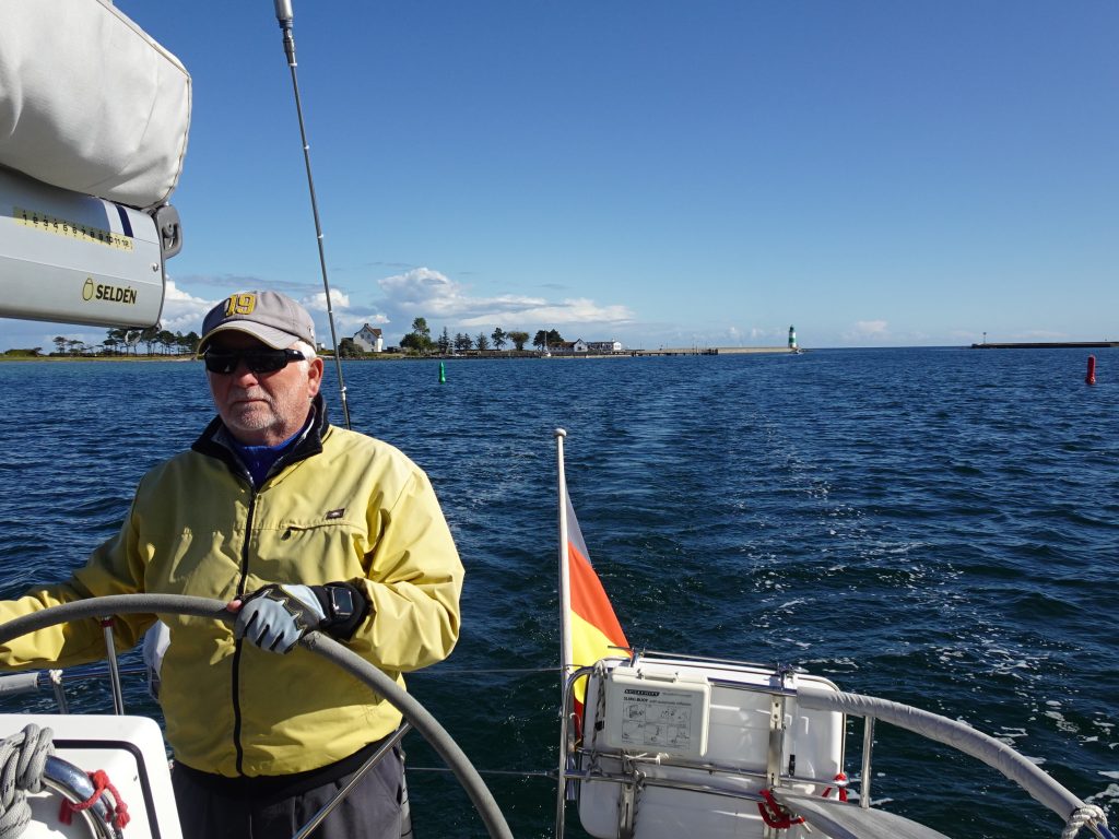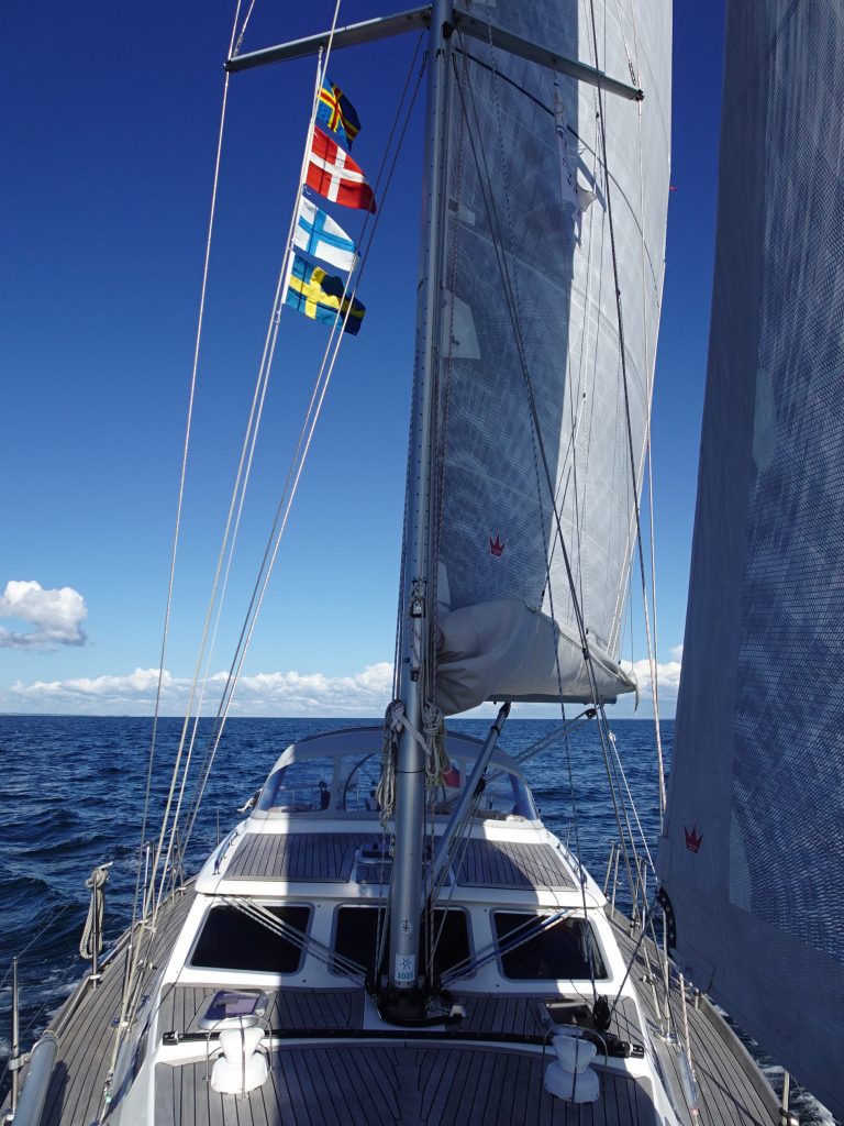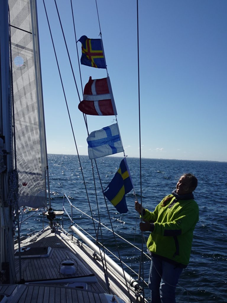 Während wir unser Frühstück genießen pendelt sich der Wind auf eine ideale Windstärke und -richtung ein und so legen wir dann auch baldigst ab. Die Sonne ist sowieso schon strahlend am Himmel und beschert uns einen richtig tollen Tag. Wenn man von den inzwischen etwas frischeren Temperaturen absieht, können wir von einem sommerlichen Tag sprechen. Wir haben ab der Nordspitze Ærøs einen Anlieger bis vor die Mündung der Schlei in die Ostsee und genießen den für diese Saison letzten Tag unter Segeln. Unterwegs, an der Grenze zu Deutschland, wird die Gastlandflagge Dänemarks durch drei weitere Gastlandflaggen ergänzt: Åland, Finnland und Schweden dürfen mit unter die Steuerbordsaling. Es ist nämlich üblich, das von einer Auslandsfahrt heimkehrende Yachten die Flaggen aller besuchten Länder – in der Reihenfolge des deutschen Alphabets – am Tag der Heimkehr zeigen. Also nichts wie hoch damit! Und nur zur Erinnerung: Die Ålandinseln – finnisch: Ahvenanmaan maakunta – gehören zwar zu Finnland, sind aber weitestgehend autonom… und haben eine eigene Flagge!