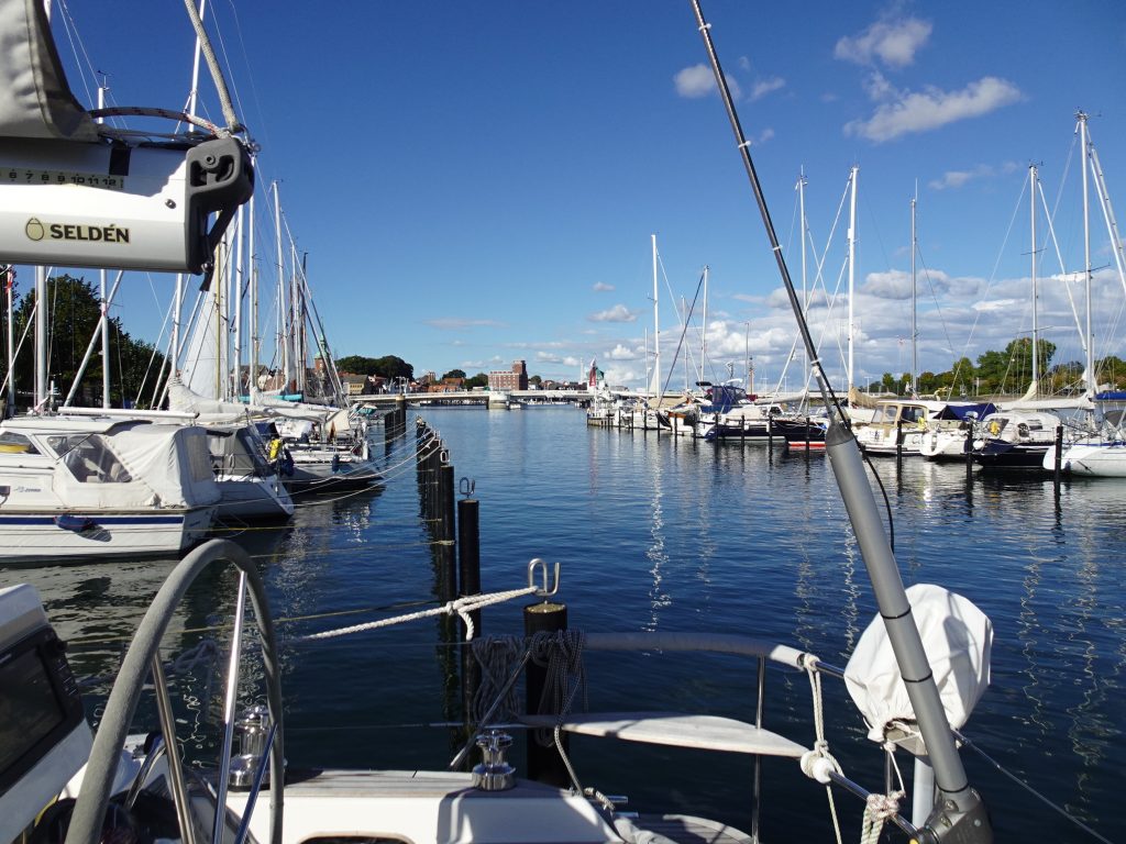 Nachdem die Beiden sich nach kurzem Stadtspaziergang per Bus wieder auf den Weg gen Kappeln zu ihrem Auto machen, beginnen wir gaaaanz langsam mit etwas aufräumen. Aber erstmal nur das übliche… die letzten Logbuchnotizen machen, Seekarte und Hafenhandbuch wegpacken, Fernglas verstauen, Hülle über die Steuersäule ziehen (obwohl wir uns jetzt ziemlich sicher sind, den Kompass gut abgedichtet zu haben – dank Ulli), Leinen ordentlich aufschießen, Landstromkabel legen… was man halt so nach dem anlegen zu erledigen hat. Und mehr passiert dann auch nicht mehr. Die große Pack-, Putz- und Räumaktion beginnt frühestens am Samstag. Nur nichts überstürzen.