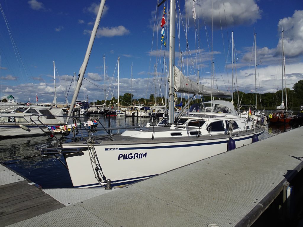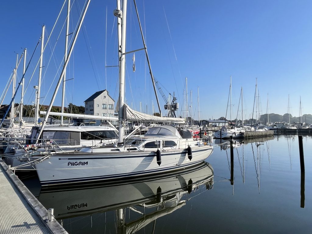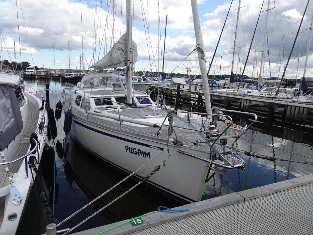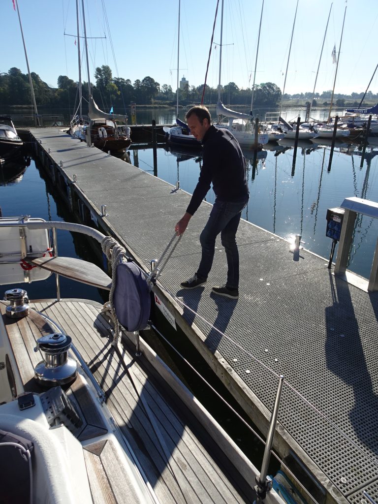 Kaum haben wir festgemacht, erfolgt mein übliches Fotoshooting: Pilgrim am Liegeplatz ablichten. Das hat sich bewährt, denn ich habe schon so manches mal auf alten Fotos nachgeschaut, wie in einem Hafen die Klampen am Steg aussehen, oder ob es Bügelhaken zum festmachen gibt, ob die Dalbenplätze lang genug sind oder wir hinten aus der Box rausgucken… Ich bin mit meinem Leinenmanagement halt gerne gut vorbereitet.