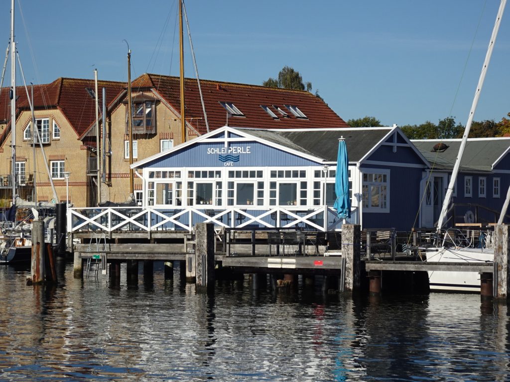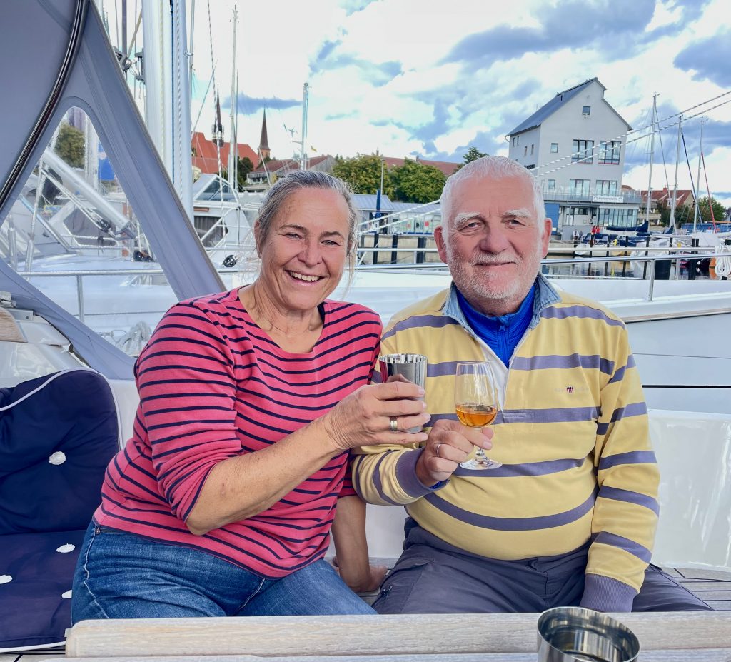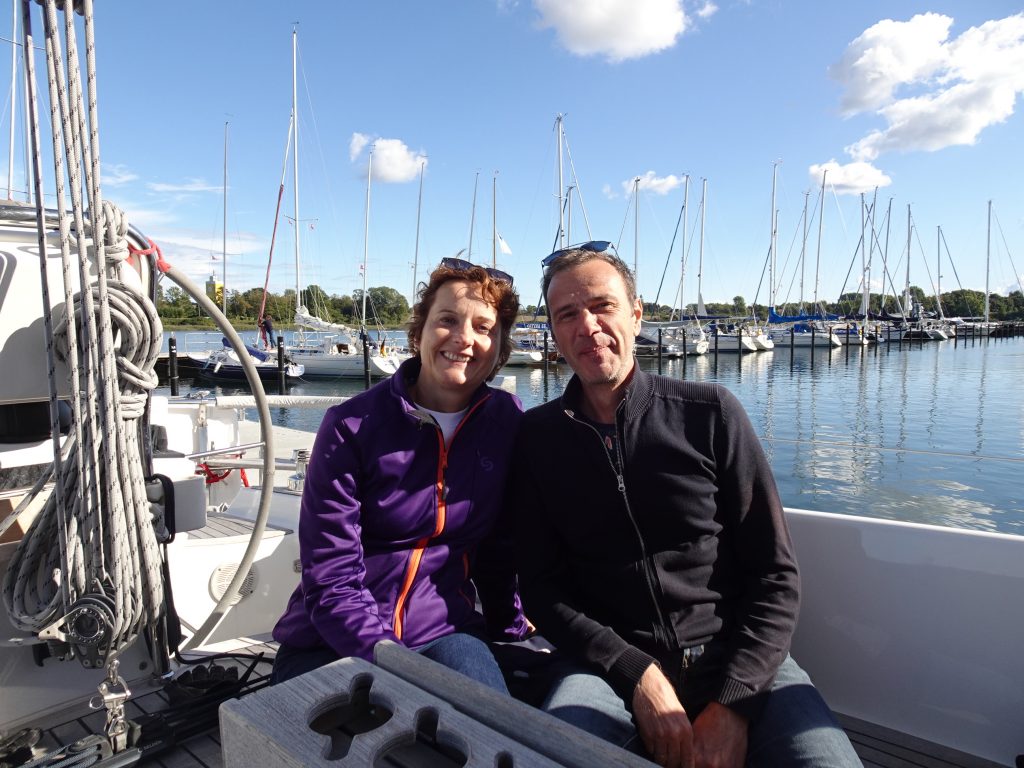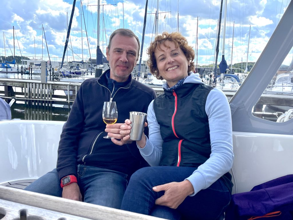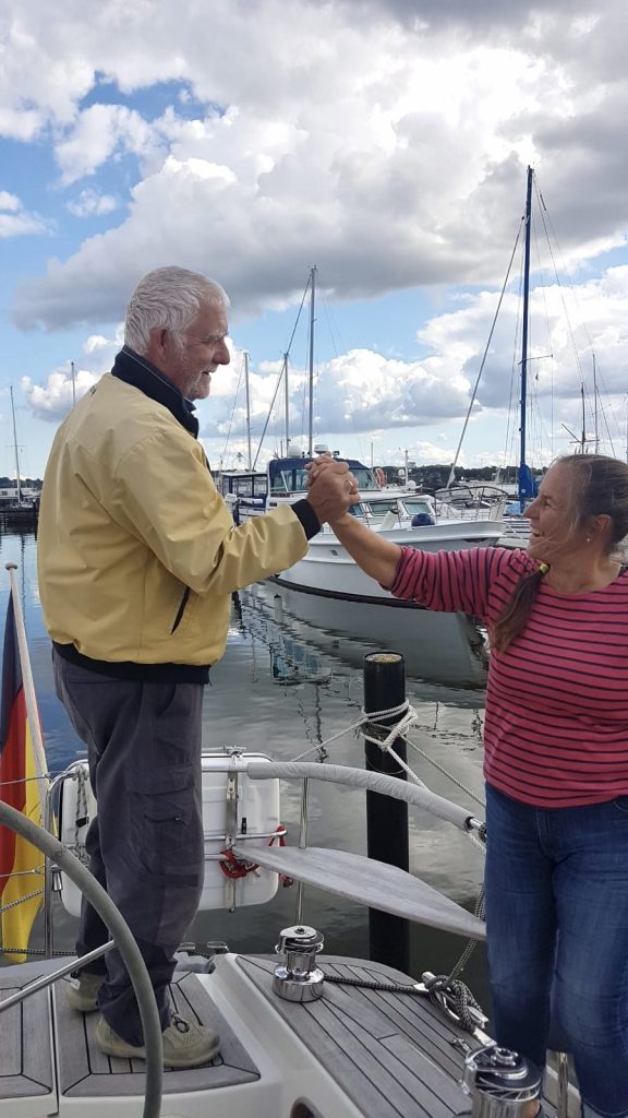 Wir laden die Beiden gleich zu uns an Bord ein und nehmen gemeinsam den obligatorischen Einlaufdrink. Was für ein netter Zufall! Elvira und Waleri sind seit zwei Tagen auf Urlaub an der Schlei. Und so werden wir – quasi wieder zu hause angekommen – von bekannten Gesichtern begrüßt. Wir erzählen eine Weile so vor uns hin und da das Wetter für morgen auch sonnig vorhergesagt ist, laden wir die Beiden ein, uns auf der Fahrt die Schlei hinauf bis nach Schleswig zu begleiten. Sie googeln gleich, wie die Busse von Schleswig zurück nach Kappeln fahren… noch etwas überlegt (wird man da vielleicht seekrank?)… ja gerne! Wir freuen uns über die morgige Begleitung und hoffen, dass es den beiden Landratten auch gefällt.