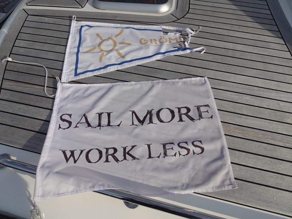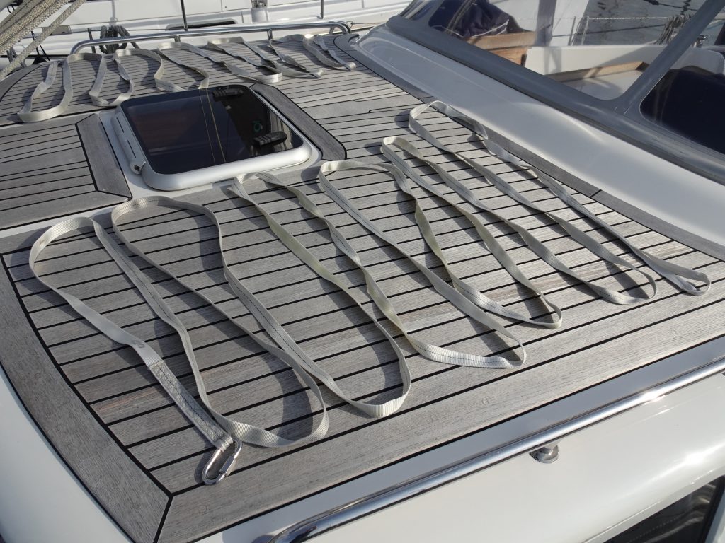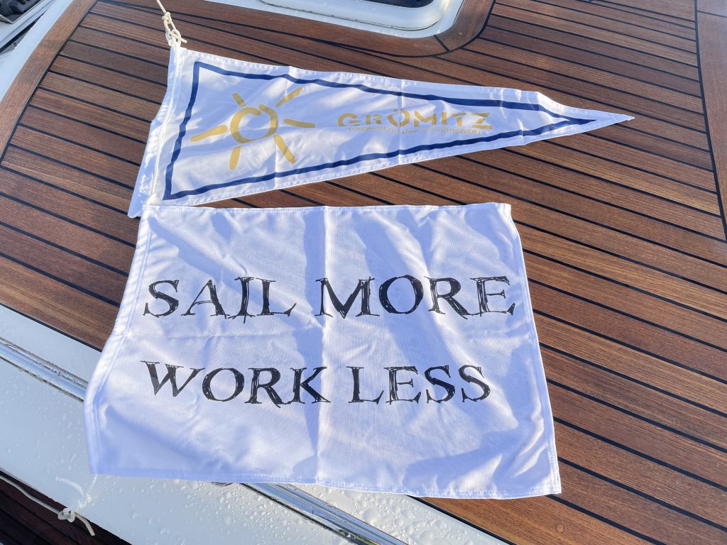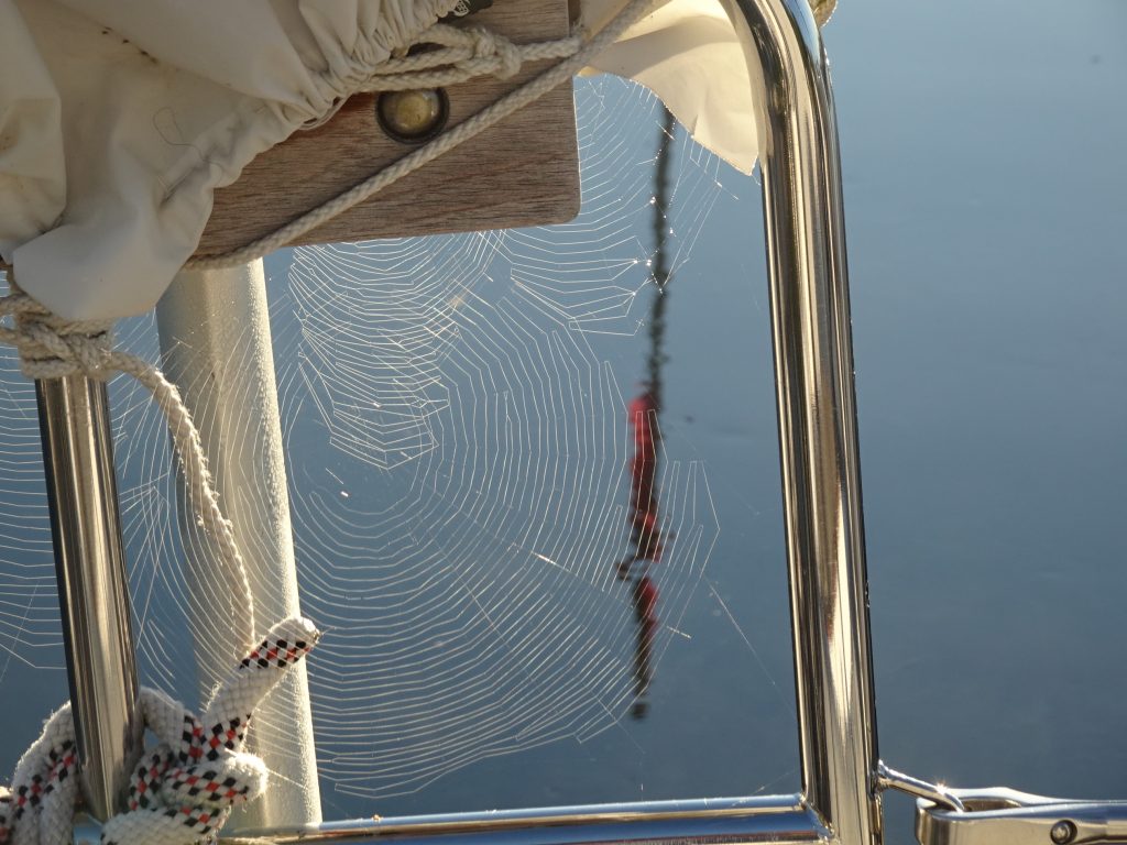 So geht das Wochenende sehr arbeitsreich ins Land. Als das Deck pickobello sauber ist – es sieht fast aus wie neu und wir müssen aufpassen, dass uns niemand ein Kaufangebot fürs Schiff macht – wird noch der Baum abgenommen und sicher an Deck verzurrt. Dann folgt mein Lieblingsjob: alle Fallen und Leinen möglichst klapperfrei belegen. Das ist wichtig für einen entspannten und ruhigen Schlaf.