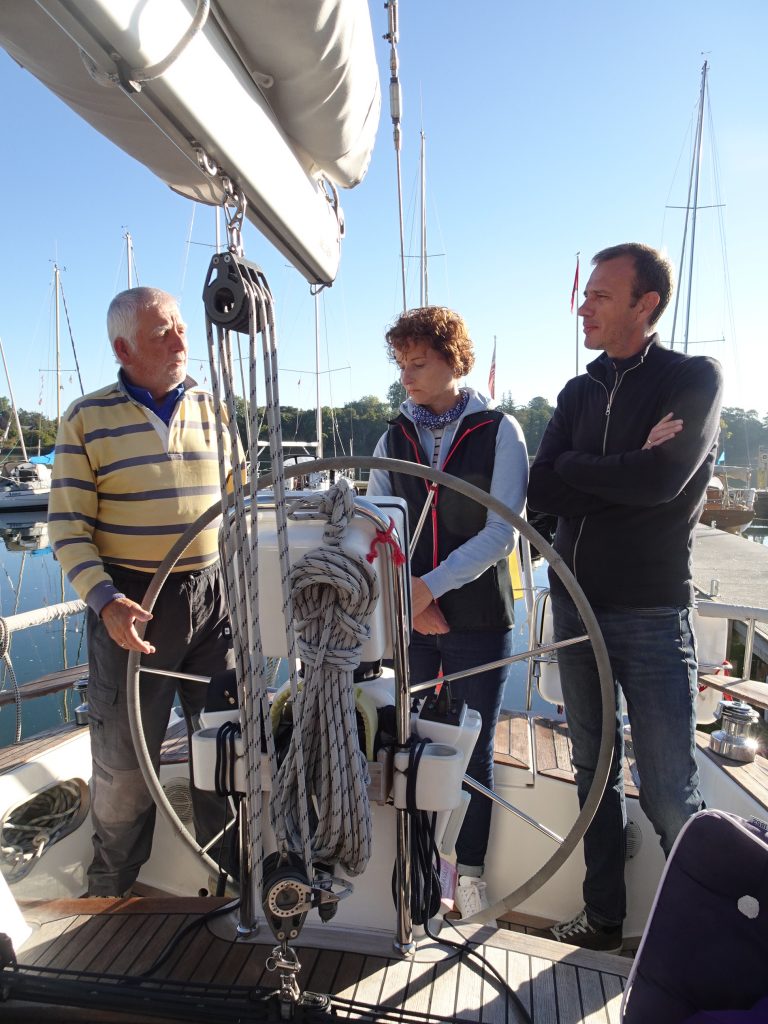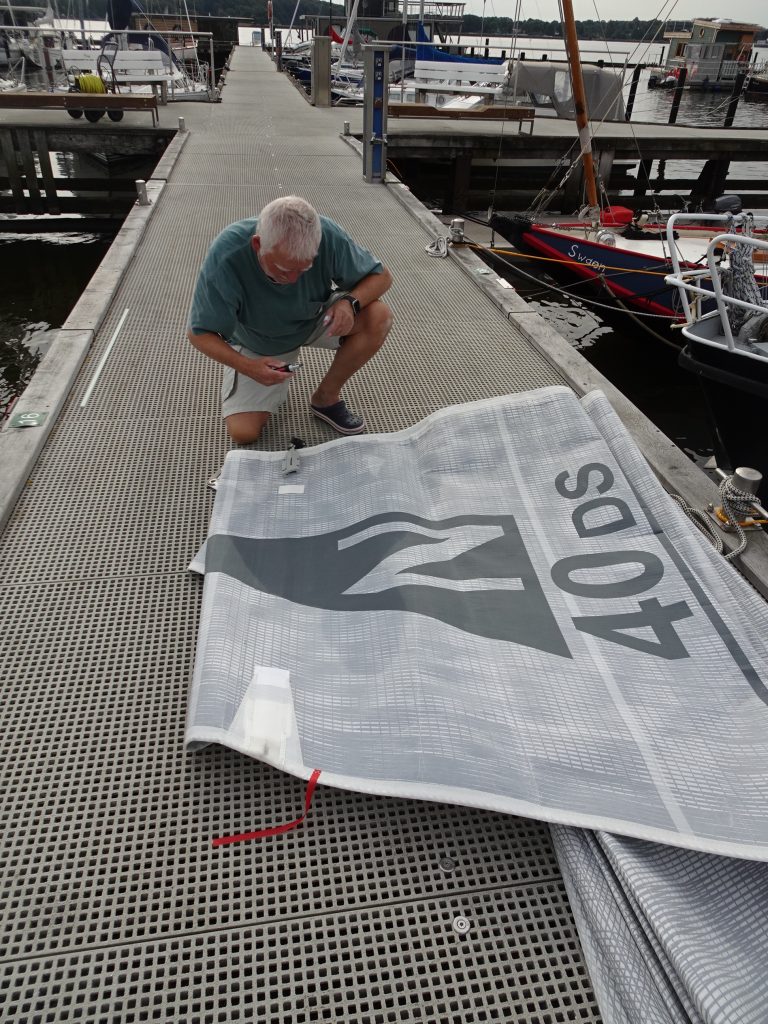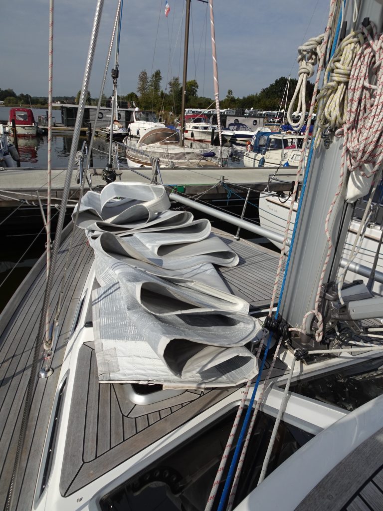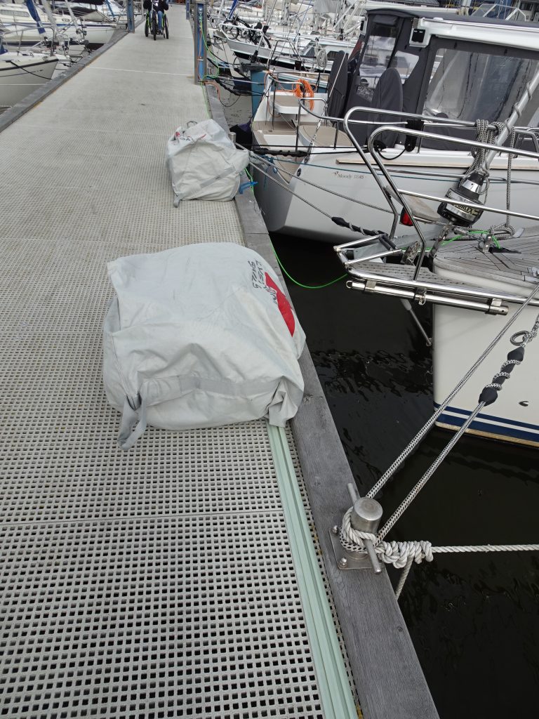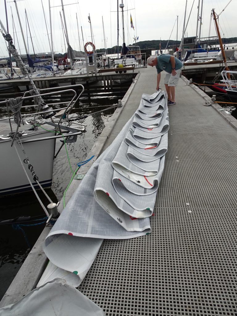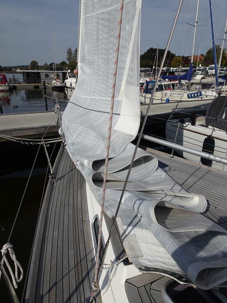 Am Freitag (23.09.) geht es dann genauso weiter… die Strecktaue, die gut 5 Monate für unsere Sicherheit an Deck lagen – zum einhaken der Rettungsleine unserer Rettungswesten – und langsam die graue Farbe unseres Teakdecks angenommen haben, werden nach einem Waschgang wieder fast weiß und ansehnlich und können verstaut werden. Als Kalli mit dem Auto wieder in Schleswig ankommt, nehmen wir als erstes schnell die Segel ab. Die sind trocken und es ist kaum Wind: ideale Voraussetzungen. Und dann wurschteln wir uns so weiter.