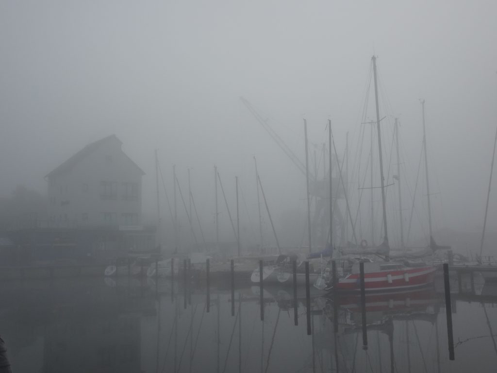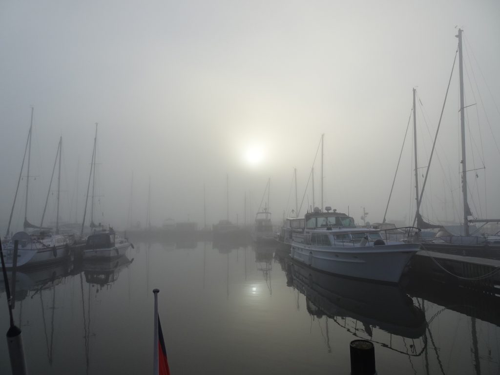 Kalli hat Glück, dass er morgens den Weg zum Taxi (und zum Bahnhof) findet, denn wir können kaum die andere Stegseite sehen: dichter Nebel überall! Es sieht irgendwie verträumt und friedlich aus, wie sich die Sonne so langsam ihren Weg durch die feuchte Luft bahnt.