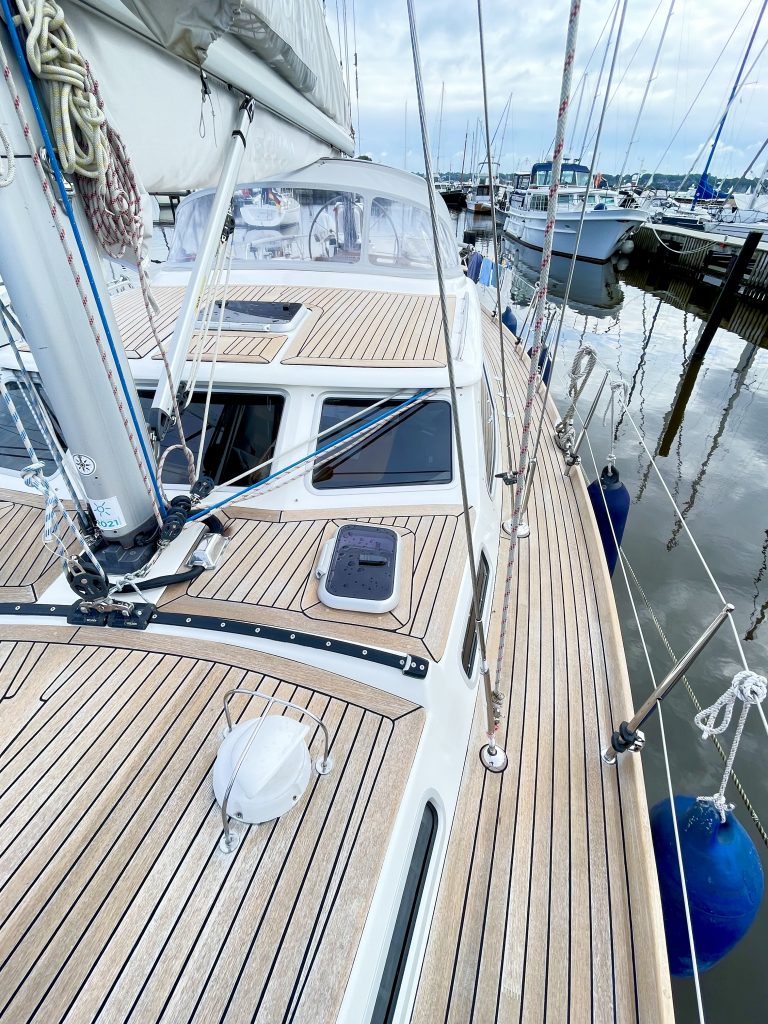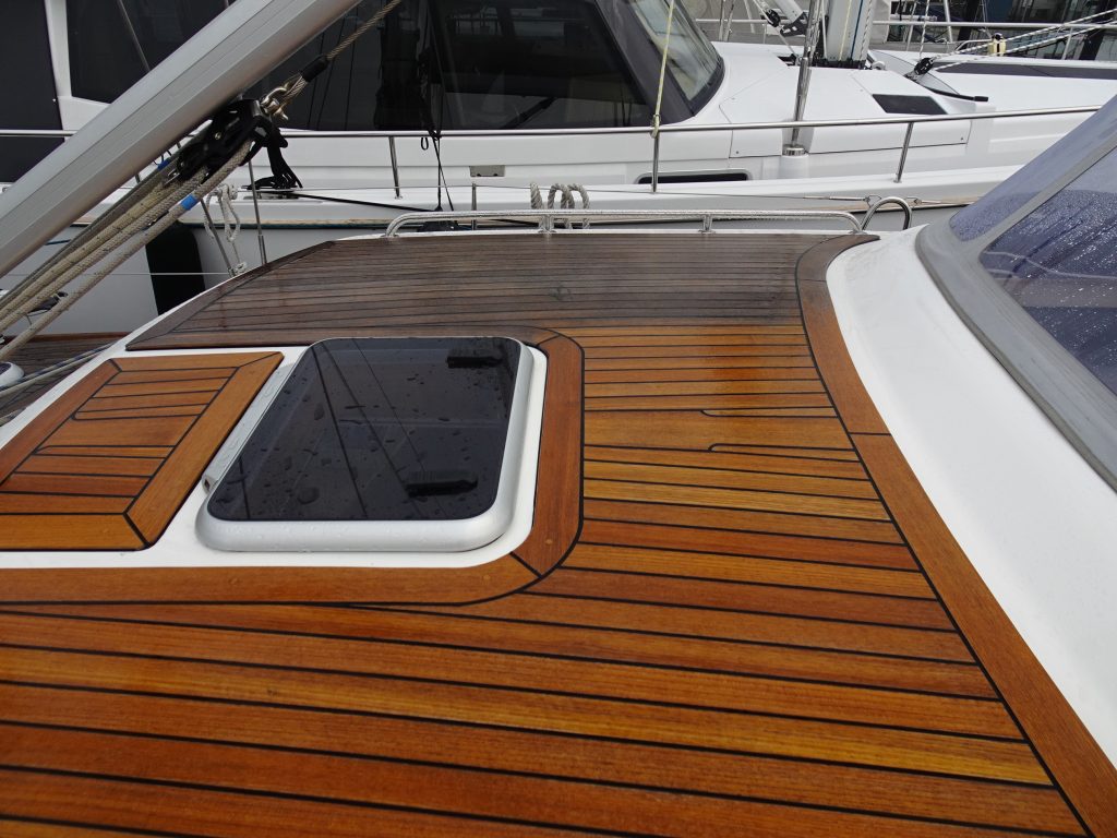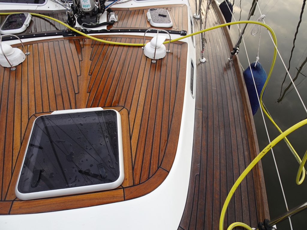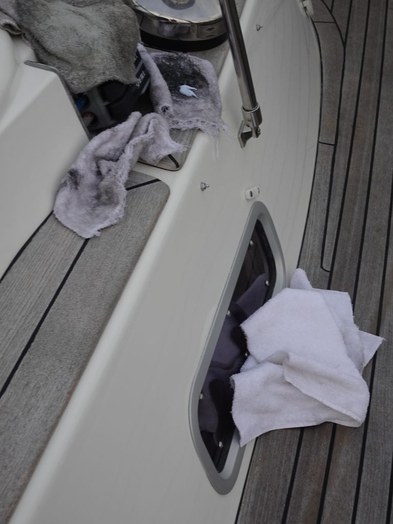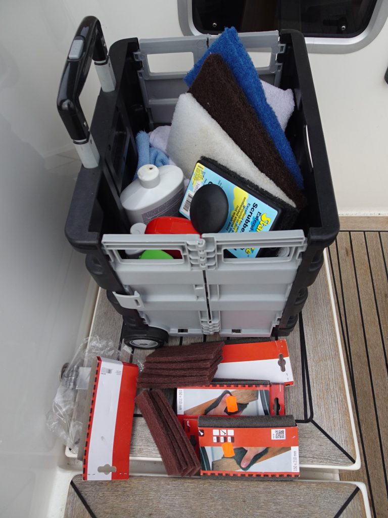Am frühen Nachmittag kommt dann netterweise noch ein Bekannter, der sich, wie in den letzten Jahren auch schon, sorgfältig und penibel um das Schrubben unseres Teakdecks und das Polieren des Decksaufbaus kümmern will. Das haben wir lange Jahre selber ohne Unterstützung hinbekommen, doch irgendwie wird das Schiff „gefühlt“ immer größer und Knie und Rücken immer steifer 🤷♀️🤷♂️->👵🧓🏻 Er hat das Wochenende über Zeit und ackert immer um sich rum🙏 Wir halten ihn mit Heißgetränken und belegten Brötchen bei Laune und ackern selber derweil innen um uns rum: weiter packen, putzen und dann mal alles Holz (natürlich nur im Innenraum) mit Pflegemittel behandeln.