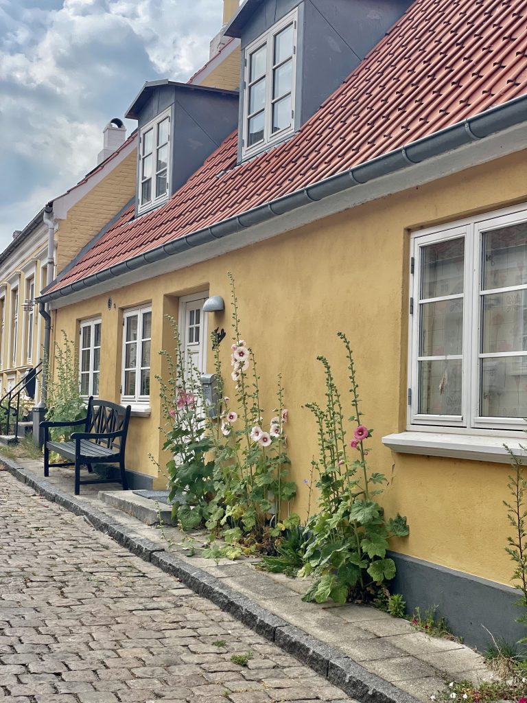 Anschließend macht die Besatzung der Danae eine Bustour nach Ærösköbing. Busfahren ist hier auf der Insel kostenlos und da ja der ganze Tag vor uns liegt, bietet sich solch eine Fahrt an. So können sich die Beiden gleich noch einen weiteren Hafen anschauen, denn den werden wir auf diesem Törn nicht anlaufen. Da Kalli und ich aber Ærösköbing schon kennen, begnügen wir uns mit einem Spaziergang durch Marstal. Kennen wir zwar auch schon, aber etwas Bewegung tut gut und durch die schmalen Straßen zu schlendern ist immer wieder nett. Es gehört zum Straßenbild Dänemarks, dass an vielen Stellen Stockrosen blühen und die zum Teil engen Wege noch schmaler und bunter machen. Der Name ist allerdings irreführend: es ist eigentlich ein Malvengewächs und gehört bei uns in jeden guten Bauerngarten. Und welch ein Zufall… unser Weg führt an einem sehr gut sortierten Handarbeitsgeschäft vorbei. Schon von draußen höre ich die Wolle nach mir rufen. Tja, was soll man machen…