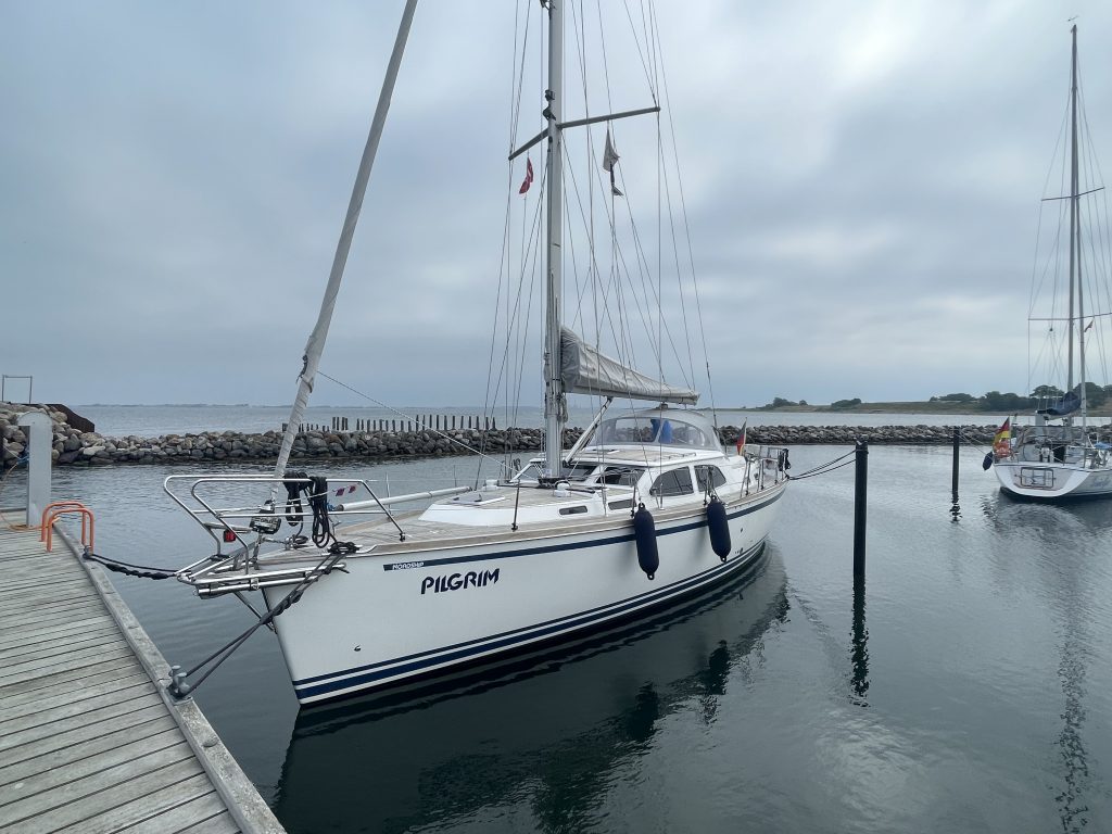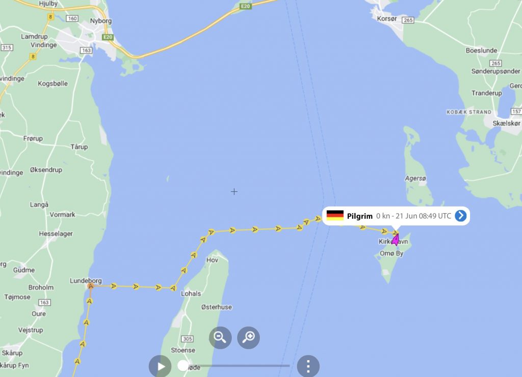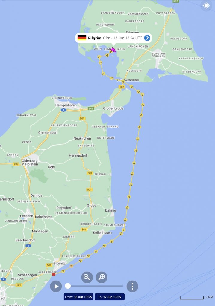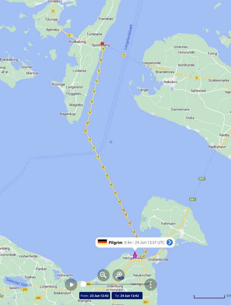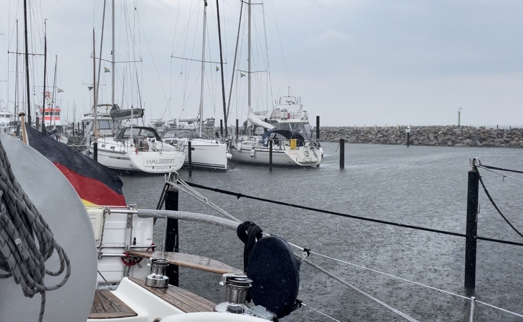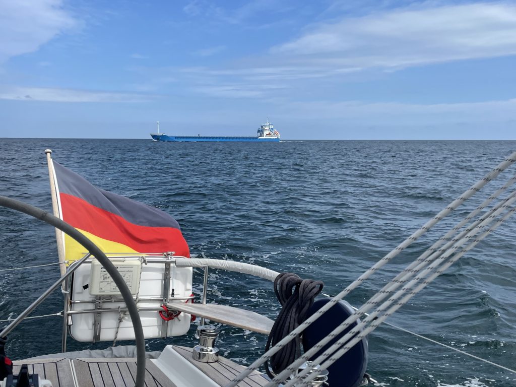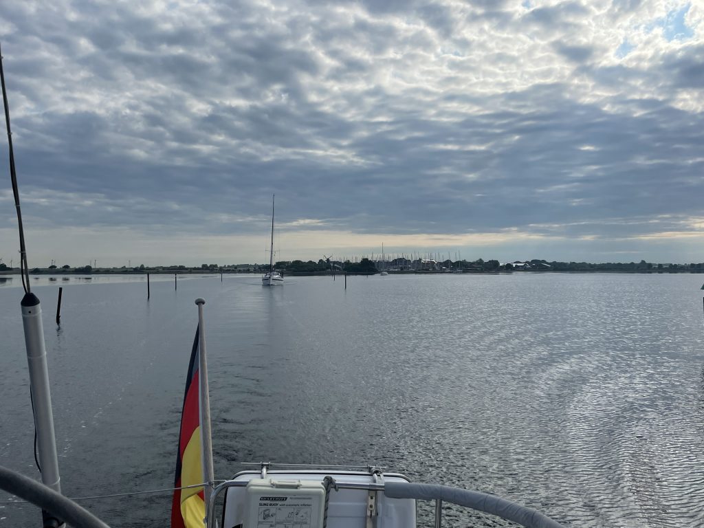 Danae kommt, ebenfalls deutlich gerefft, gut durch den Wind und heile in Spodsbjerg an… Valéria macht sich gut… die Seebeine wachsen! Den Tag lassen wir gemütlich ausklingen und sammeln Energie für morgen: eine längere Etappe (ca. 38sm) bis nach Heiligenhafen liegt vor uns. Doch auch da spielt der Wind wieder mit und wir können fast die gesamte Stecke wunderbar (und ungerefft) segeln. Gleichmäßiger Wind und ganz ruhiges Wasser läßt Pilgrim – und auch Danae – einfach so dahingleiten. Zu beiden Seiten sehen wir viele andere Segler, die sich offensichtlich die gleiche Windvorhersage angeschaut haben wie wir und nun einen größeren Hafen – für einen längeren „Wind-Aufenthalt“ – aufsuchen. Unterwegs passieren wir wieder den Kiel-Ostsee-Weg und auch jetzt passt es mit den querenden Frachtern gut.