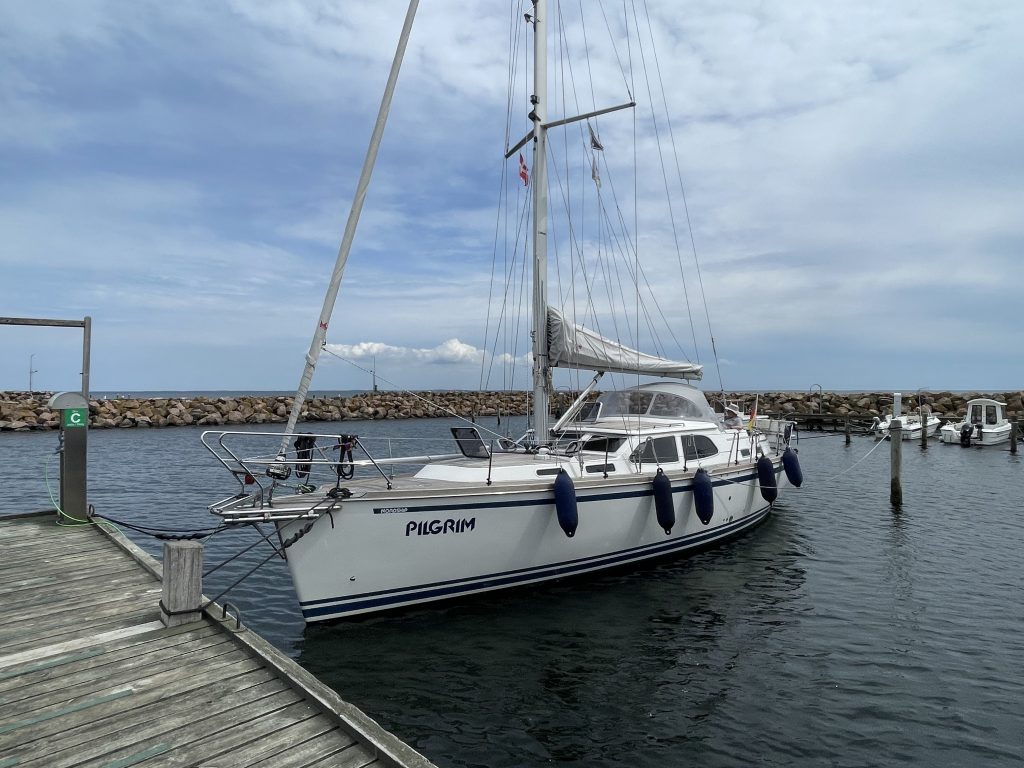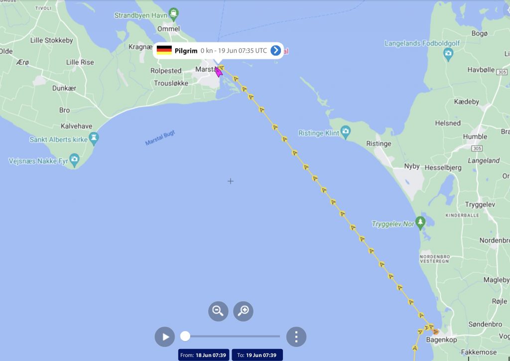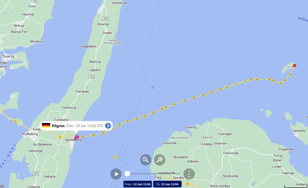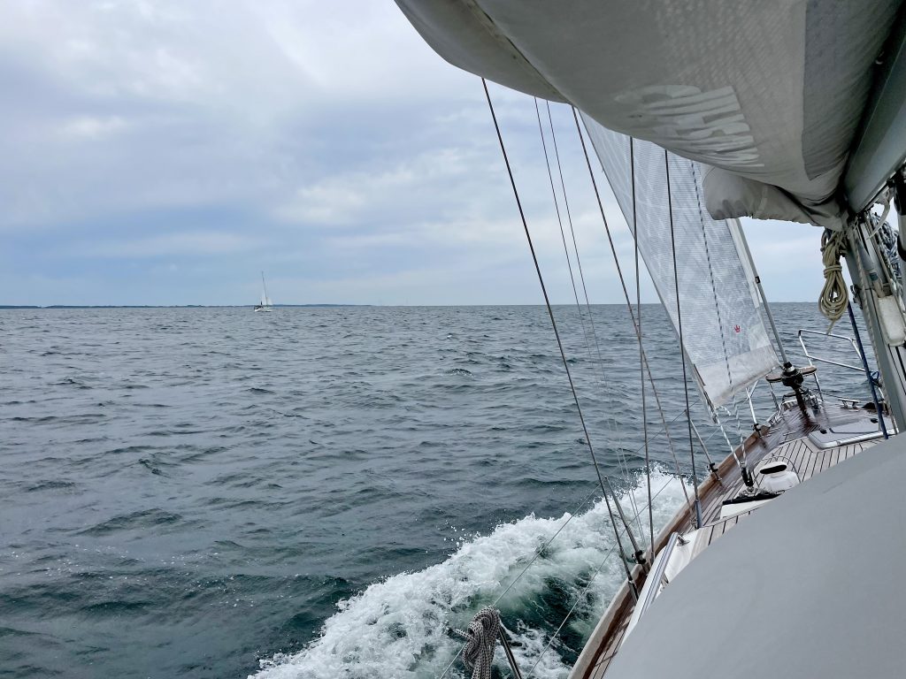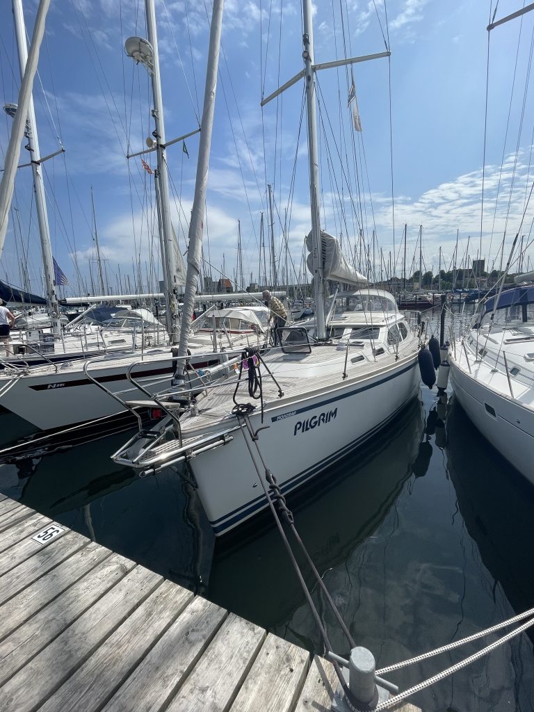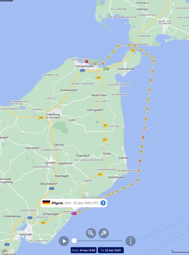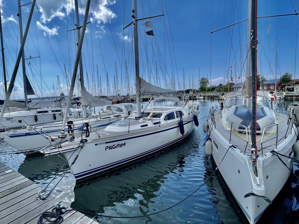 Danae kommt, ebenfalls deutlich gerefft, gut durch den Wind und heile in Spodsbjerg an… Valéria macht sich gut… die Seebeine wachsen! Den Tag lassen wir gemütlich ausklingen und sammeln Energie für morgen: eine längere Etappe (ca. 38sm) bis nach Heiligenhafen liegt vor uns. Doch auch da spielt der Wind wieder mit und wir können fast die gesamte Stecke wunderbar (und ungerefft) segeln. Gleichmäßiger Wind und ganz ruhiges Wasser läßt Pilgrim – und auch Danae – einfach so dahingleiten. Zu beiden Seiten sehen wir viele andere Segler, die sich offensichtlich die gleiche Windvorhersage angeschaut haben wie wir und nun einen größeren Hafen – für einen längeren „Wind-Aufenthalt“ – aufsuchen. Unterwegs passieren wir wieder den Kiel-Ostsee-Weg und auch jetzt passt es mit den querenden Frachtern gut.