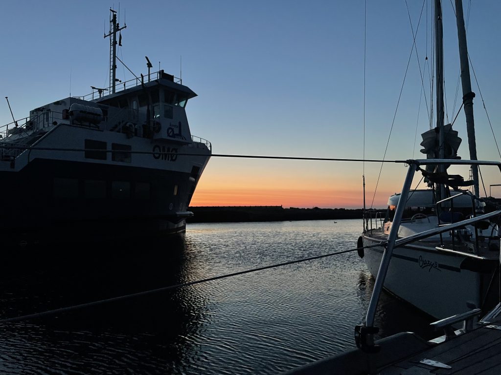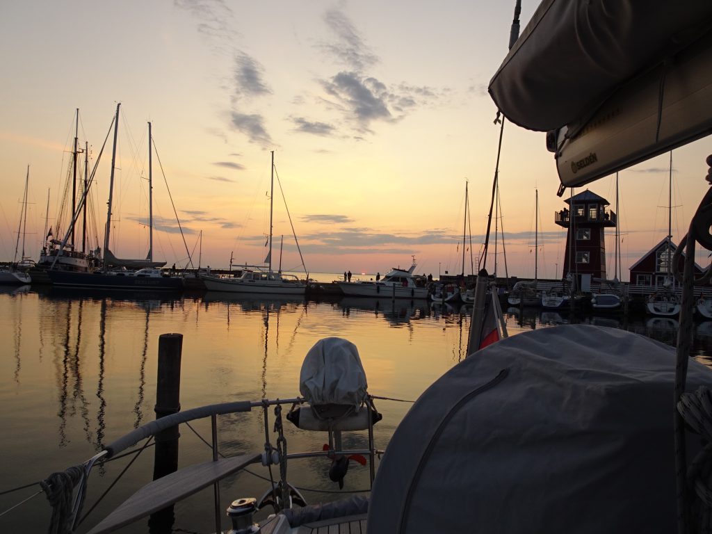 Der Sonnenuntergang beschert uns einen schönen Tagesabschluß und langsam sinkt der Hafen in den nächtlichen Ruhemodus. Beim abendlichen Einholen der Flagge am Heck aber Achtung: ab jetzt muss auch an das Einholen der Gastlandflagge gedacht werden!