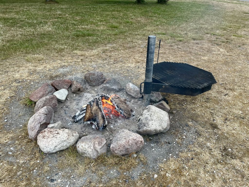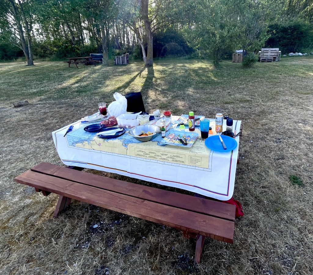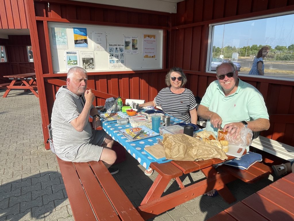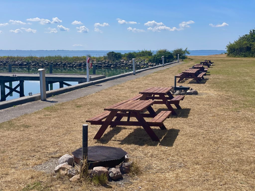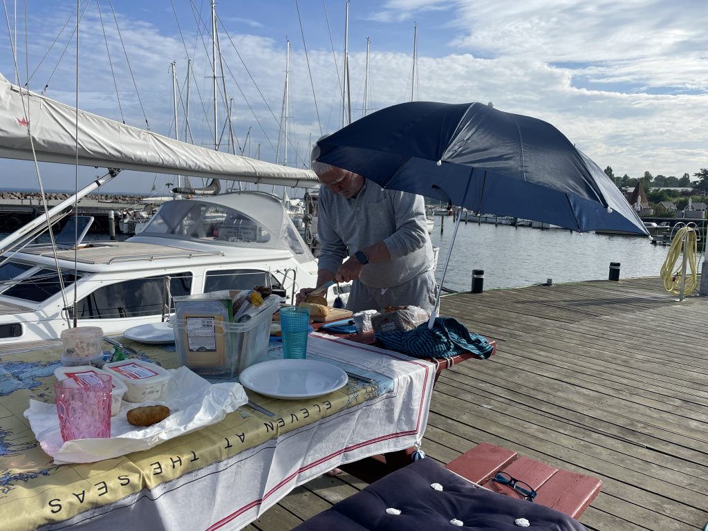 Auf unseren sonst hier üblichen Dänemark-Begrüßungs-Burger müssen wir leider verzichten: der Laden hat den Beginn der Segelsaison irgendwie noch nicht mitbekommen. Also sammeln wir unsere sämtlichen Leckereien zusammen – und es gibt viel Leckeres auf zwei Schiffen – und nutzen einen der vielen Grilltische am Hafen – heute allerdings ohne Grillfleisch.