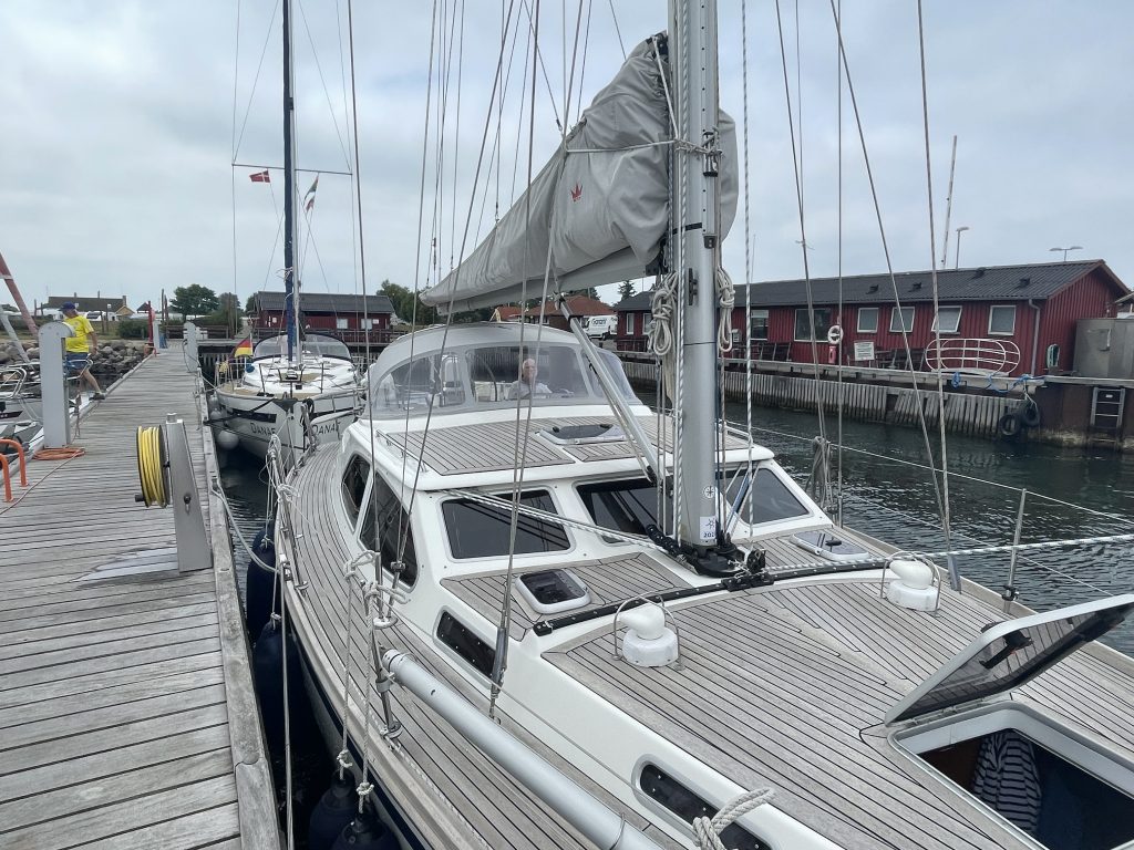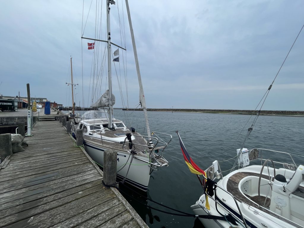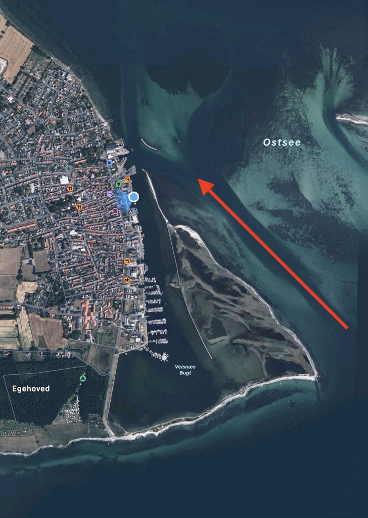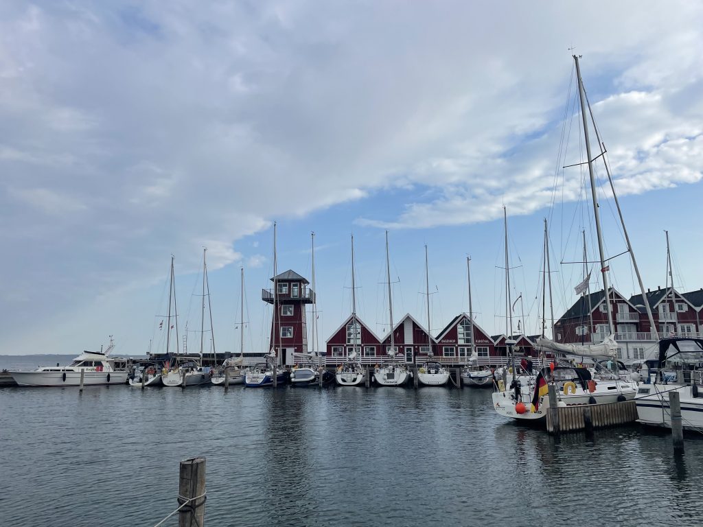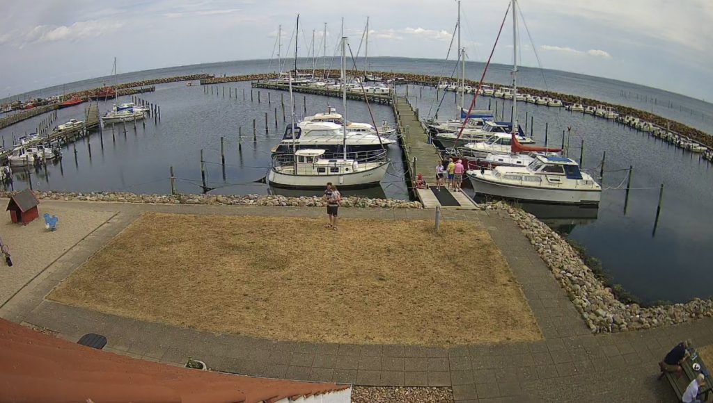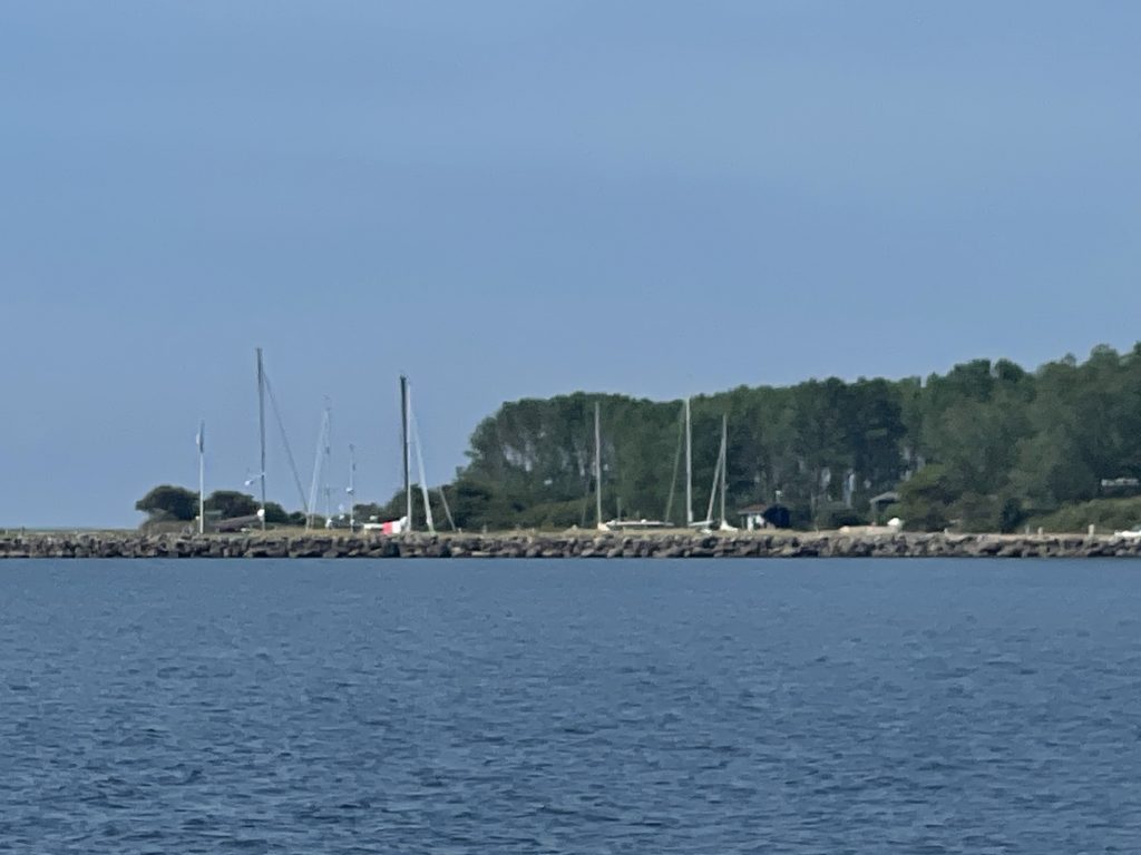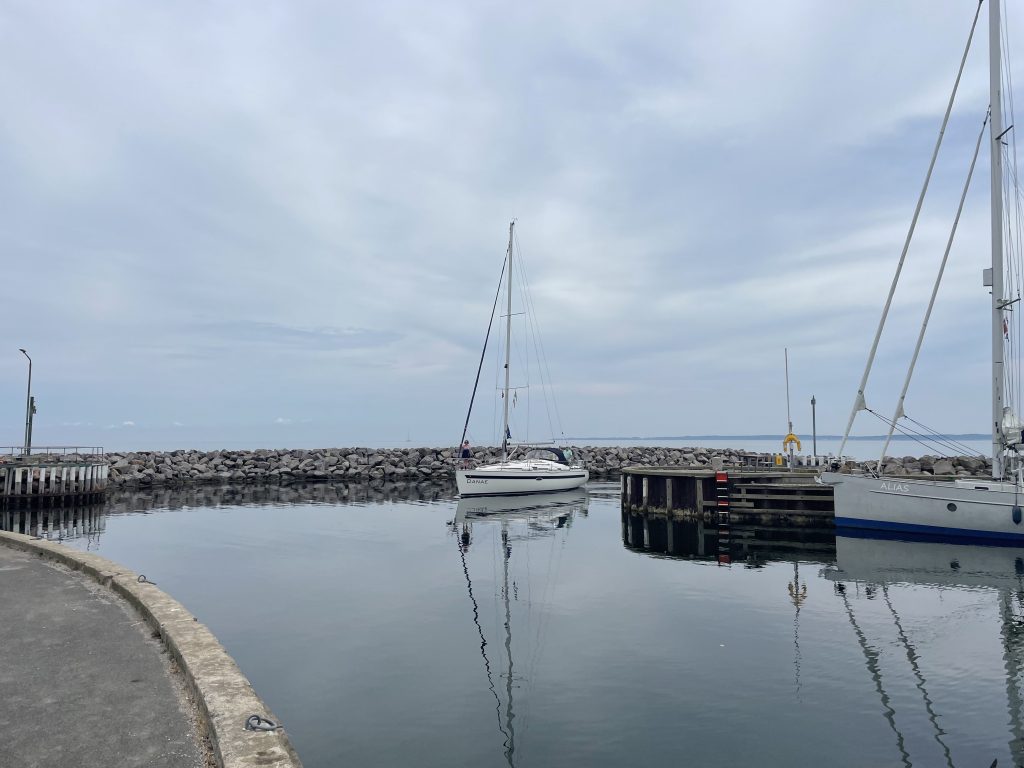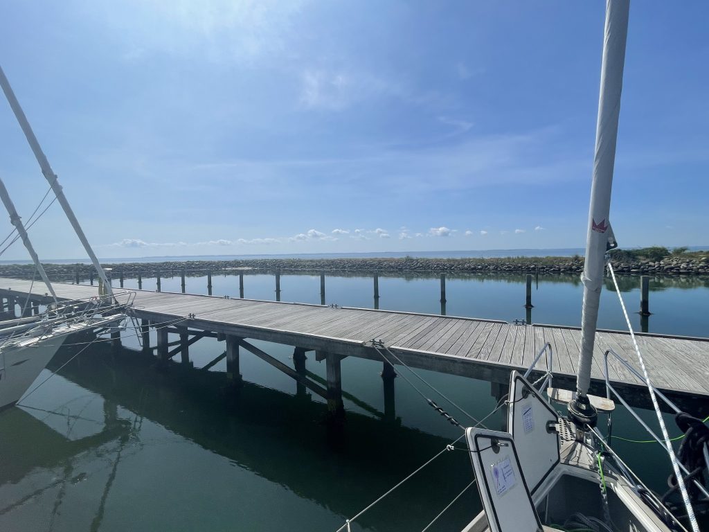 Feier hin oder her, auch der bedeckte Himmel hält uns nicht davon ab, gegen 10 Uhr abzulegen. Wir haben eine rasante Überfahrt nach Spodsbjerg an der Ostküste Langelands. Die Wellen sind noch gemächlich, die Windrichtung paßt und wir rauschen selbst mit einem Reff im Großsegel zügig – mit zeitweilig 7,8 Knoten (!) – zu unserem neuen Zielhafen. Kurz vor der Ankunft konsultiere ich mal die dortige WebCam und kann das Ergebnis nicht wirklich glauben. https://de.spodsbjerghavn.dk/webcam/webcam-1-ost.aspx . Der Hafen ist nahezu leer. Ist die Kamera etwa außer Betrieb? So leer hätte ich den Hafen nicht erwartet. Doch bei der Einfahrt zeigt sich: ganz viele Liegeplätze sind leer und wir finden problemlos einen Platz.