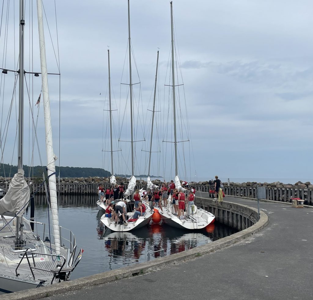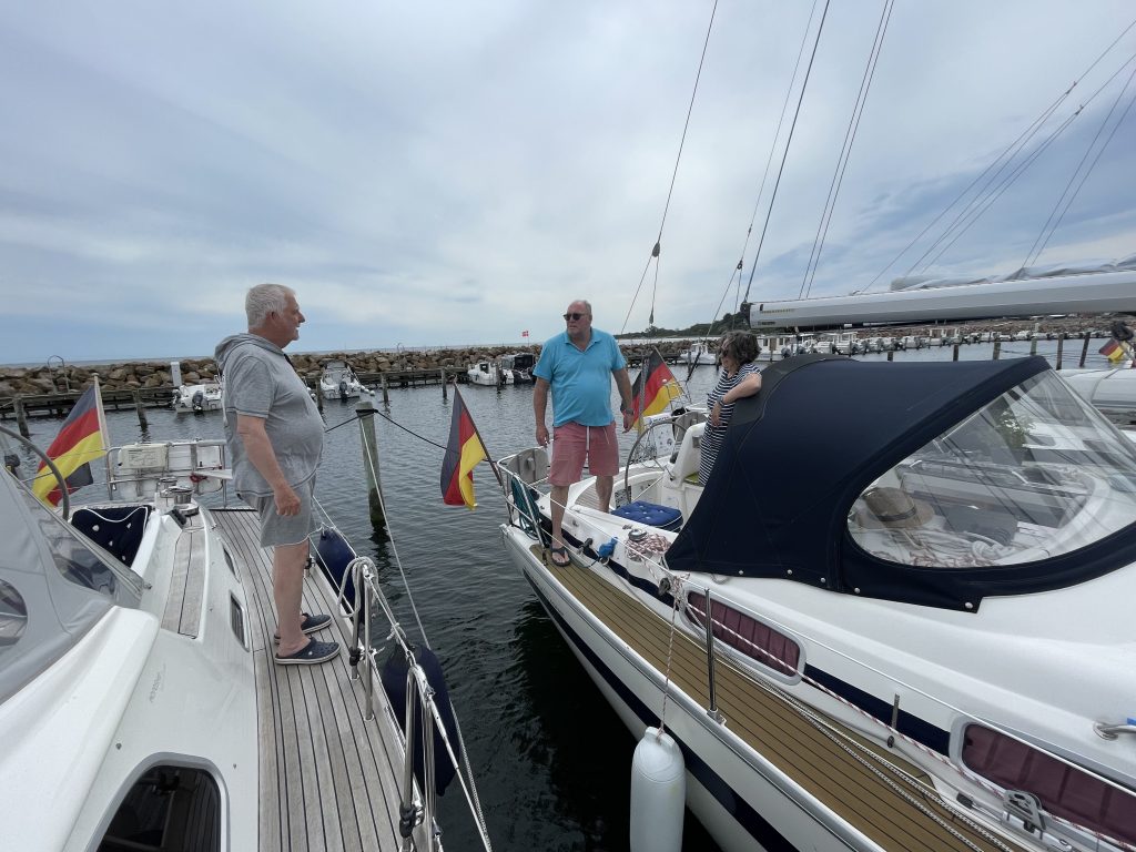 Durch unser zeitiges Eintreffen in Lundeborg haben wir nahezu freie Platzwahl, müssen nur den Sportbooten des örtlichen Internats Platz machen. Die Schule hat eine engagierte Segelsparte und ist heute mit vier Booten mit je 10 Personen an Bord (!) unterwegs. Aber das kennen wir schon von früheren Besuchen und so können wir André vorwarnen, der just einläuft, als die Sportboote auslaufen.