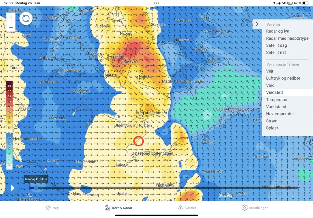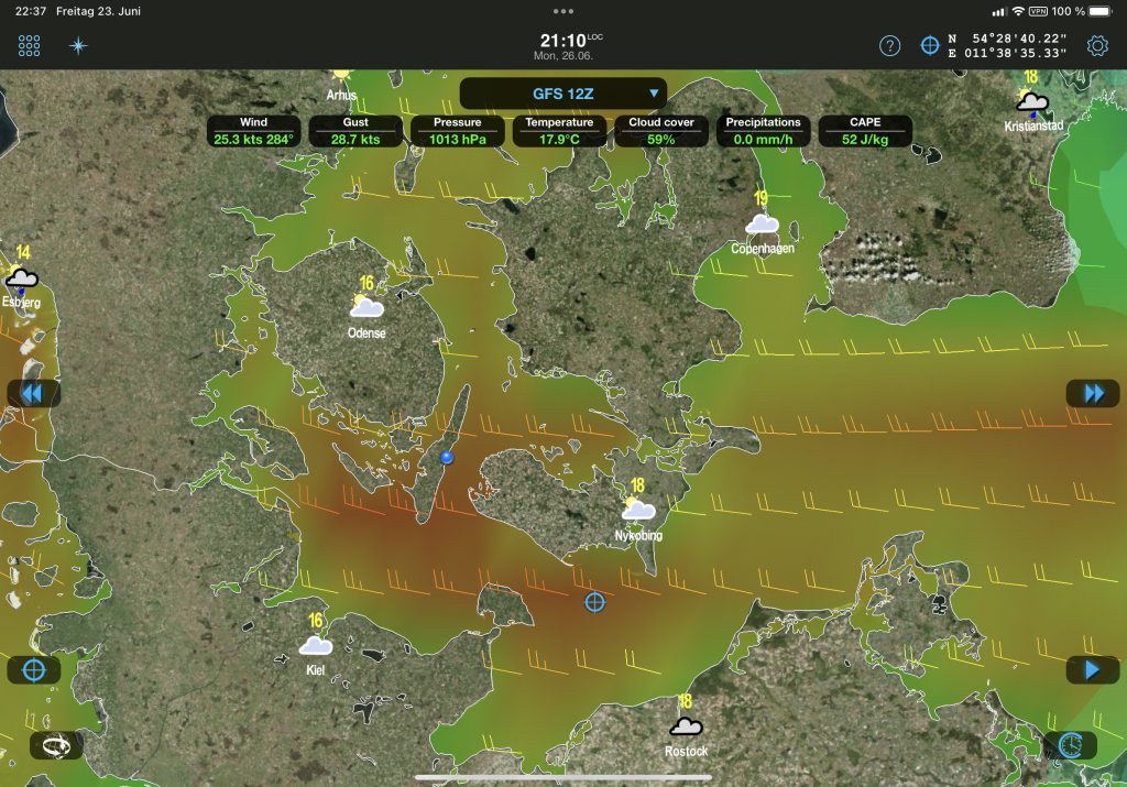 Ach übrigens: am Montag (26.Juni) bläst es ab Mittag mit 5-6 Beaufort und einzelne heftige Schauerböen bringen willkommene Abkühlung. Gut, dass wir sicher im Hafen liegen.