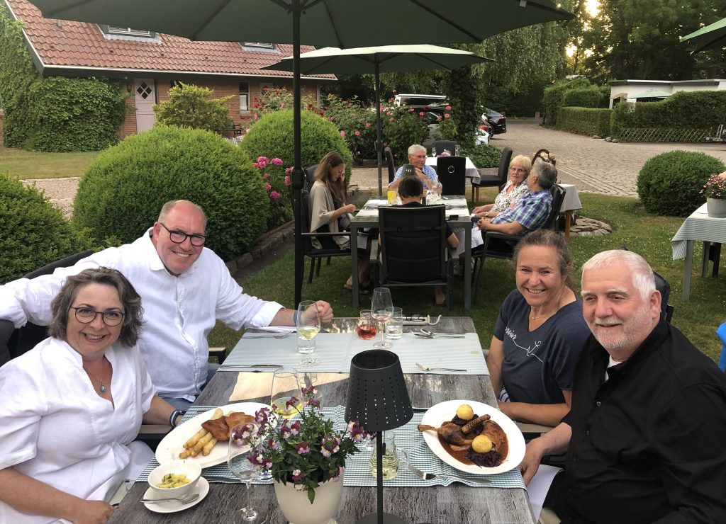 Und um dem Ganzen noch ein I-Tüpfelchen aufzusetzen, haben wir für abends einen Tisch im Margaretenhof reserviert (https://restaurant-margaretenhof.com) – eines der besten Restaurants im weiten Umkreis. Ein 20-minütiger Fußmarsch bringt uns vom Hafen zum Restaurant, wo heute, bei dem tollen Sommerwetter, draußen alles nett eingedeckt ist. Das Essen ist – wie erwartet – äußerst schmackhaft und der Service – wie immer – sehr sehr nett. Der Weg hierher lohnt sich unbedingt! Beschwingt und gut gesättigt ist der Weg zurück zum Schiff auch seltsamerweise nur noch halb so weit.