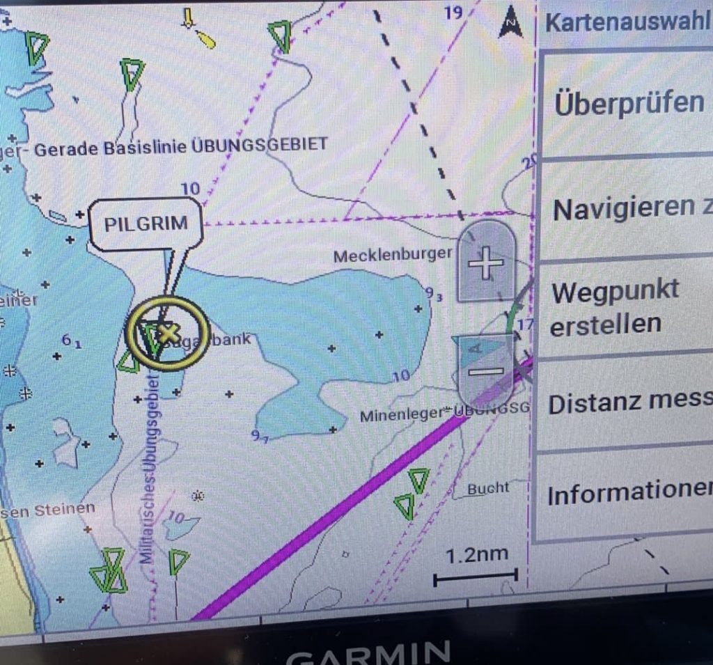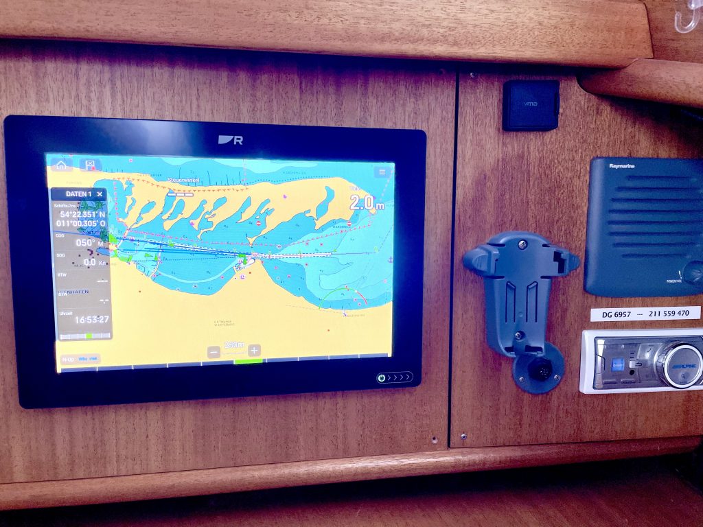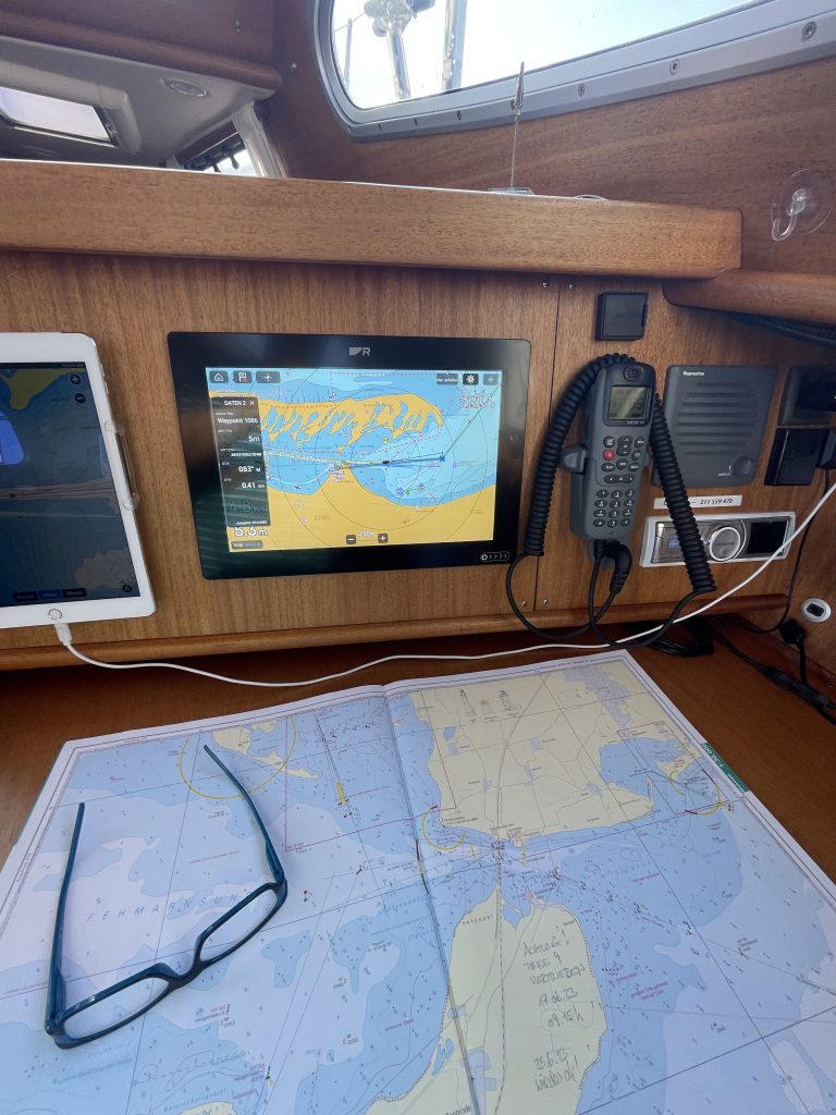 Und dann ist es endlich soweit: am Donnerstagnachmittag trifft die Expresslieferung ein und der Monteur hat auch alles fix eingebaut. Jetzt noch nach Grömitz aufzubrechen haben wir allerdings keine Lust. Wir bereiten alles für den morgigen Start vor… z.B. sich mit dem neuen Plotter ein wenig vertraut machen – die Bedienung ist schon deutlich anders, als beim alten Modell – die Wegepunkte, Routen etc. finden, Papier-Seekarte bereitlegen, Wetterbericht checken… paßt alles.