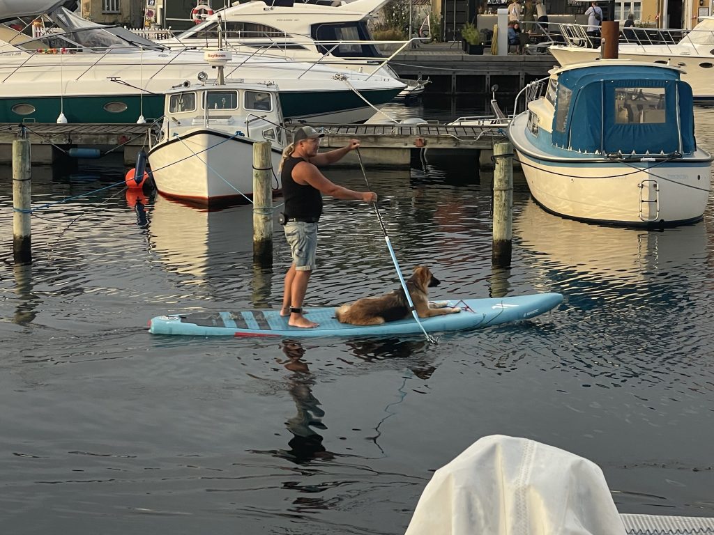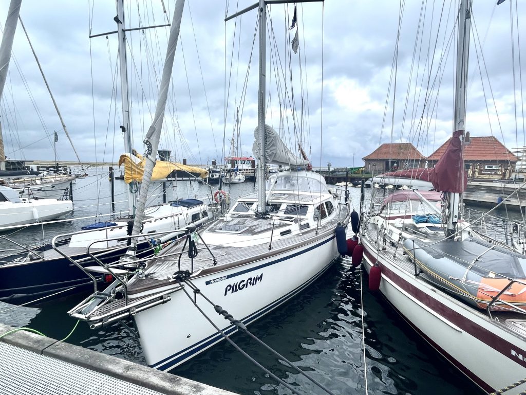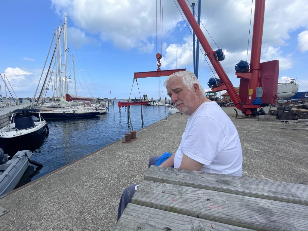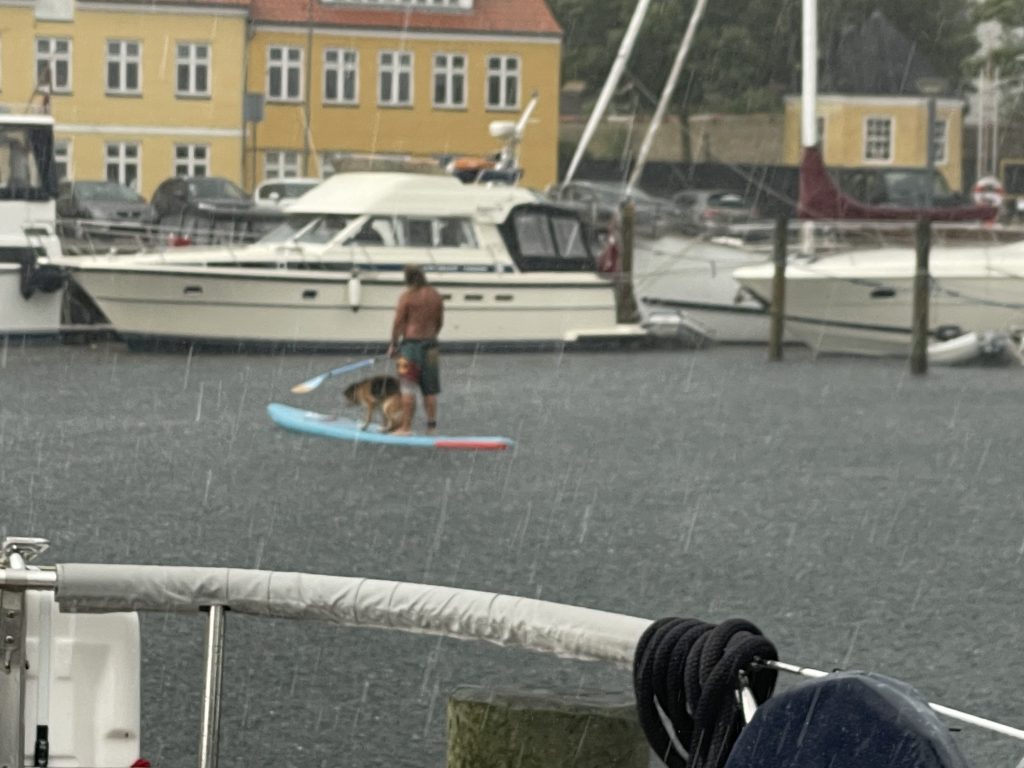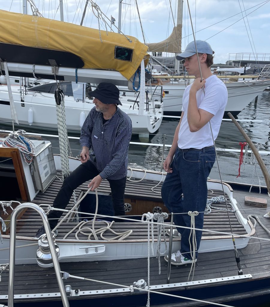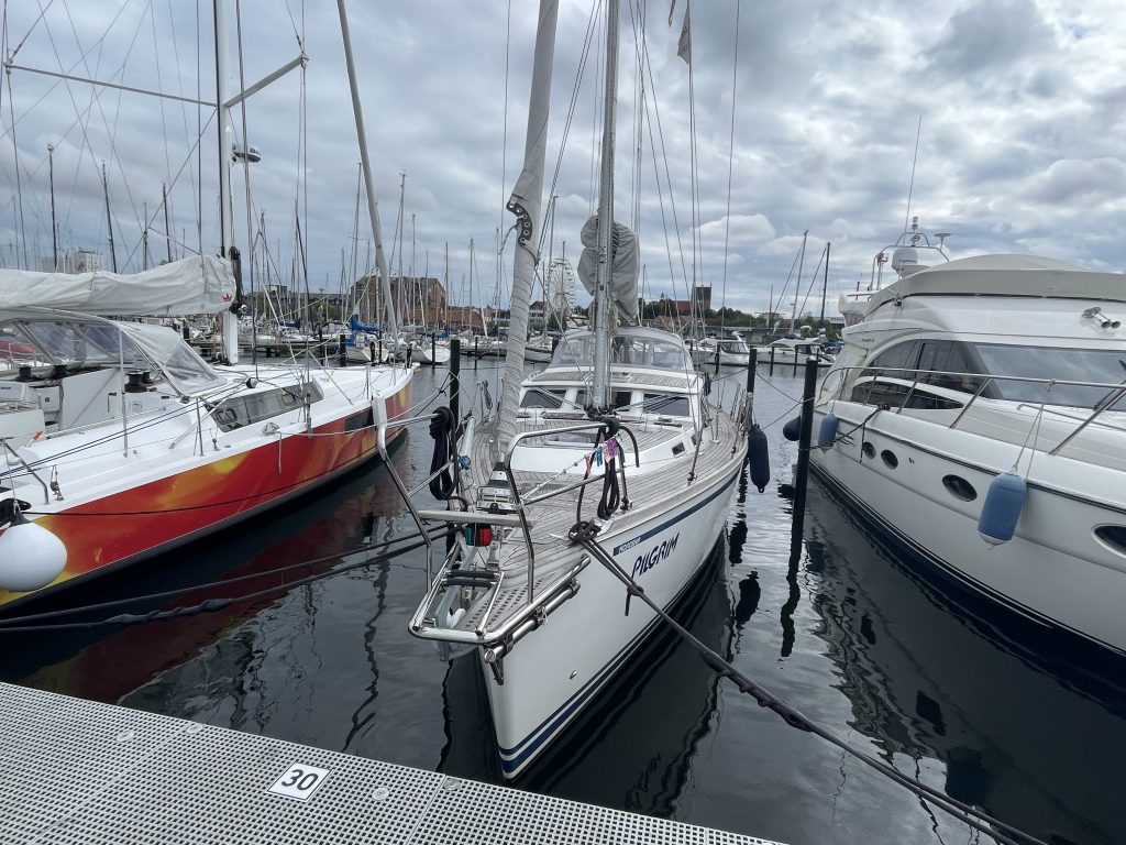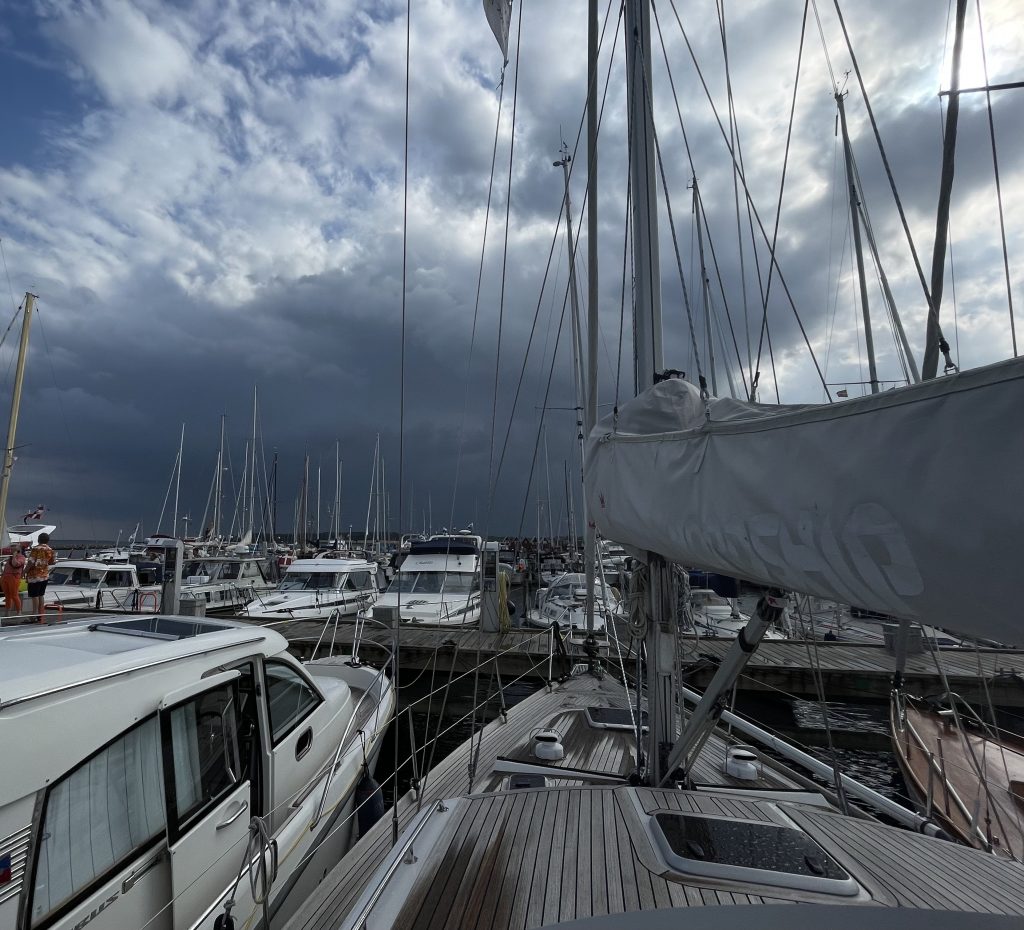 Eine lustige Begebenheit am Rande: wir haben schon wieder jemanden getroffen, den wir sieben Jahre nicht gesehen haben. Neben uns im Hafen liegt ein Schiff, das einige Zeit in Grömitz mal an unserem Steg lag. „Sume“, damals als 2-Master unterwegs, haben wir aber auch als – jetzt – Einmaster erkannt. Sie liegt hier wegen ausgeführter Werftarbeiten und soll nun wieder an ihren Sommerliegeplatz nach Orth/Fehmarn verholt werden. Vorher gibt es allerdings noch ein kleines Problem mit einem neuen Segel. Als die Eigener kommen, haben wir uns gleich wiedererkannt, sehr nett unterhalten und alte Erinnerungen ausgetauscht. Nur ein abendlicher langanhaltender heftiger Regen verhindert – leider – längere Gespräche im Cockpit.