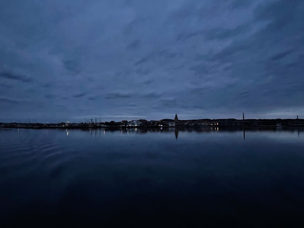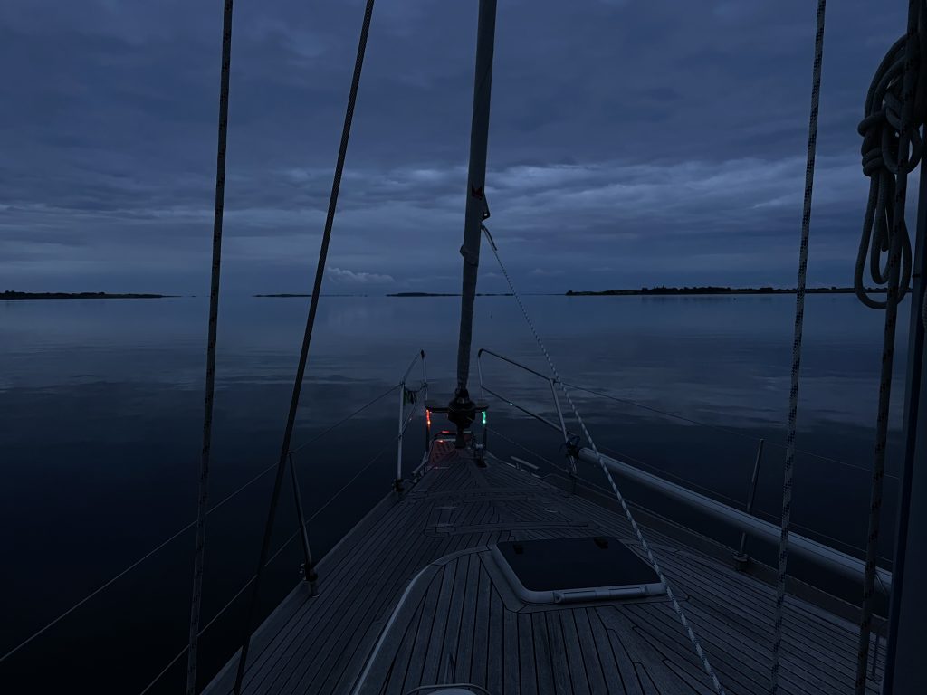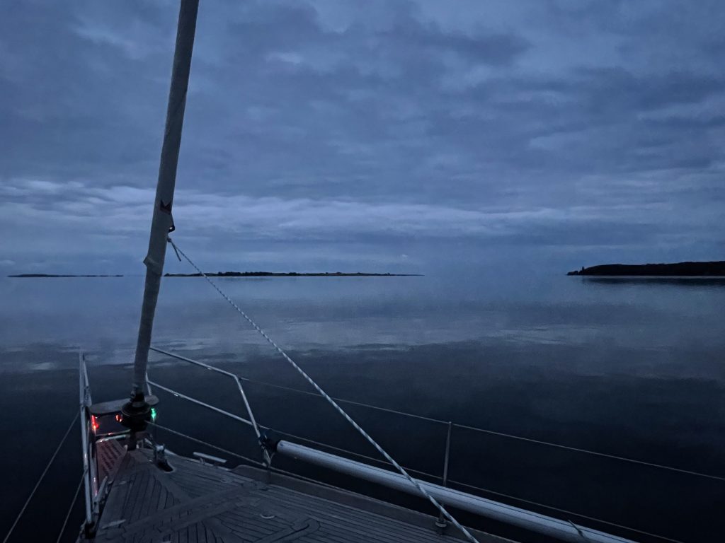 Beim morgendlichen Kaffee um 4 Uhr (!) ist es noch ordentlich dunkel. Doch dann geht es los: wir schleichen uns leise aus dem Hafen. Stromkabel und Fender einholen klappt nahezu lautlos, doch ein etwas unangenehmes Geräusch können wir nicht verhindern: das Quietschen unseres Schiffes zwischen den Dalben. Sorry! Die Box, in der wir liegen, ist in der Breite nämlich so knapp, dass wir uns etwas hindurch quetschen müssen. Die Dalben geben ein wenig nach, unsere Scheuerleiste tut, was sie tun muss und flupp… wir sind draußen und tuckern aus dem Hafen. Und wir sind nicht die Einzigen, die die Gunst – bzw. den ruhigen Wind – der frühen Stunde nutzen.