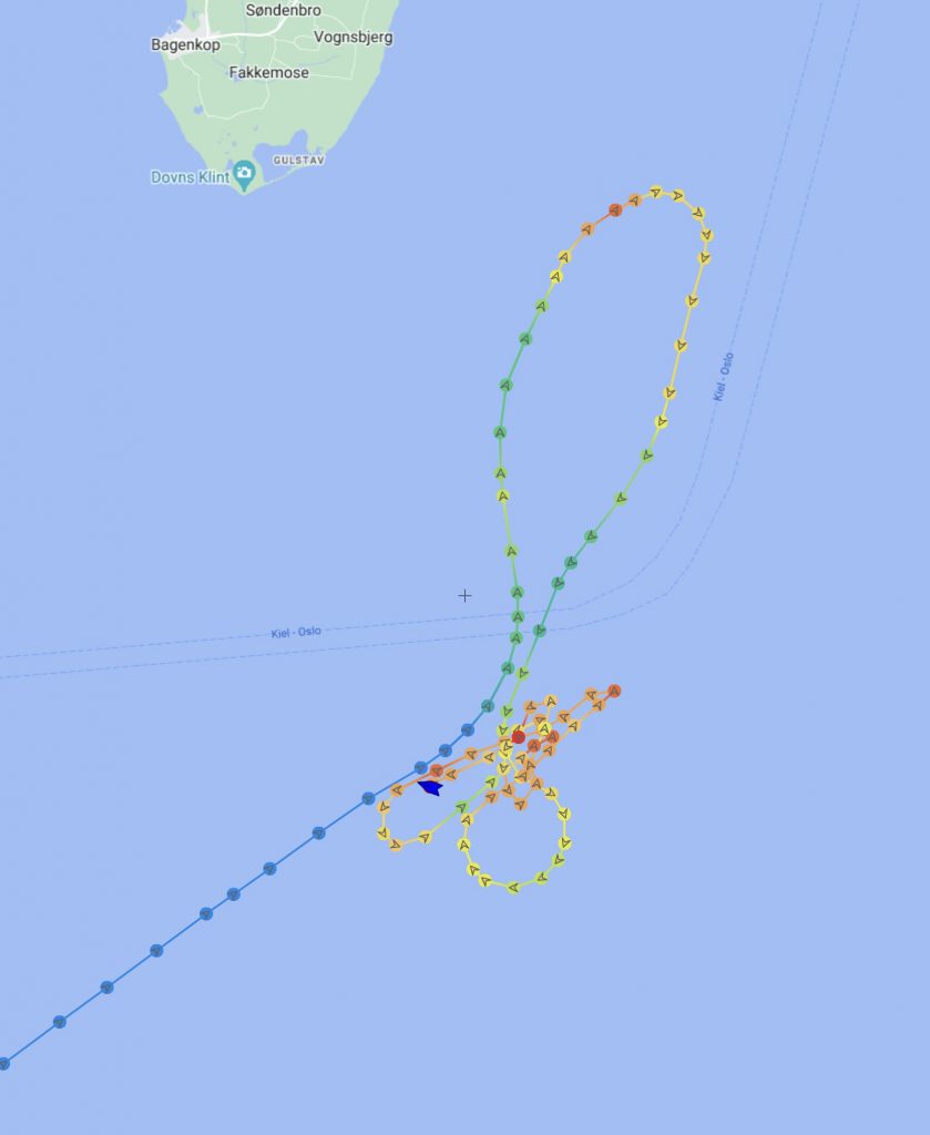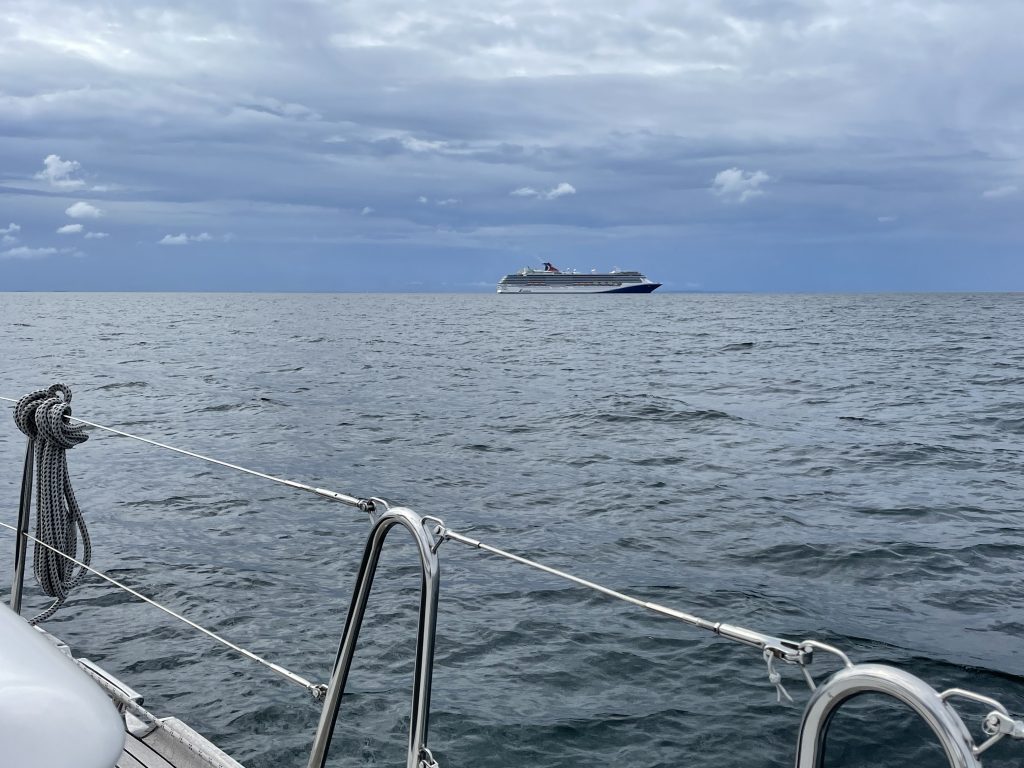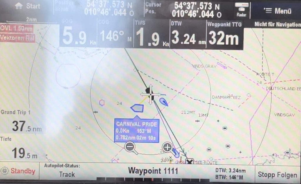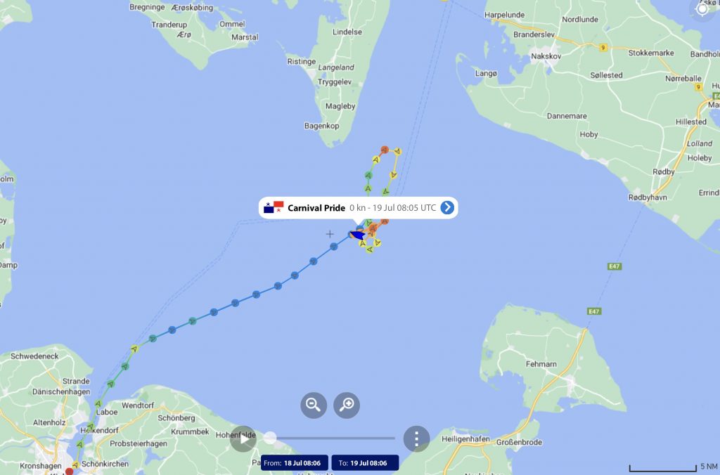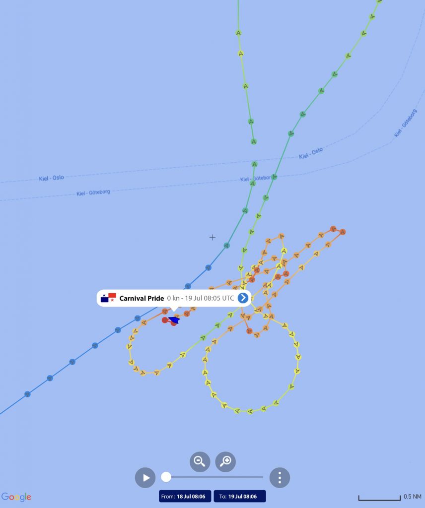 Südlich von Langeland, quasi mitten auf der Ostsee, wundern wir uns über ein großes Kreuzfahrtschiff, dass sich nicht von der Stelle rührt. Normalerweise müssen wir hier immer sehr achtsam fahren, um eine freie Passage zwischen vielen Frachtern, Containerriesen und Kreuzfahrern zu finden, deren Hauptverkehrsweg von Kiel in Richtung Göteborg bzw. Baltikum hier entlangführt. Und jetzt ein Schiff vor Anker? Seltsam. Ein Blick in MarineTraffic sagt uns: die „Carnival Pride“ (eines der kleineren Schiffe der 25-Schiffe-Flotte von Carnival-Cruise-Line, Länge 293m, Breite 32m, max. 2.124 Passagiere, 930 Crew-Mitglieder) liegt hier schon seit über 14 Stunden fest. Nach ihrem Reisestart am Vortag in Kiel (um heute in Göteborg Station zu machen) führten wohl Antriebsprobleme dazu, dass die Reise südlich von Langeland nicht fortgesetzt werden konnte. Jetzt wird fieberhaft nach einer Problemlösung gesucht, die Passagiere müssen auf ihren Besuch in Göteborg verzichten und wir kommen mal dicht an einem Kreuzfahrer vorbei. Später haben wir gesehen, dass die Carnival Pride gegen 16 Uhr ihre Fahrt langesam fortsetzten konnte. Allerdings zurück nach Kiel zur Reparatur.