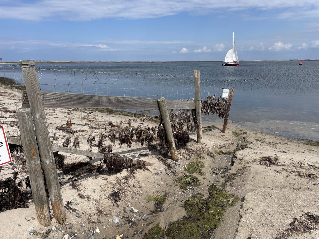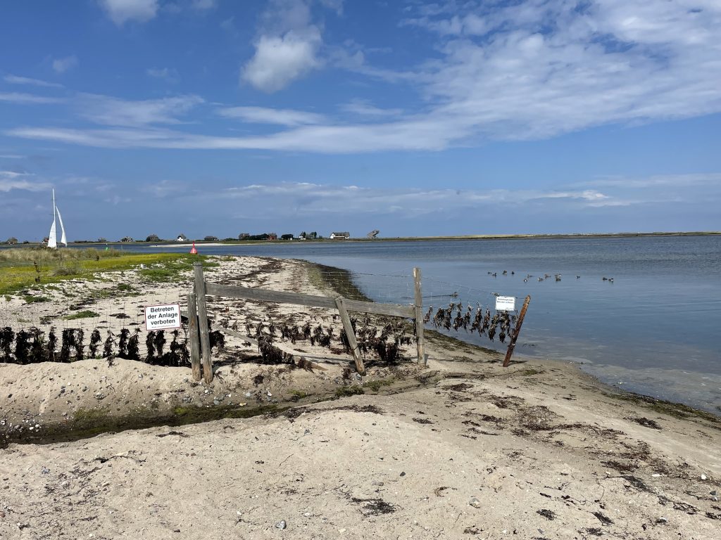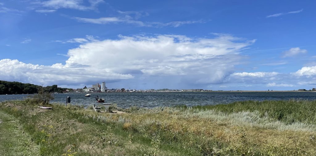 Kalli also ans Telefon und den Raymarine-Verkäufer gefaltet. Nach einiger Bedenkzeit – und vermutlich zusätzlichen grauen Haaren – findet dieser einen halbwegs akzeptablen Preis für das nun außerplanmäßig noch anzuschaffende Autopilot-Modul. Dieses muss jetzt allerdings erst noch bestellt, geliefert und natürlich verbaut werden. Also noch zwei Tage in Ortmühle ausharren und die Aussicht auf das Naturschutzgebiet Graswarder, der Heiligenhafen vorgelagerten Halbinsel, genießen. Das Wetter ist dabei so wechselhaft wie schon die letzten Wochen: heftiger Wind im Wechsel mit (kurzen) ruhigeren Windphasen, Regenschauer im Wechsel mit Sonne, eine Gewitterwolke jagt die nächste…