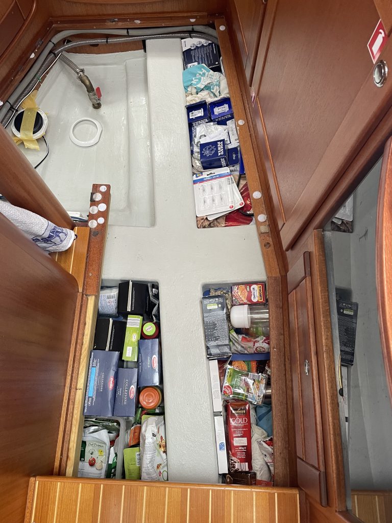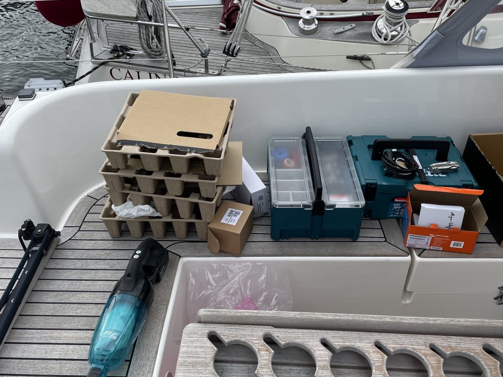 Wir ergeben uns in unser Schicksal und warten auf die Lieferung der notwendigen Installations-Komponenten. Und da der Monteur dafür neue Kabel unter den Bodenbrettern verlegen muß, nutze ich die Zeit, die unter den Brettern verborgenen – gut gefüllten – Stauräume zu leeren und gründlich zu putzen. Wobei… so schlimm ist es garnicht. Nur etwas Staub hat sich angesammelt. Nach der Montage kann ich Inventur machen und alles ist wieder ordentlich.