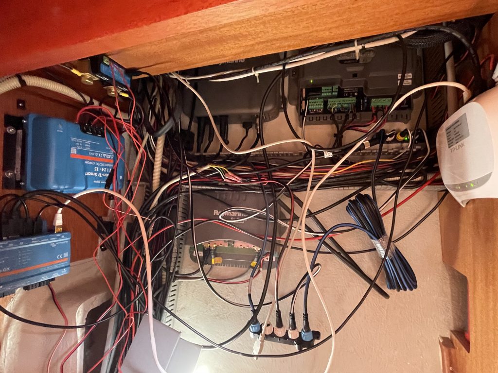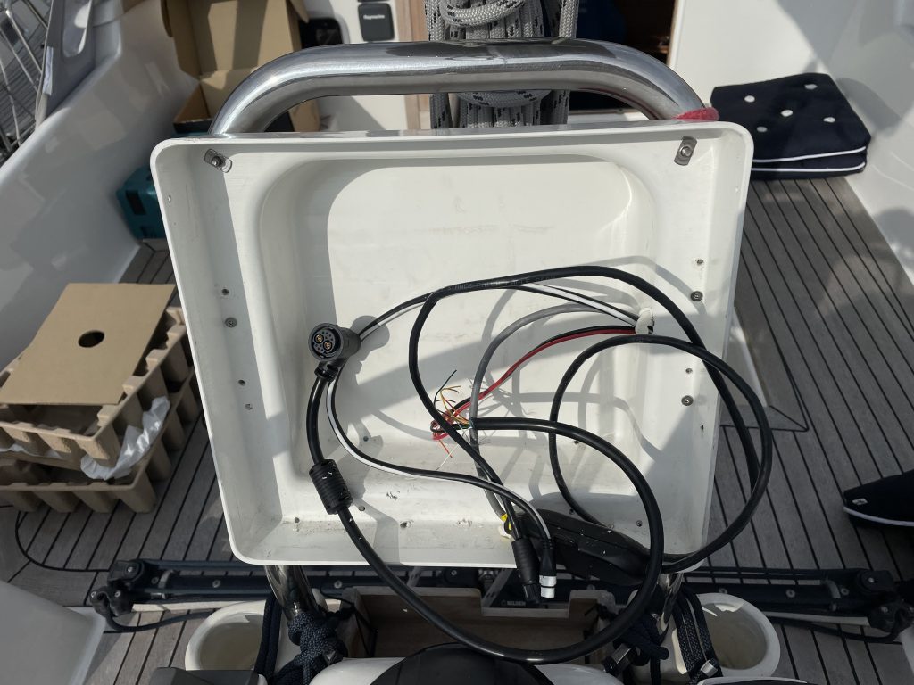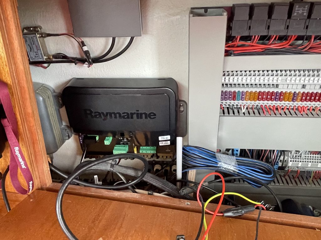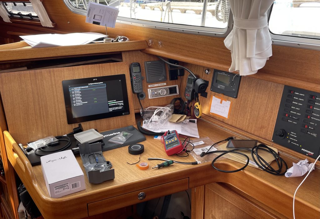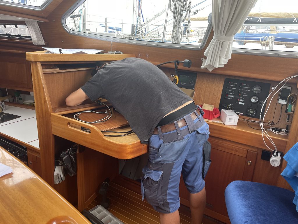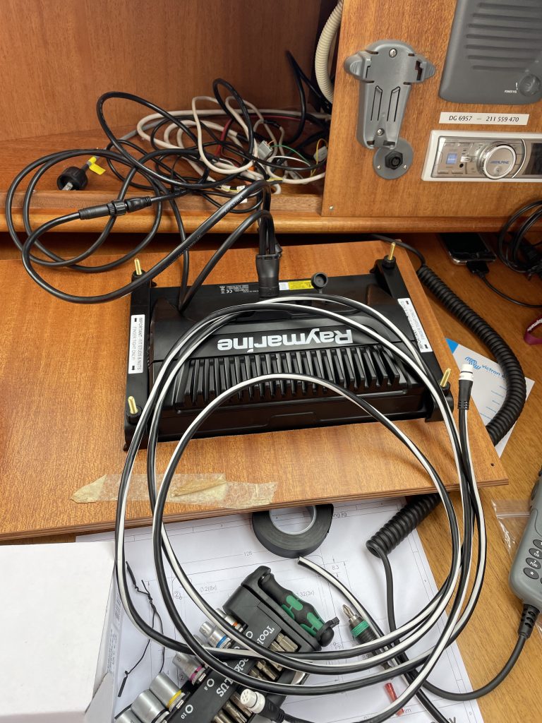 Während einer kurzen Regenpause am Sonntagnachmittag verlegen wir uns an die Werftpier. Pünktlich am Montag ab 08 Uhr macht ein sehr kompetenter Monteur erstmal Chaos an Bord. Doch er ist guter Dinge, alles zur Zufriedenheit einbauen und vor Allem anschließen zu können. Doch es zeigt sich mal wieder der Unterschied zwischen Theorie und Praxis. Aussage des Raymarine-Verkäufers war damals: „der neue Plotter ist ganz einfach zu montieren: das alte Gerät ausbauen, den Stecker ins neue Gerät, wieder einbauen, läuft.“
