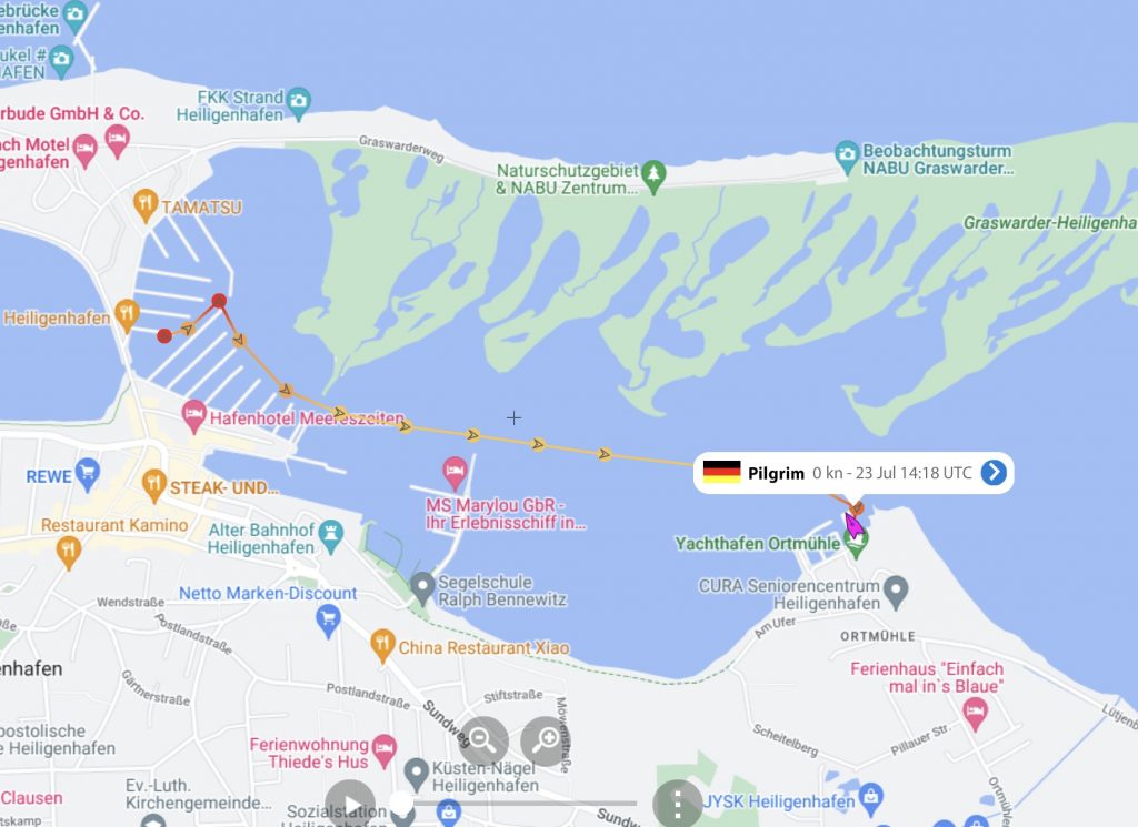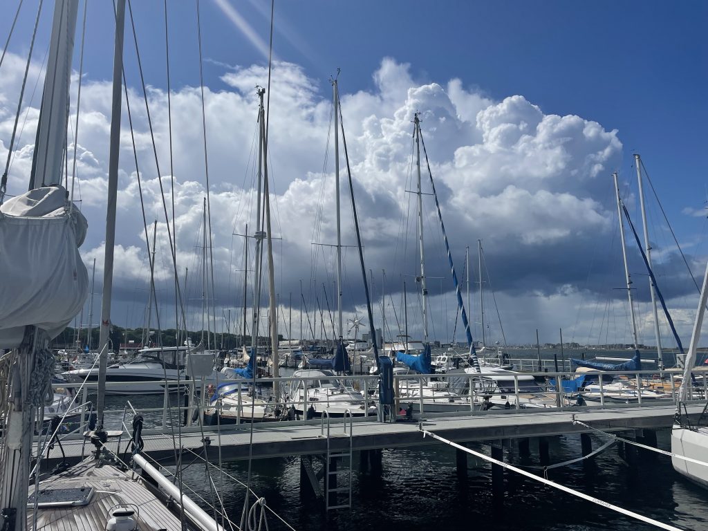 Am nächsten (späten) Morgen/Donnerstag, 20. Juli – wir müssen erstmal etwas ausschlafen – zeigt sich, dass die lange Etappe vom Vortag (10 Stunden, 58sm) doch etwas Gutes hatte: es bläst heftig… die Vorhersage hat mal wieder gestimmt. Ein Lob auf den dänischen Wetterbericht – zum wiederholten Mal! Jetzt sind wir zwar 6 Tage zu früh hier in Heiligenhafen – wir haben für nächste Woche Donnerstag einen Montagetermin zum Einbau unserer neuen Plotter – doch wenigstens sind wir hier und liegen nicht wieder irgendwo in Dänemark bei Starkwind fest mit der Unsicherheit: schaffen wir den Termin? Der ist nämlich schon mehrfach verschoben und jetzt soll alles mal endlich erledigt werden.