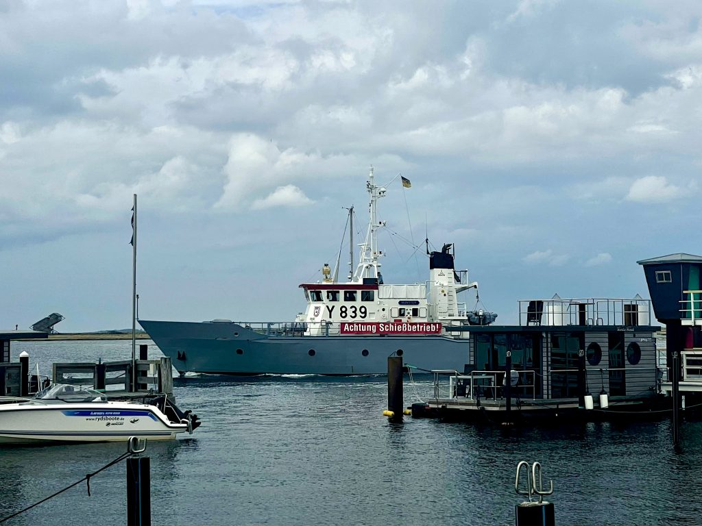 Als wir querab von Fehmarn sind, bekommen wir doch noch ein wenig Segelwind. Wenigstens was, denn die Sonne versteckt sich immer noch ziemlich erfolgreich hinter den Wolken. In Heiligenhafen hat uns dann unser Freund Ferdi wieder einen genialen Platz reserviert – noch breiter, noch länger, noch schönere Aussicht als sonst! Und ein Stegnachbar nimmt uns unsere Vorleinen an: „Hallo, seid ihr das mit dem Reservierungs-Service?“ Das ist doch mal wieder eine tolle Begrüßung! Hier liegen jetzt drei Schiffe nebeneinander, wie sie unterschiedlicher nicht sein könnten: ein großes Motorschiff, unser gemütliches Komfort-Segelschiff und eine Rennziege.