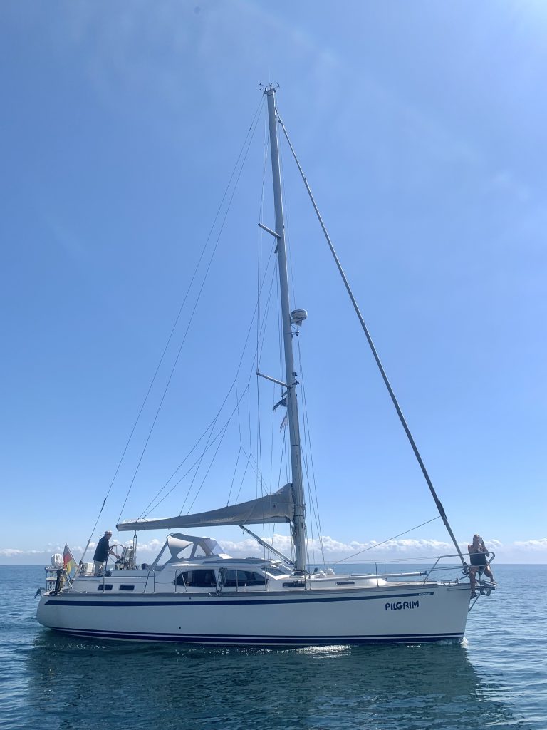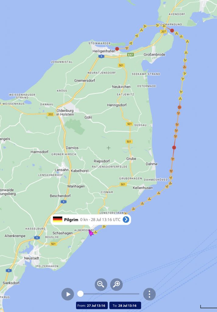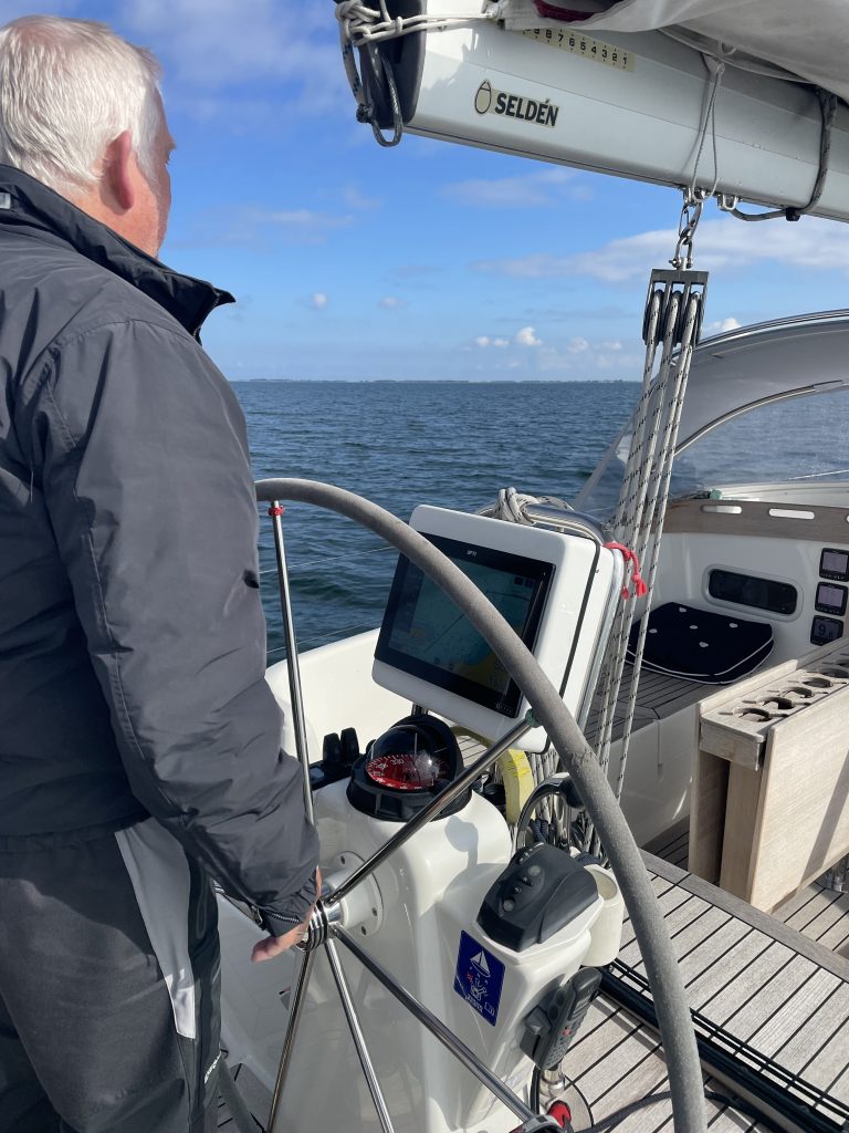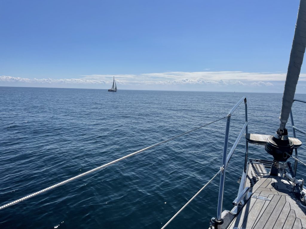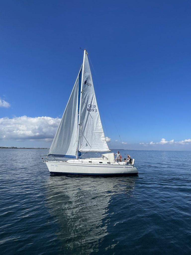 Am Freitag, 28.07.23, dann los gen Heimathafen. Wind ist mal wieder fast Null… wie sollte es auch anders sein. Es ist, wie in den vergangenen Wochen auch schon: entweder 5-7 Beaufort oder 1-2 Bft. Heute also mal wieder 1-2 Bft.Immerhin Sonnenschein, das ist doch schon mal was. Häufig haben wir kurz vor der Ankunft in Grömitz nochmal Regen oder Gewitterböen, heute ist alles gut. Wind und Wasser sind so ruhig, dass wir unterwegs noch die für die neue Navigation notwendige Kalibrierung durchführen können. Dafür muss man in einer bestimmten Geschwindigkeit einen großen Kreis fahren, damit der neu eingebaute Fluxgate-Kompass (ein elektrischer Kompass) das Schiff und die Umgebung kennenlernt, entsprechende Störungen durch Metall, Stromkabel etc. ausgleicht und dann korrekte Werte an die Navigation liefert. Dafür ist das Wetter heute ideal (ich muss ja auch mal was Gutes über das Wetter sagen).