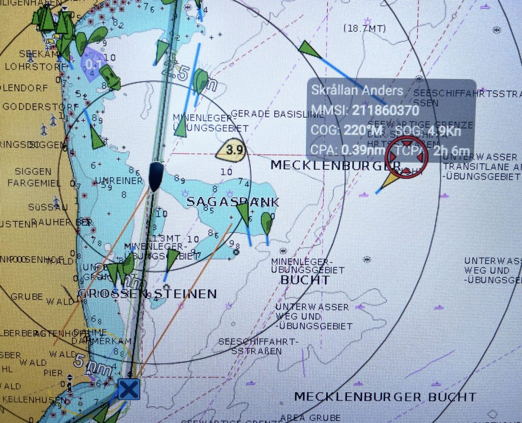 Und noch was Positives: unterwegs sehen wir nochmal einen Schweinswal und sogar einen Seehund! Versöhnlicher Abschluss des Urlaubstörns. Aber es kommt noch besser: wir bekommen eine Nachricht von der Skrållan Anders – das Segelschiff, mit dem wir den Urlaubstörn gemeinsam begonnen haben. Sie sind ebenfalls auf dem Weg zurück nach Grömitz, haben uns auf ihrem AIS entdeckt und schlagen ein Treffen auf See vor. Was für eine klasse Idee und toller Zufall! Gemeinsam die Reise beginnen und gemeinsam wieder im Heimathafen einlaufen! Sie sind heute morgen um 05 Uhr in Gedser/DK gestartet, um das regen- und gewitterfrei angekündigte Wetter für ihre lange Heimfahrt zu nutzen. Und nun sind wir zum gleichen Zeitpunkt an der Ost-Tonne „schwarzer Grund“ vor Dahmeshöved !!