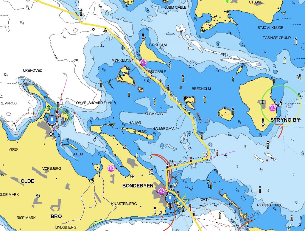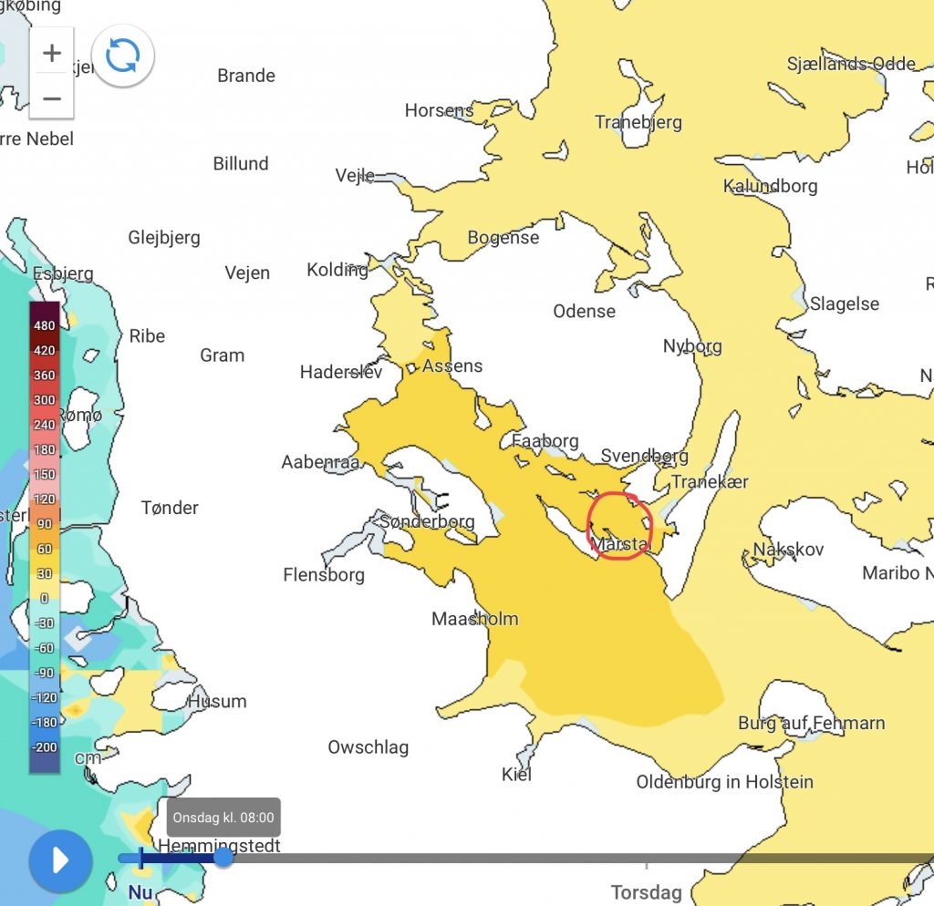 Vor dem Ablegen haben wir nicht nur die Windvorhersage, sondern auch die Wasserstandsvorhersage gecheckt. Die Wasserstände schwanken hier nämlich so um 20-40 cm – und das mal nach oben, und mal nach unten. Wir haben das die letzten Tage schon gemerkt: mal ein Schritt vom Schiff nach oben auf den Steg, mal ein Schritt ebenerdig oder sogar etwas nach unten. Und da ich unseren Kurs gerne mal wieder durch einen kleinen und flachen, aber gut betonnten Weg zwischen den Inseln östlich von Ærø hindurch planen will, sind mir 20cm mehr Meerwasser unterm Kiel schon deutlich lieber, als womöglich ein geringerer als normaler Wasserstand. Wir haben Glück… die Vorhersage paßt zu unserem Plan und so können wir den gewundenen Weg zwischen den kleinen Inselchen und Sandbänken hindurch genießen – wir haben immer genügend Wasser unter’m Kiel.