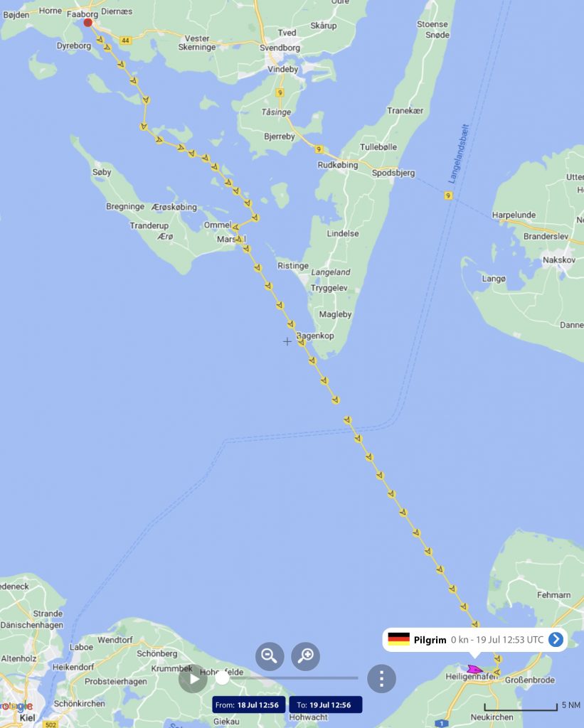 Am Mittwoch, den 19. Juli, soll es nun endlich mal weitergehen. Immerhin brauchen wir für die letzte Nacht keine Hafengebühr bezahlen: jede 5. Nacht ist in Fåborg frei! Das ist doch mal was. Der Wind soll sich für einen Tag etwas beruhigen – sagt die Vorhersage – und soll dann wieder mit mindestens 6 Bft. über uns hinwegziehen… nicht die richtige Stärke für einen entspannten Segeltag über die Kieler Bucht. Die Windrichtung würde ja noch passen, aber eine ordentliche Welle von der Seite würde uns den ganzen Tag begleiten. Das ist dann ganz schön anstrengend und vor Allem aber ungemütlich.