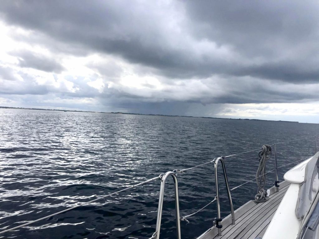 Als wir Marstal passieren, verlassen mehrere Segler den Hafen. Es ist mit 08.30 Uhr „normale“ Ablege-Zeit – wir haben aber schon 20 sm (eine gemütliche Tagesetappen-Länge) hinter uns. Leider müssen wir motoren, denn der Wind bleibt in seinem nächtlichen Ruhemodus. Das Wetter ist dabei überhaupt nicht sommerlich. Es drohen immer mal wieder dunkle Regenwolken, doch sie regnen sich über Land ab und wir bleiben verschont. Aber Sommer geht echt anders.