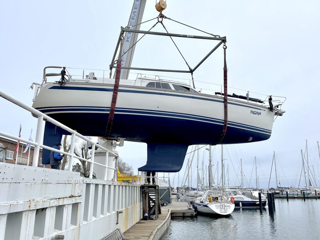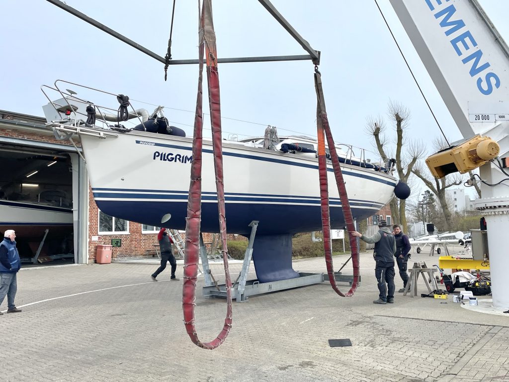 Am Mittwoch, den 03. April ist es dann auch für uns soweit: die Werft-Jungs machen wieder einen super Job und bringen unser schwimmendes Zuhause gut gepflegt und gewartet und für uns stressfrei ins Wasser. Unser Dazutun beschränkt sich auf interessiertes Beobachten, fotografieren und die Übergabe eines großen Bahlsen-Kekspakets – gerne genommene Nervennahrung für die Werft-Mannschaf