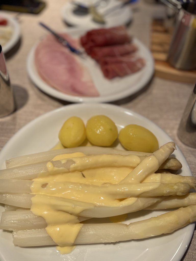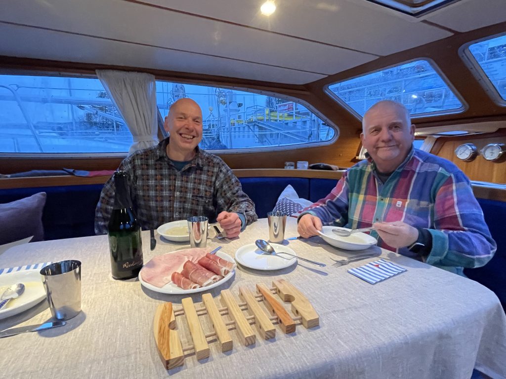 Wir machen uns daran, Lebensmittel, Kleidung und was sonst noch so an Bord muss einzuräumen. Und dann endlich die verdiente abendliche Belohnung nach einem langen Tag: wir genießen, gemeinsam mit Thorsten, den ersten Spargel der Saison bei uns an Bord. Bei leckeren Getränken – besonders Thorstens selbst gemachter Eierlikör sei hier erwähnt 😋 – haben wir einen kurzweiligen Abend, der uns bestimmt in guter Erinnerung bleibt.