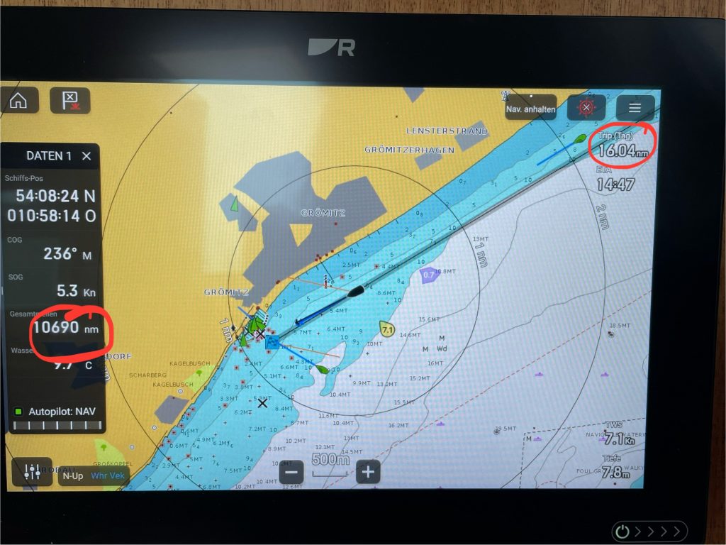 Ach übrigens… finde den Fehler auf den beiden Fotos! Der Blick auf unseren Plotter verheißt nichts Gutes. Das Software-Update hat das Problem jedenfalls nicht gelöst. Aber mit der Fehlersuche können wir uns ja die Saison über befassen.