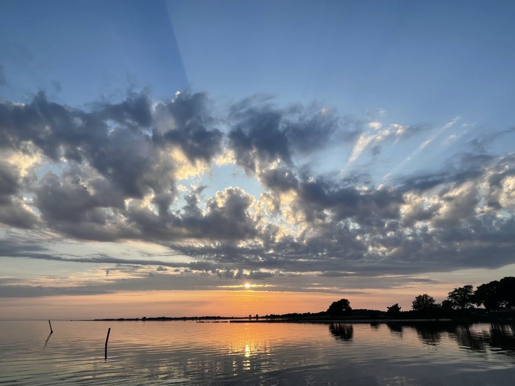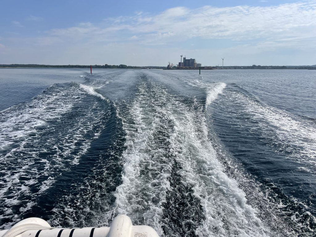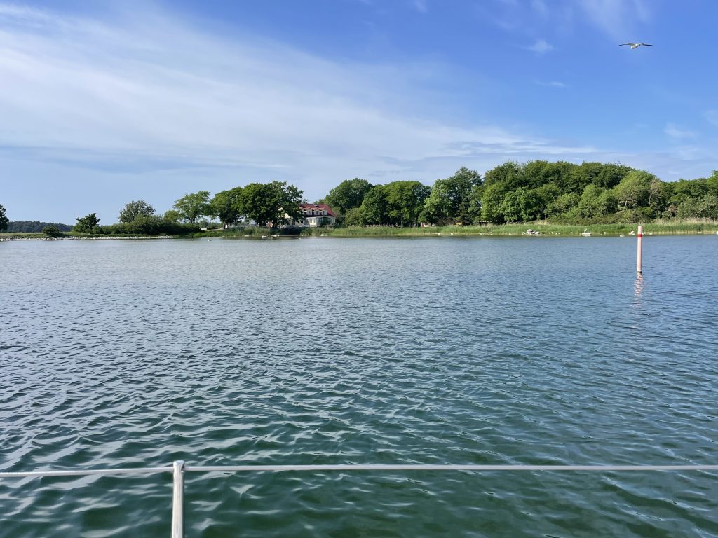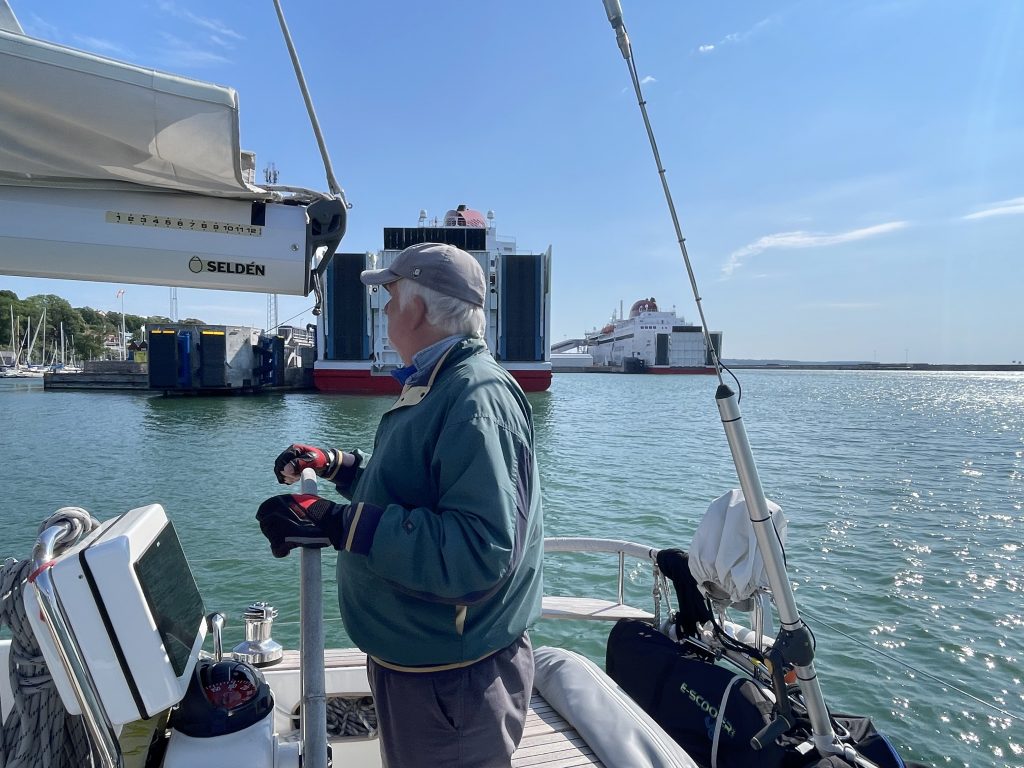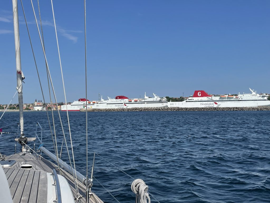 Weit und breit kein Land. Nur Wasser, soweit man schaut. Und Sonne. Und ab und an ein Frachter und eine Fähre. Was für ein grandioser Tag! Je näher wir der Insel Gotland kommen, desto wärmer wird es. Die letzte Stunde haben wir den Eindruck, von einem warmen Föhn angepustet zu werden. Der Wind legt nochmal etwas zu und ist erheblich wärmer geworden. Solch eine plötzliche Temperaturveränderung haben wir so noch nicht erlebt.