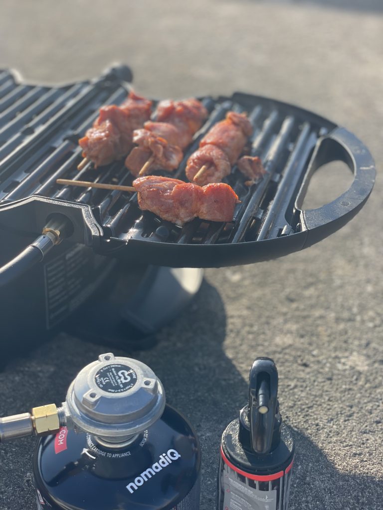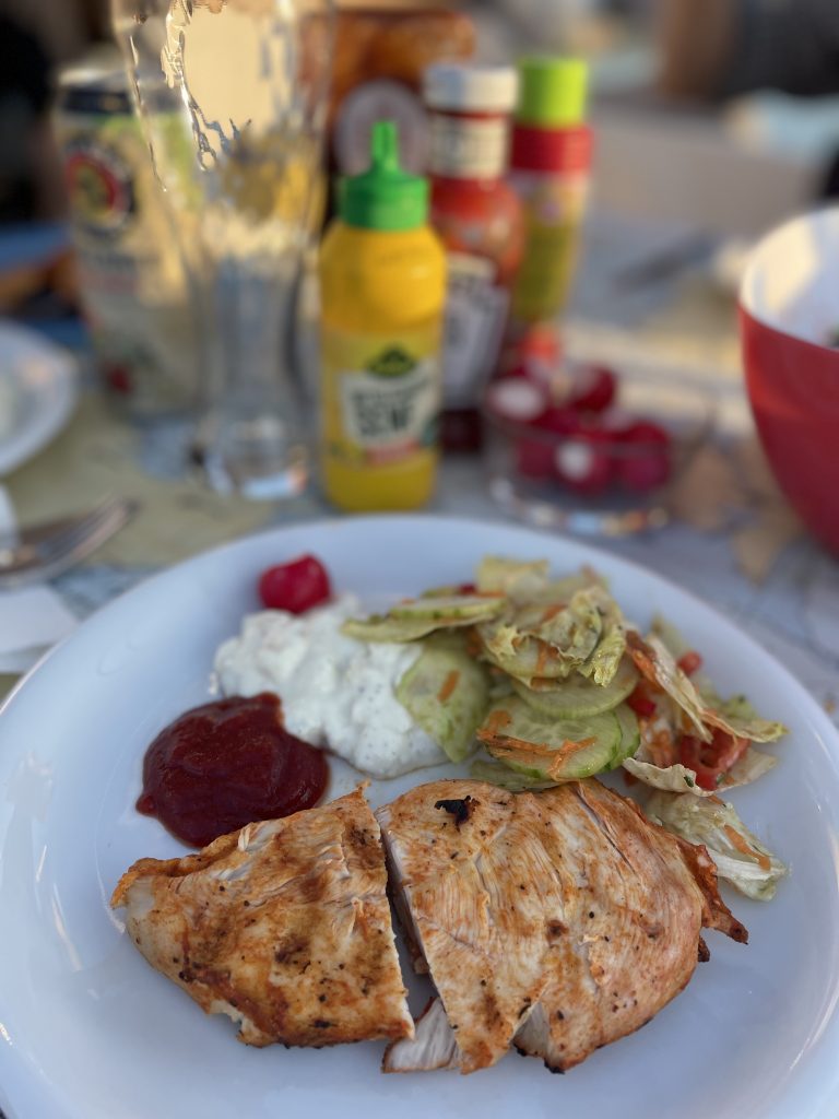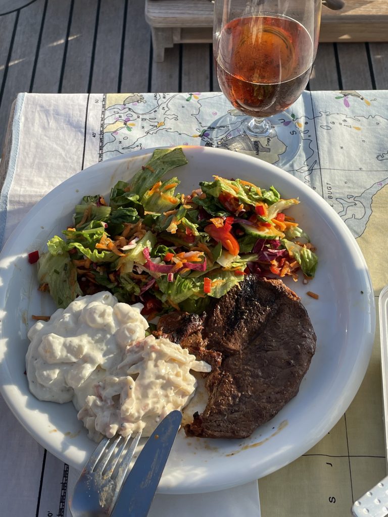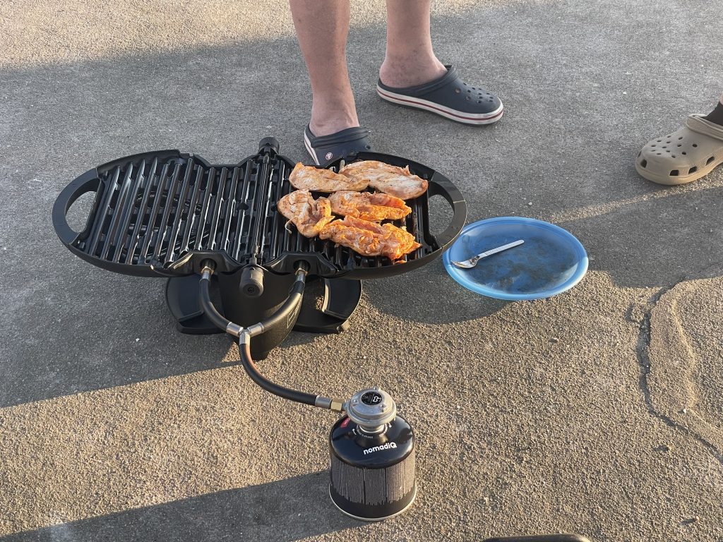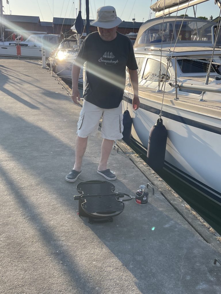 Nach dem langen Tag – wir waren gut 8 Stunden unterwegs – haben wir zum Kochen keine Lust mehr… nur noch etwas im Cockpit entspannen und die Stadt auf uns wirken lassen. Aber der kleine Hunger macht sich bemerkbar und so weihen wir unseren Grill-Neuzugang ein. Auf der diesjährigen ABF-Messe (eine Freizeitmesse in Hannover, immer Anfang Februar) hat uns ein smarter Verkäufer von seinem Produkt überzeugt. Ein kleiner Gasgrill, platzsparend zusammenzufalten und damit gut zu verstauen. Jetzt muss er zeigen, was er kann. Klappt gut.