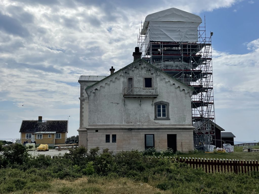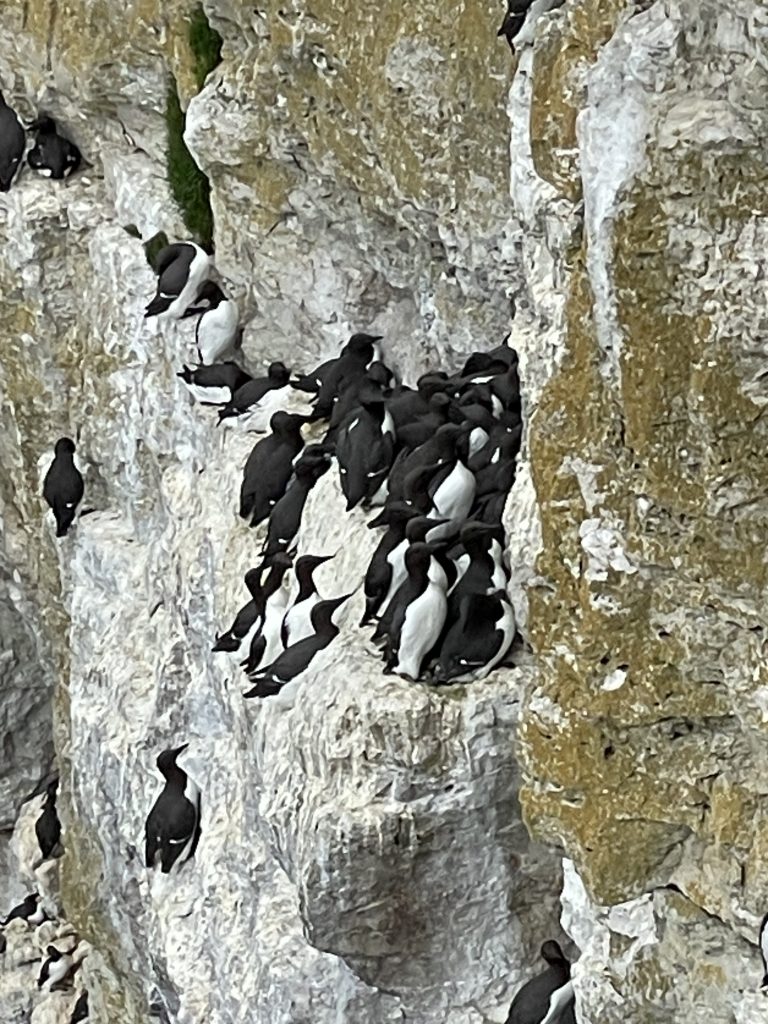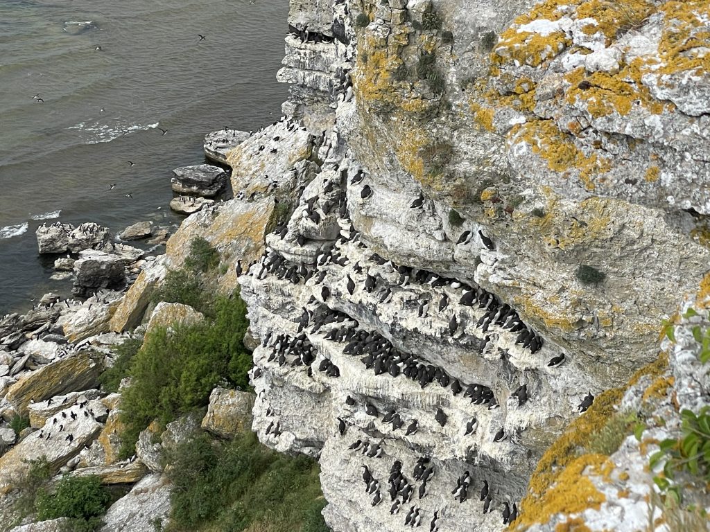 Die angekündigten Gewitter kommen tatsächlich, und das mit ordentlich Wind im Gepäck. Sie ziehen glücklicherweise aber an der Insel vorbei. Als ich oben beim Leuchtturm bin – wird leider grad renoviert und kann daher nicht besichtigt werden – pfeift ordentlich Wind über das Hochplateau und um die Steilhänge. Ich muss erstmal auf Abstand zum Abhang gehen. Die Fotos der Trottel-Lummen müssen warten, bis sich der Wind wieder etwas beruhigt hat. Die Kolonie der Trottel-Lummen an der 50m hohen Steilwand stört der Wind nicht – sie sind das gewöhnt. Hier auf der Insel soll es übrigens die größte Population der gesamten Ostsee geben!