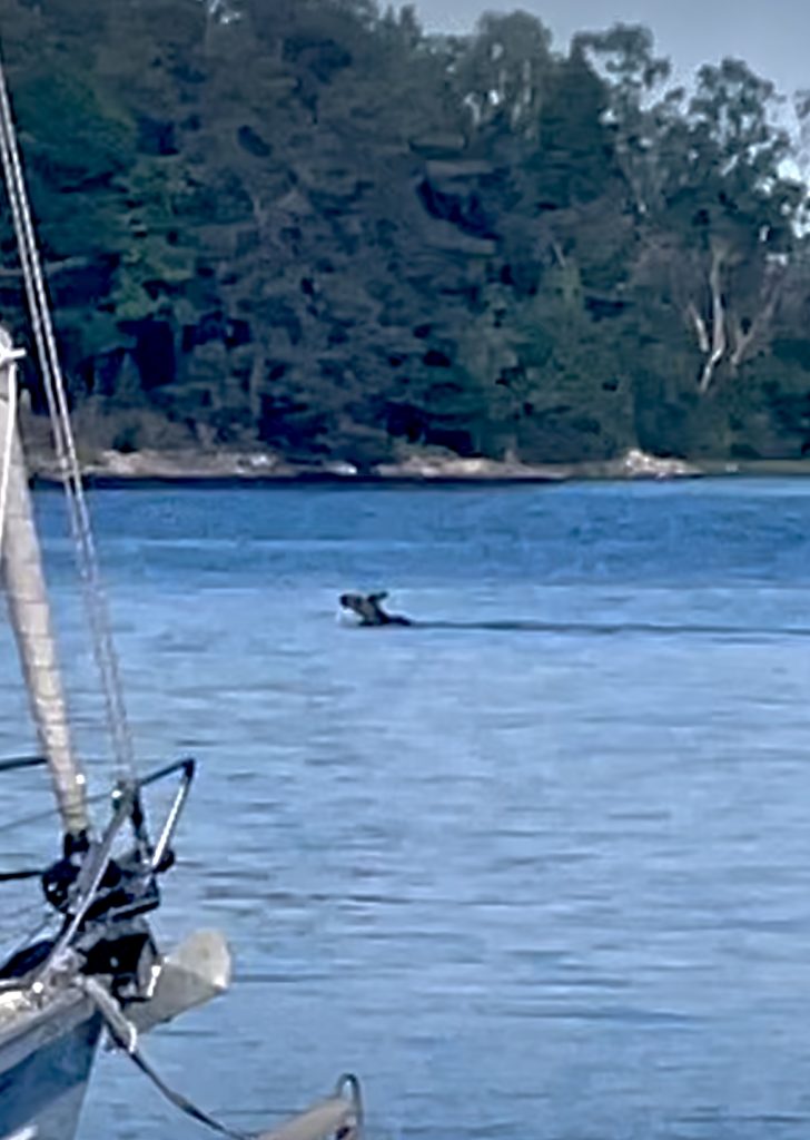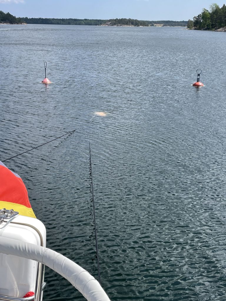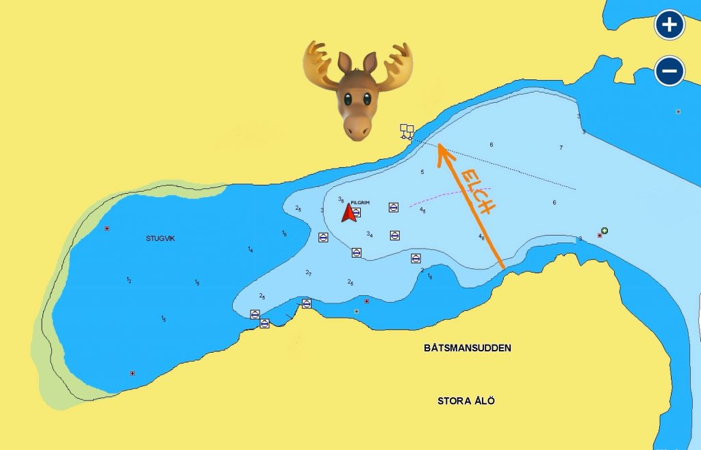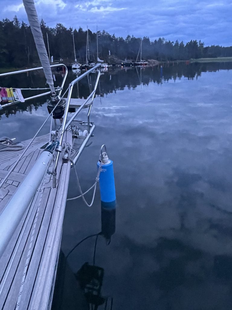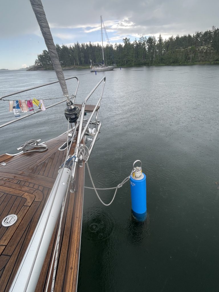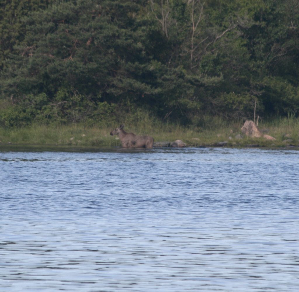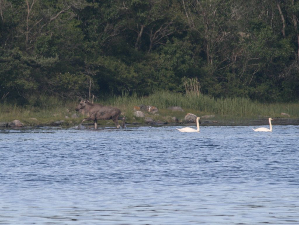 Unser Plan geht auf und wir kommen nur wenig nass in unserer angepeilten Ankerbucht an. Und es sind mehrere Ankerbojen frei! Es ankern hier zwar auch einige andere Schiffe, doch wir sind alle weit auseinander. Keiner stört den Anderen So wollten wir das. Und noch besser: kaum fest, lunst die Sonne wieder durch die Wolkendecke und unsere Sachen sind schnell getrocknet. Und dann stellt sich ein wohliges Gefühl ein: idyllische Umgebung, Ruhe, immer wieder ein anderer Blick vom Schiff aus. Der sanfte Wind läßt uns mal hierhin, mal dorthin um unsere Ankerboje treiben. Mal beobachten wir Fischreiher an dem einem Ufer, dann Schwäne am anderen Ufer, dann entdeckt Kalli sogar die Finne eines Schweinswales ganz in unserer Nähe. Doch die genauere Betrachtung zeigt: EIN ELCH SCHWIMMT DURCH UNSERE BUCHT !!!