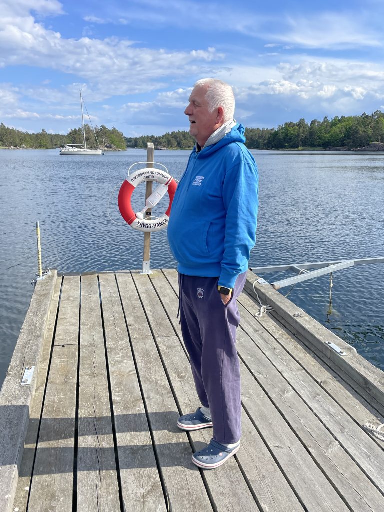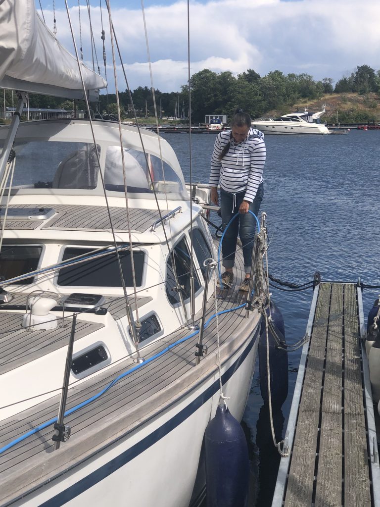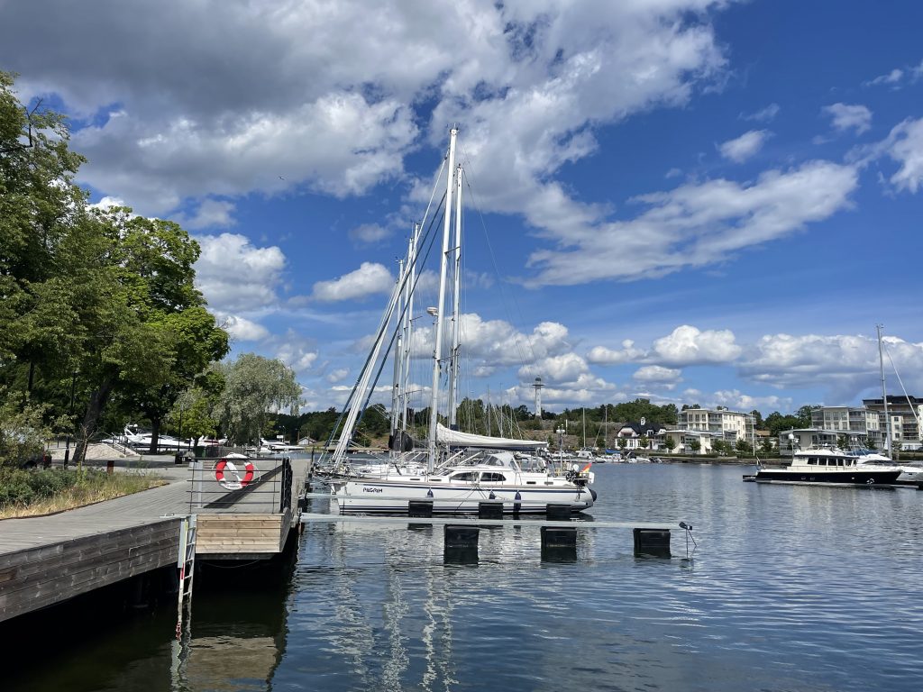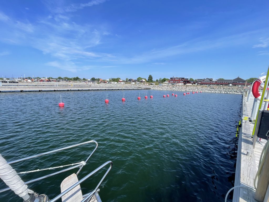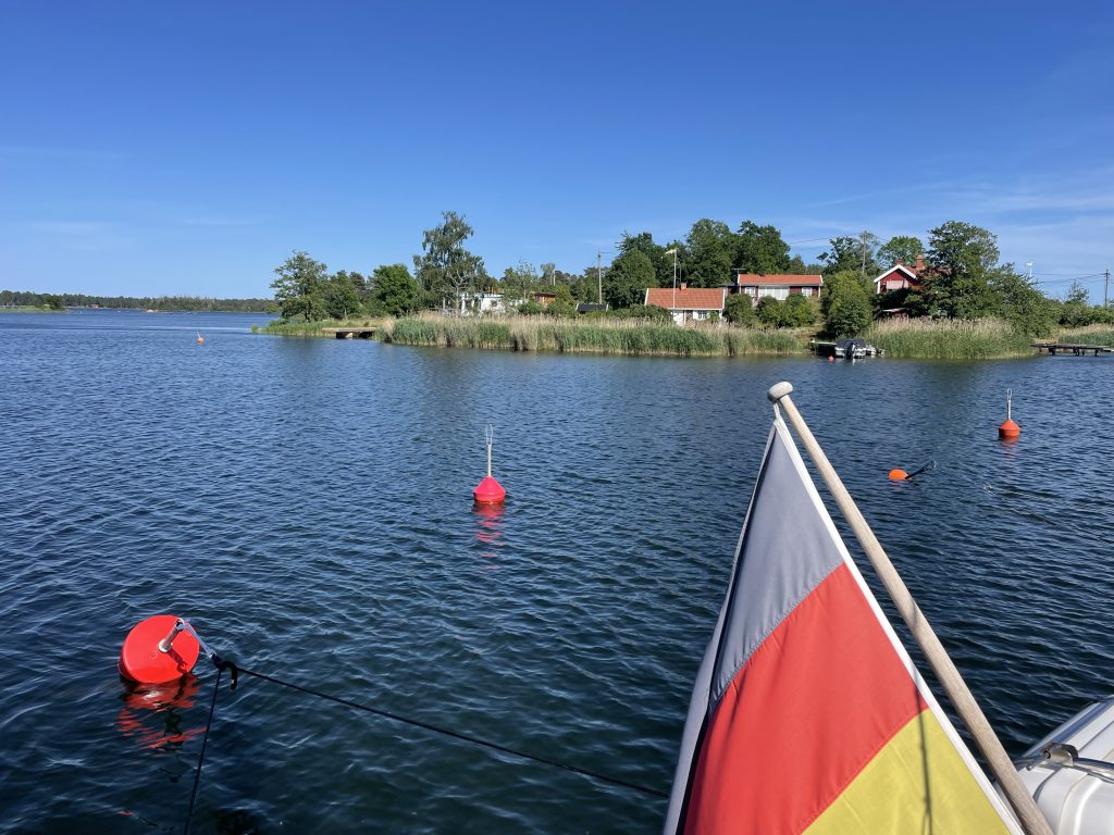 Die von uns genutzte Heckboje scheint uns nach einigen plötzlich und heftig einfallenden Böen nicht mehr sehr vertrauensvoll. Beim Kampf mit unserem Schiffsgewicht wird sie ziemlich weit unter Wasser gezogen und wir haben nicht das richtige Zutrauen in ihre Haltekraft. Also Heckleine einfach lösen und das Schiff längs an die Pier treiben lassen. Klappt prima. Ein zufällig vorbei tuckernder Schlauchbootfahrer löst uns dann netterweise unsere Leine von der Heckboje, denn sonst hätten wir ganz ablegen, zur Boje fahren und wieder neu anlegen müssen. So war’s deutlich einfacher – Tack så mycket!
