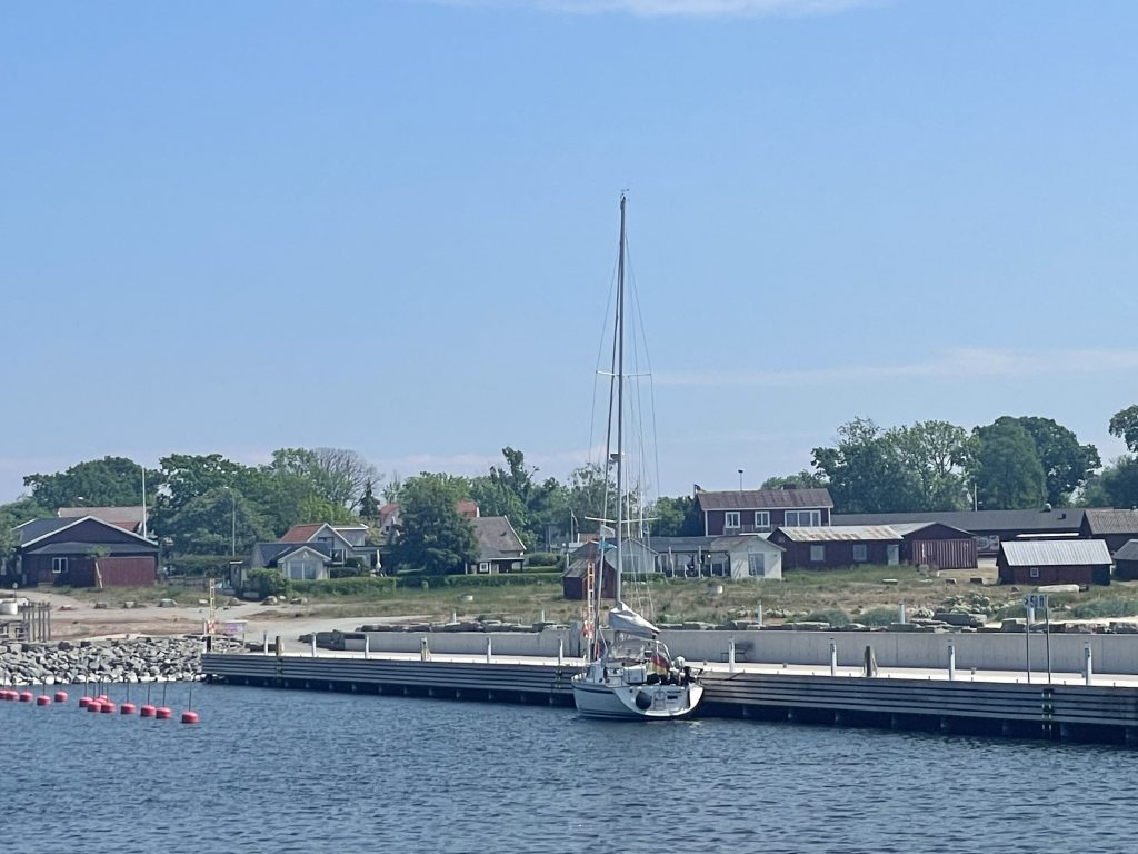 Klintemåla sieht von weitem schon so verschlafen aus, wie es sich dann auch aus der Nähe darstellt. Ein Schild besagt: „Saison beginnt erst am 15. Juni. Strom und Wasser sind aber schon angeschlossen, Hafengebühr bitte in den Briefkasten beim Hafenbüro. Dann Frederik anrufen, der gibt die Code-Nummer für’s Sanitärgebäude raus.“ Na gut, kriegen wir alles hin.