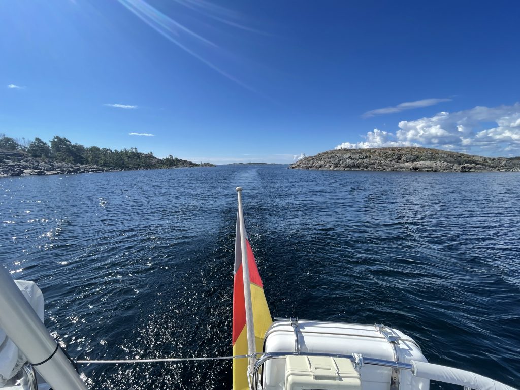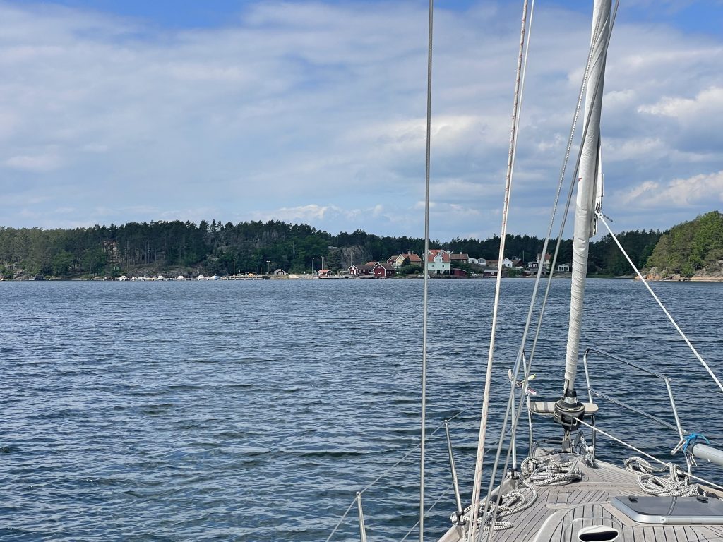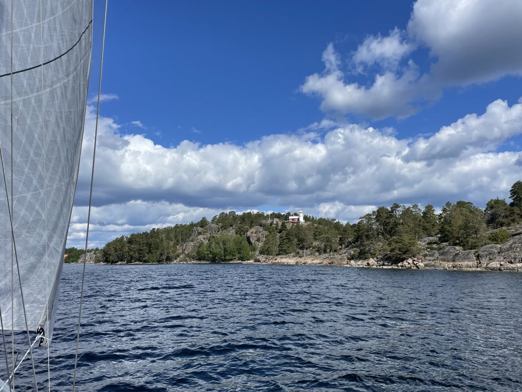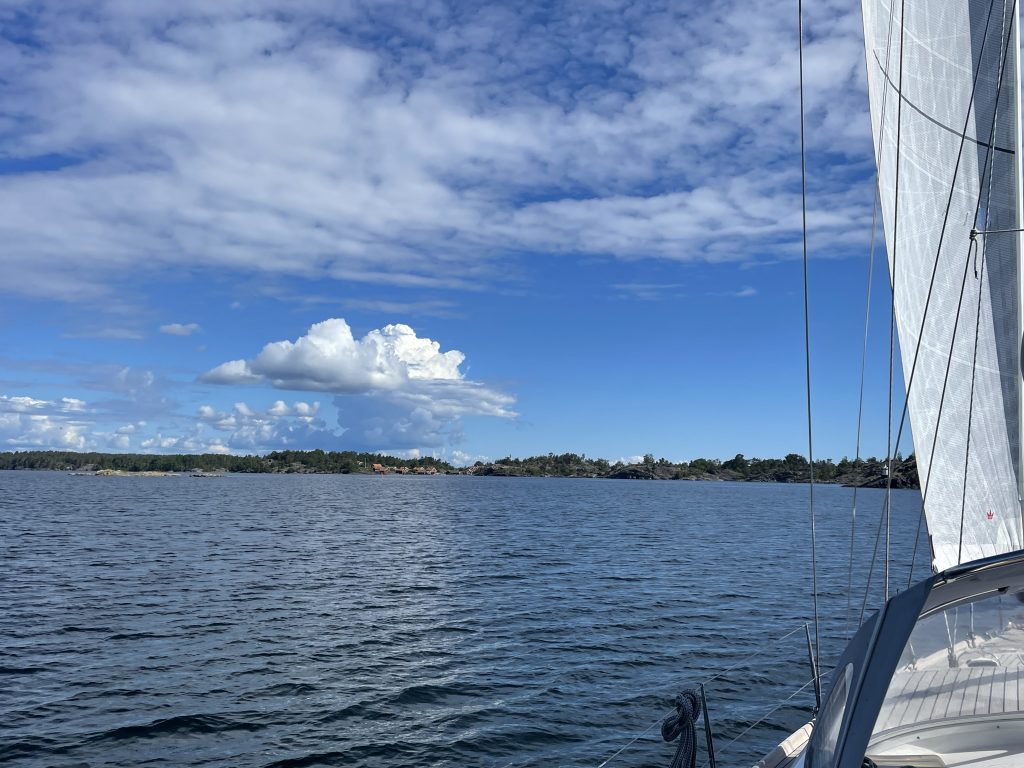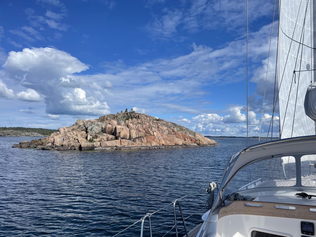 Als wir aus der nach allen Seiten gut geschützten tiefen Bucht um Figeholm herauskommen, ist schon merklich mehr Wind und so können wir Motor- gegen Segelantrieb tausche. Wir gleiten mit raumem Wind außerhalb des Schärengürtels gen Norden, um dann einige Zeit später wieder in das Felsengewirr einzutauchen.