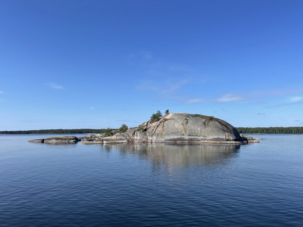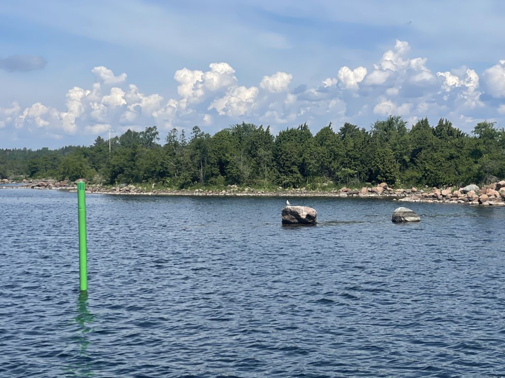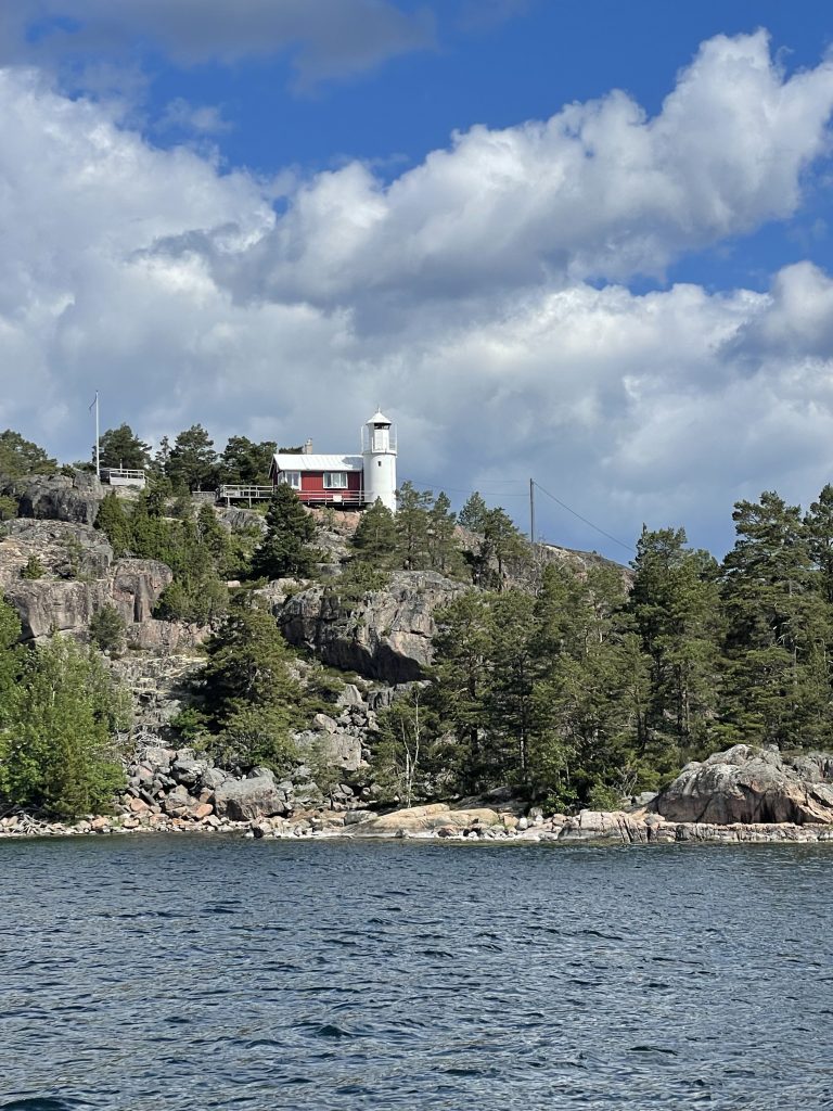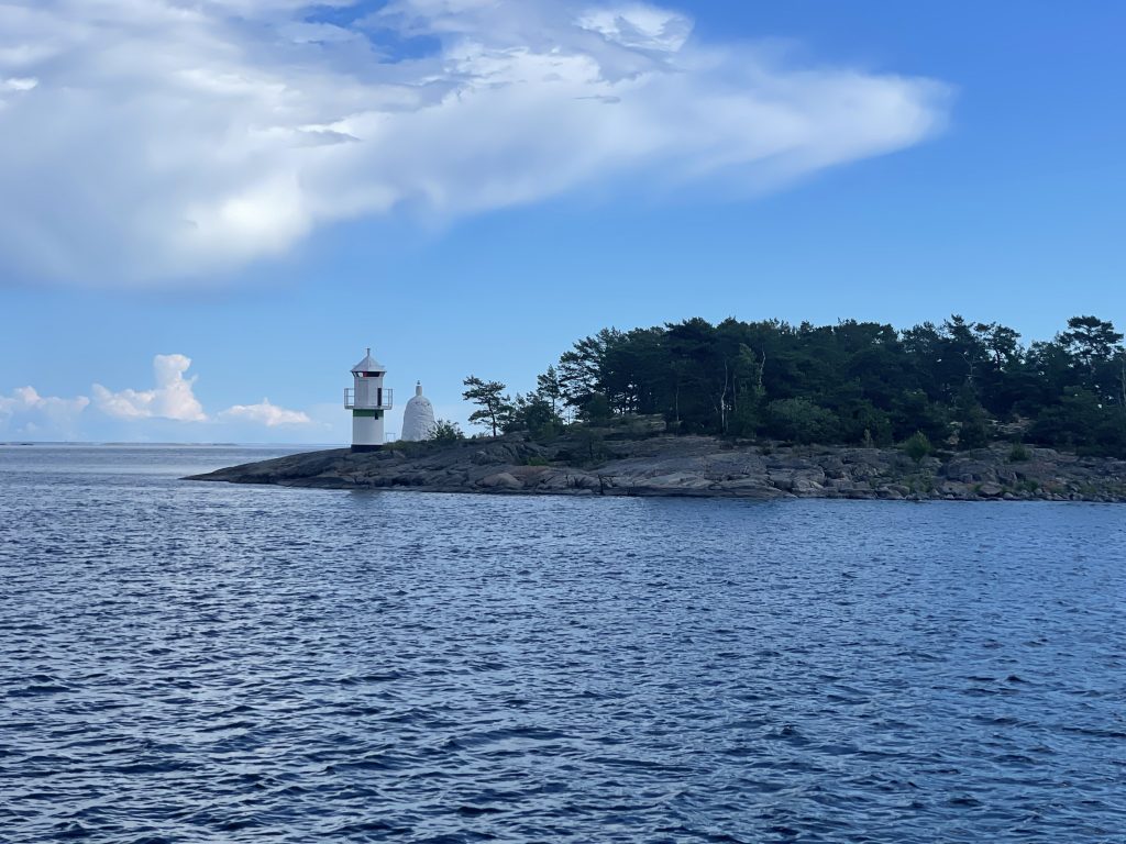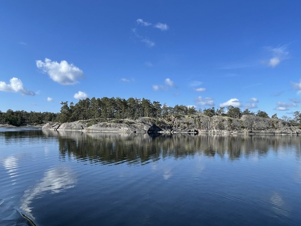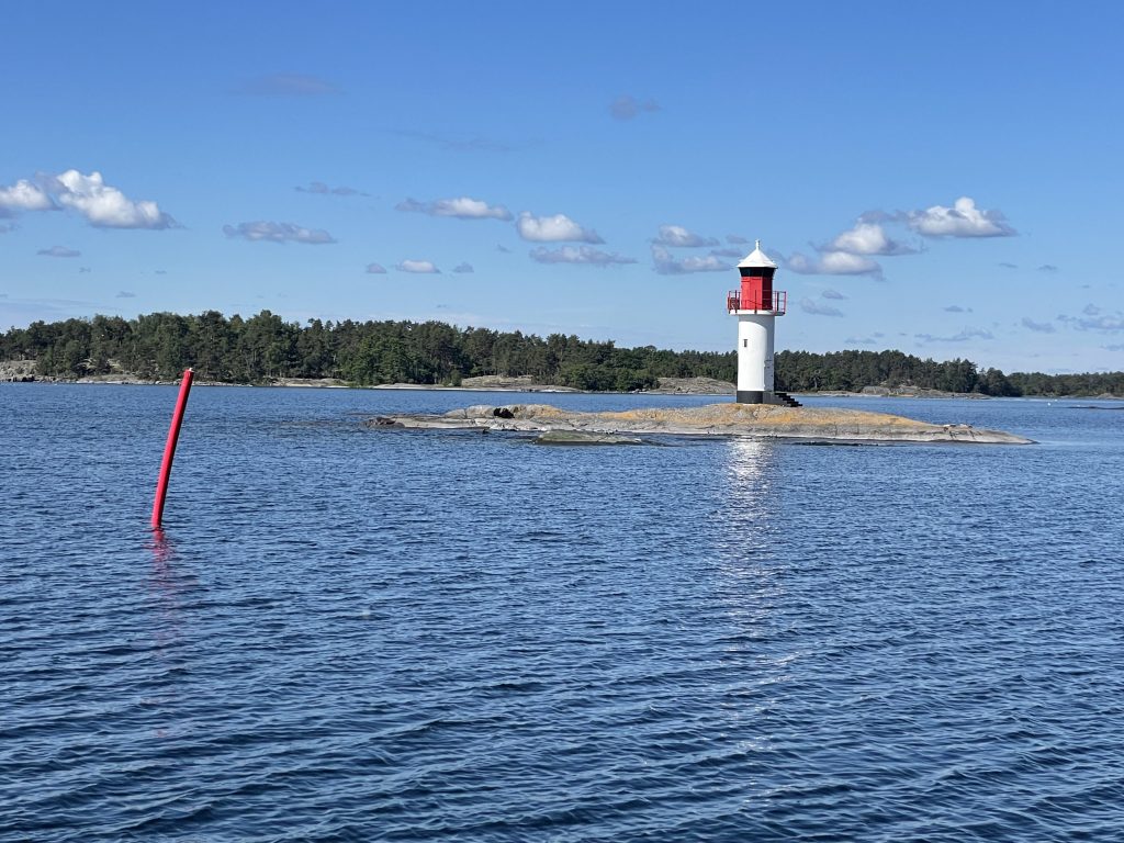 Als wir aus der nach allen Seiten gut geschützten tiefen Bucht um Figeholm herauskommen, ist schon merklich mehr Wind und so können wir Motor- gegen Segelantrieb tausche. Wir gleiten mit raumem Wind außerhalb des Schärengürtels gen Norden, um dann einige Zeit später wieder in das Felsengewirr einzutauchen.