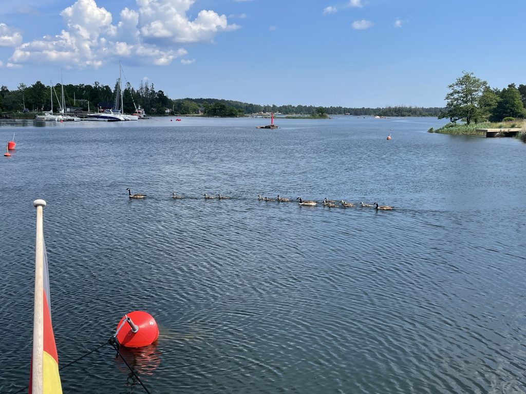 Und dann geht es endlich in die Schären! Unser Ziel heißt Figeholm, ein kleiner Ort mit liebevoll gepflegtem kleinem Hafen mit Gästeplätzen, rührigen Vereinsmitgliedern, die sich beim Job als Hafenmeister abwechseln (und auch Eis verkaufen!), gute Waschmaschine-Trockner-Combi, ein Supermarkt in bequemer zu-Fuß-Entfernung und ein kleines italienisches Restaurant. Und Sonne… nach dem Festmachen wird sofort der Sonnenschirm aufgebaut. Also was wollen wir mehr. Idylle, schöne Aussicht und Gänse-Eltern mit vielen Küken gibt es gratis noch obendrauf.