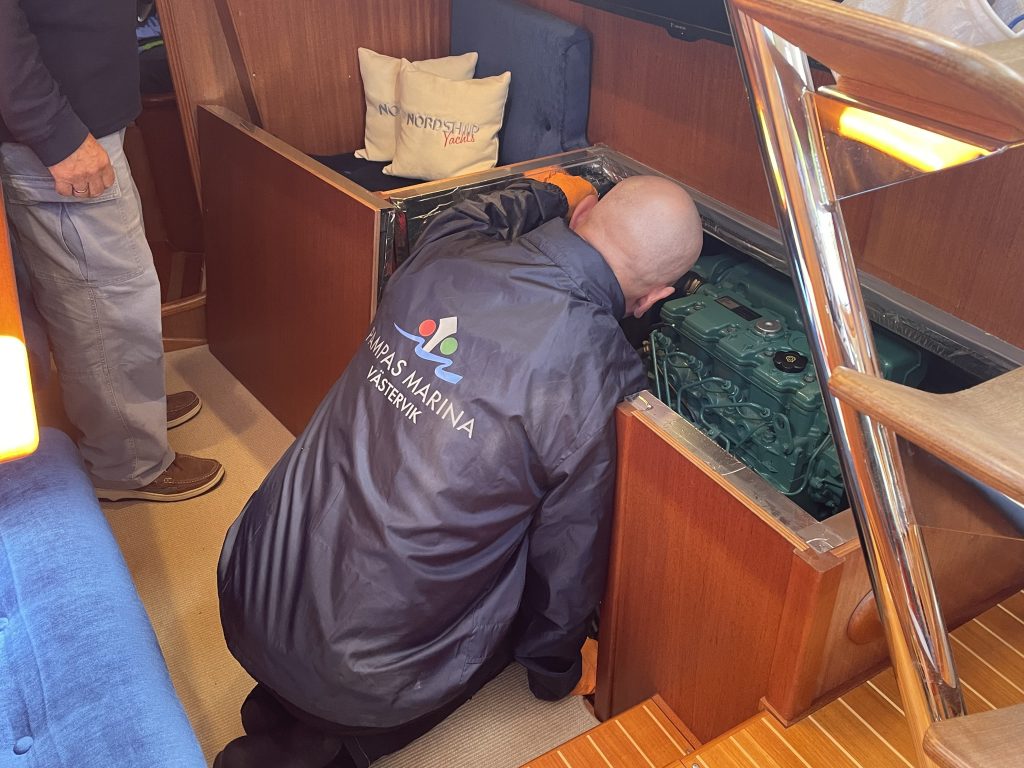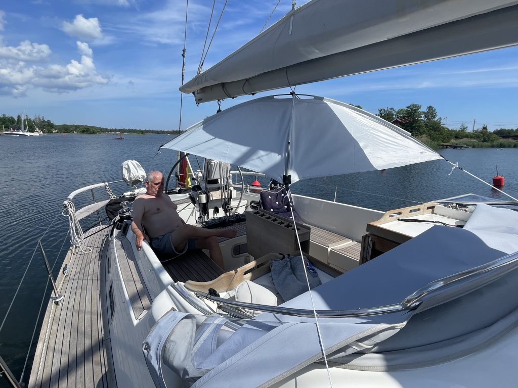 Die Windvorhersage für den nächsten Tag deckt sich mit unserem Plan, hier etwas zu bleiben und Kallis Vorhaben, vielleicht doch die Ursache der Getriebe-Abschaltung zu ergründen. Nach einiger Suche hat er einen Fachmann in Göteborg ausfindig gemacht und probiert nach Absprache mit ihm diverses aus: mal hier was abschrauben, mal dort etwas hin- und herbewegen… eine kleine Testreihe ohne Motorgeräusch. Aber leider auch ohne eindeutiges und vor Allem befriedigendes Ergebnis.