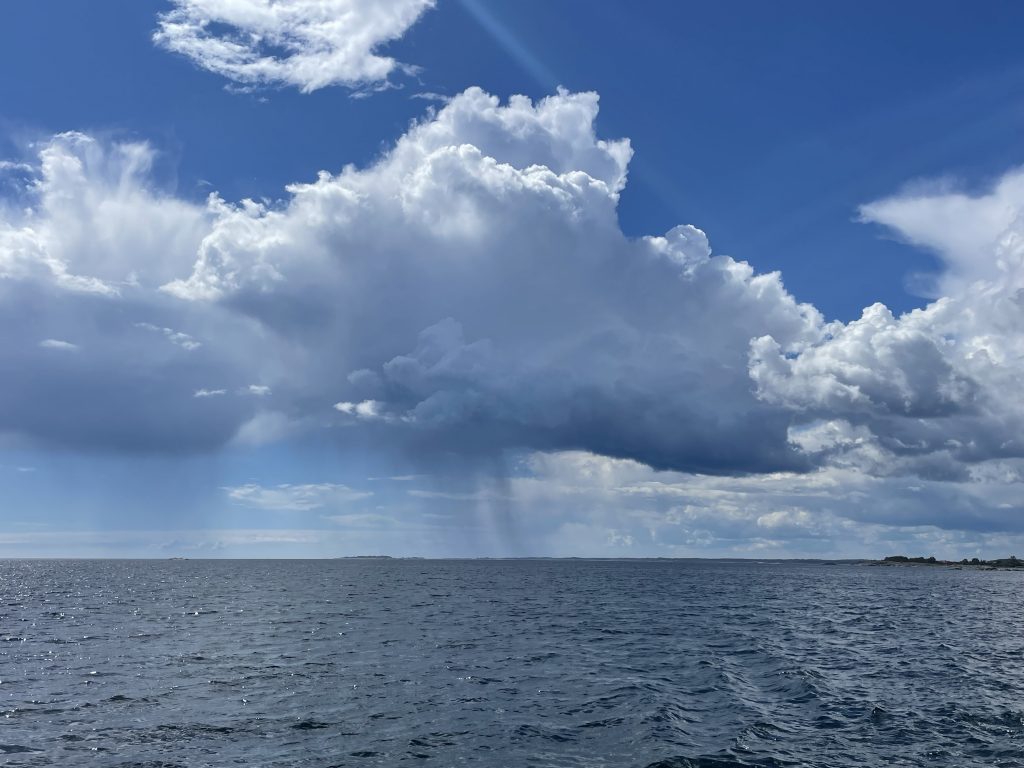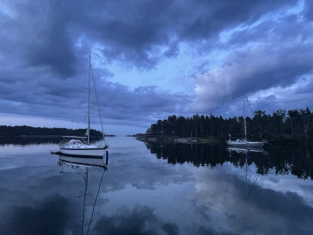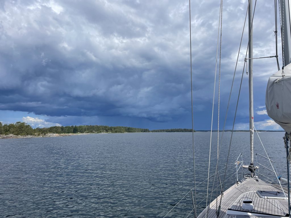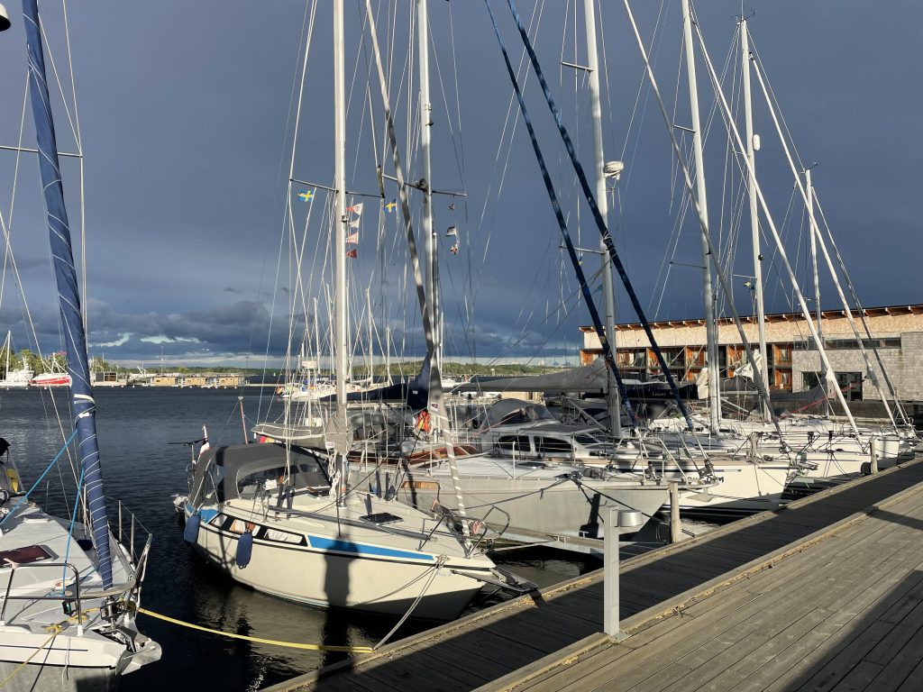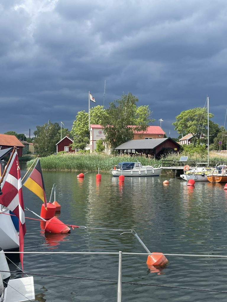 Und dann kommt plötzlich eine Böe nach der anderen… dunkle Wolken und auch einzelne Schauer ziehen über uns hinweg. Offensichtlich hat es das durchwachsenen regnerische Deutschland-Wetter jetzt auch an die Ostschwedische Küste geschafft. Wäre nicht notwendig gewesen. Das geplante abendliche Grillen muss ausfallen. Wir schaffen grad noch einen leckeren Rotwein auf der Pier vor dem nächsten Schauer. Man beachte: Rotwein. Den trinken wir lieber bei kälteren Aussentemperaturen. Und so ist es auch: der kräftige Wind hat ordentlich kalte Luft mitgebracht… abends muss die Heizung im Schiff für angenehme Temperaturen sorgen. Und die kurze Hose wandert erstmal wieder in den Schrank.