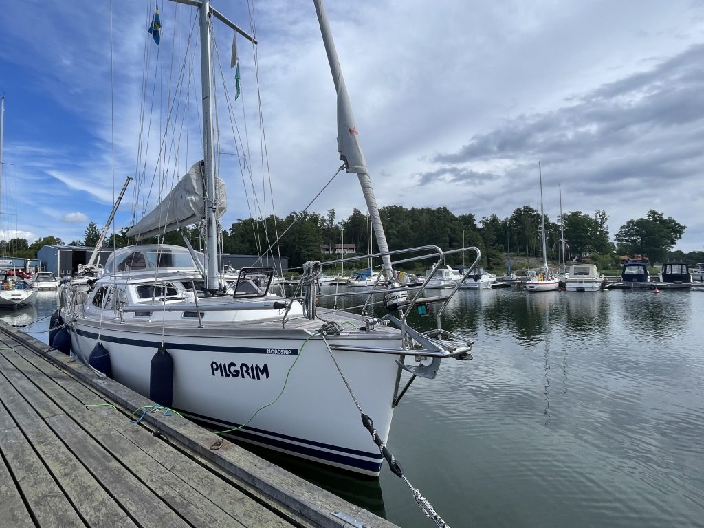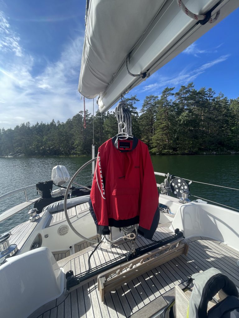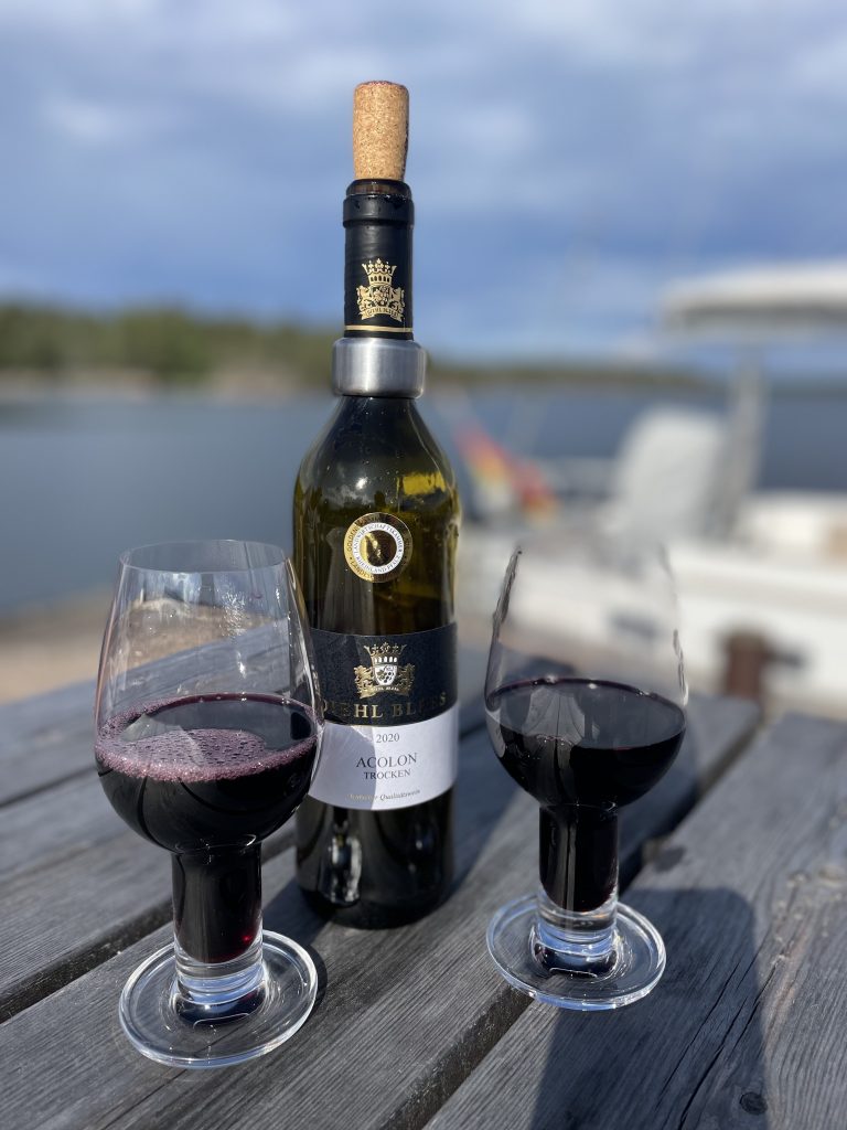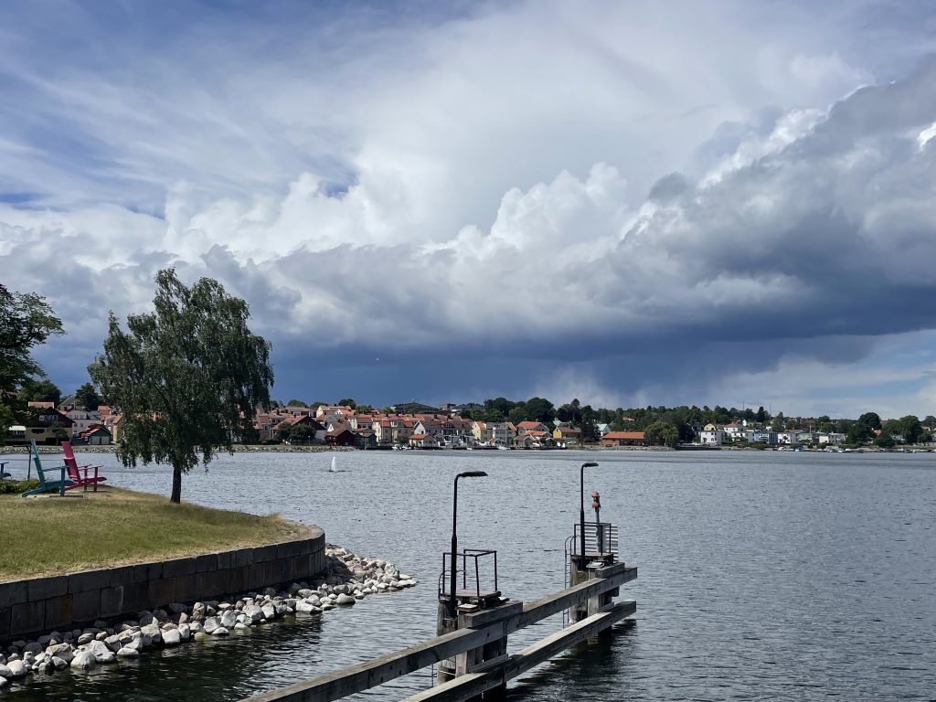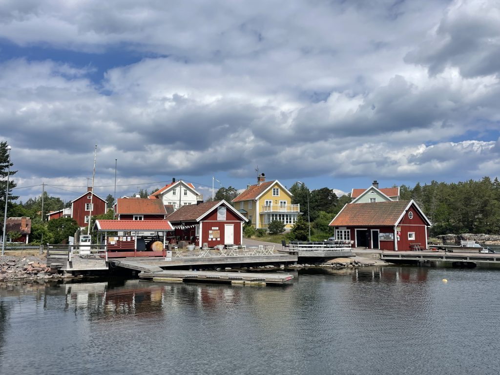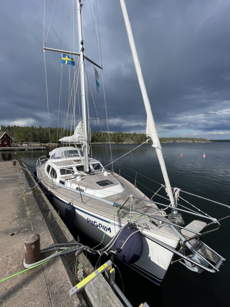 Und dann kommt plötzlich eine Böe nach der anderen… dunkle Wolken und auch einzelne Schauer ziehen über uns hinweg. Offensichtlich hat es das durchwachsenen regnerische Deutschland-Wetter jetzt auch an die Ostschwedische Küste geschafft. Wäre nicht notwendig gewesen. Das geplante abendliche Grillen muss ausfallen. Wir schaffen grad noch einen leckeren Rotwein auf der Pier vor dem nächsten Schauer. Man beachte: Rotwein. Den trinken wir lieber bei kälteren Aussentemperaturen. Und so ist es auch: der kräftige Wind hat ordentlich kalte Luft mitgebracht… abends muss die Heizung im Schiff für angenehme Temperaturen sorgen. Und die kurze Hose wandert erstmal wieder in den Schrank.