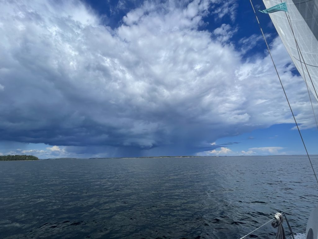 Wir überlegen hin und her… schaffen wir es vorweg… warten wir unterwegs irgendwo ab und lassen den Regen durch… drehen wir um? Wenn es denn nur Regen wäre… Doch dann der erste Blitz… der erste Donner. Und die Wolken werden immer düsterer und bilden eine langgestreckte dunkle Wolkenwalze aus, die sich üblicherweise vor dem Herannahen von heftigen Einzel-Gewittern oder Gewitterfronten ausbildet. Gewitter muss nun wirklich nicht sein. Da mögen wir nicht durchfahren. Und den mit so einer Wolkenwalze (auch Böenwalze genannt) aufkommenden heftigen Wind möchten wir nicht unvorbereitet erleben: also Segel eingeholt, umgedreht und ein Stück zurückgefahren. Unterwegs ziehen wir schon mal die Regenjacken an, denn dem Gewitter ausweichen ist das Eine, doch dem Regen können wir nicht mehr ausweichen. Unterwegs hatten wir sowohl eine Anlegeboje als auch einen kleinen Pier gesehen, die uns bestimmt für 1-2 Stunden beherbergen. Doch als wir auf die Boje zufahren, mach just in dem Moment jemand dran fest. Der will auch lieber das Gewitter durchlassen und nicht weiterfahren. Tja… kann nicht alles klappen. Und beim Anfahren der Pier zeigt sich, dass an ihrem Ende dicht unter Wasser ein großer Felsen liegt. Nun gut, dann eben nicht.