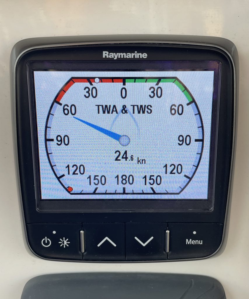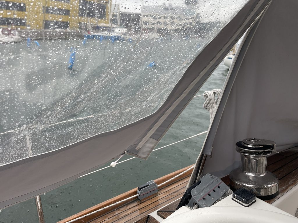 Und dann geht das Geschunkele so richtig los… bis zu 30 Knoten Wind (7 Bft) im Hafen bringen das sonst so ruhige Hafenwasser in Wallung und die Schiffe alle ordentlich in Bewegung. Sogar von der kleinen Inselfähre wird erhöhte Aufmerksamkeit und zusätzliche Motorpower gefordert. Alle Crews schauen nochmal nach ihren Leinen. Scheuert nichts? … ist der Abstand zum Nachbarn ausreichend? … hängen die Fender richtig? … sollte vielleicht eine Leine verstärkt werden? … Was hatten wir ein Glück, dass wir gestern im Restaurant das tolle Wetter genießen konnten, heute fliegt man von der Terrasse.